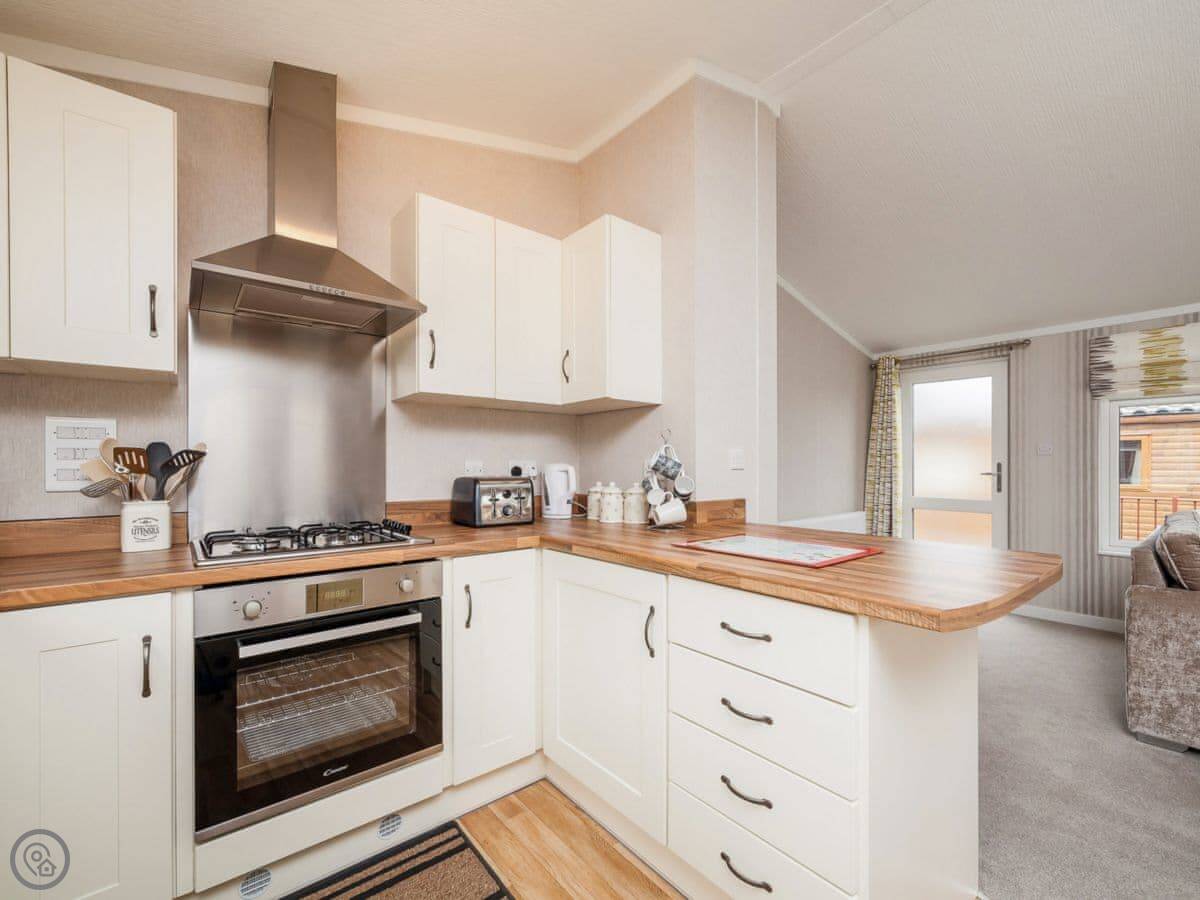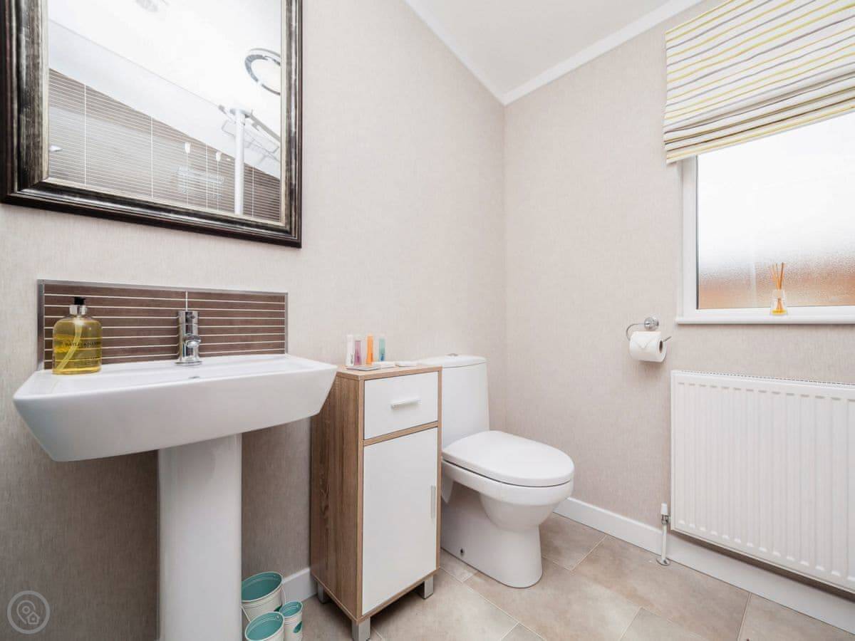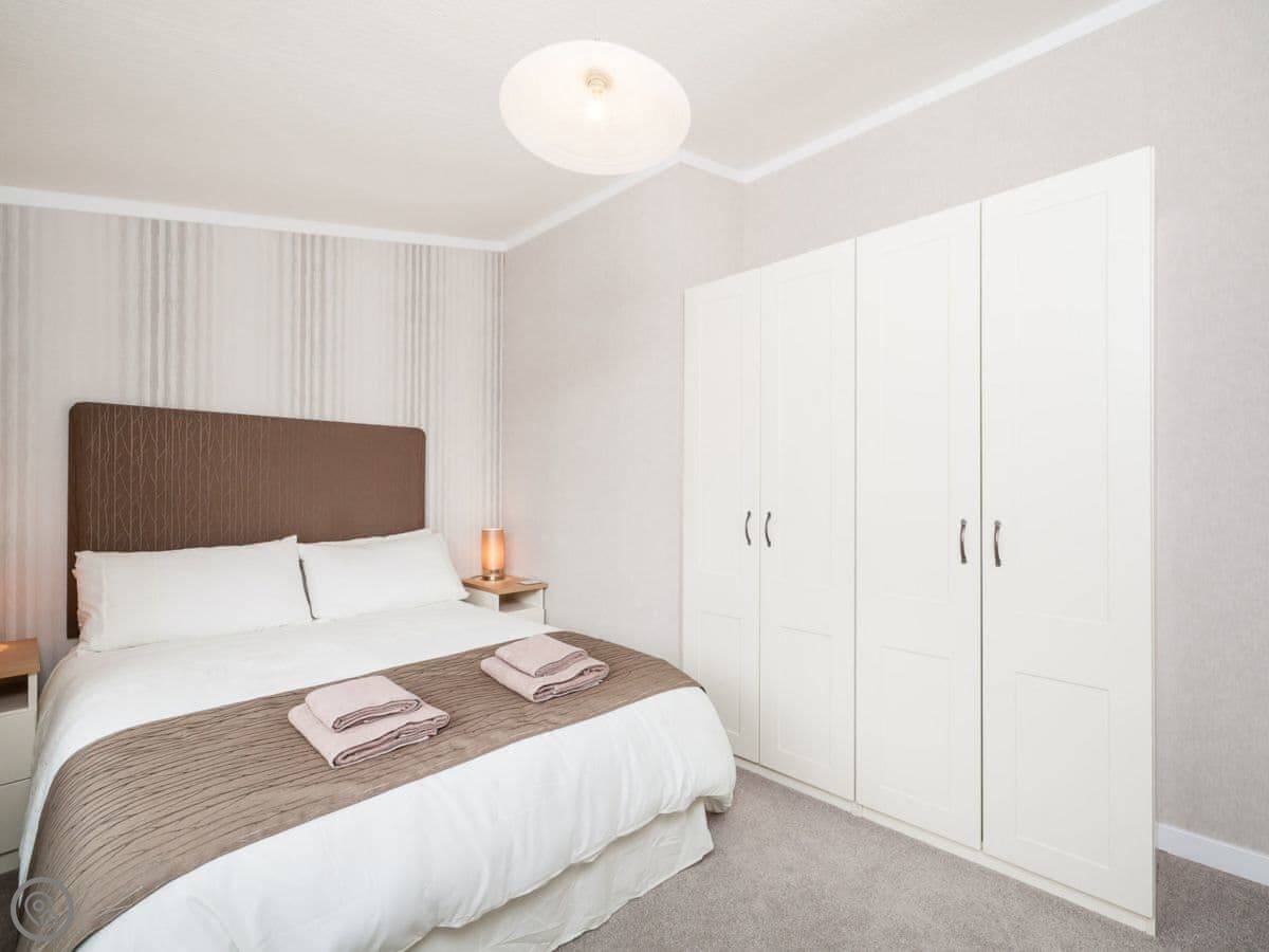 It sleeps four. Two bedrooms, both with their own shower rooms. One double, one twin. The main living space has big windows and patio doors out to a decked area. It gets a lot of light. The garden is enclosed.