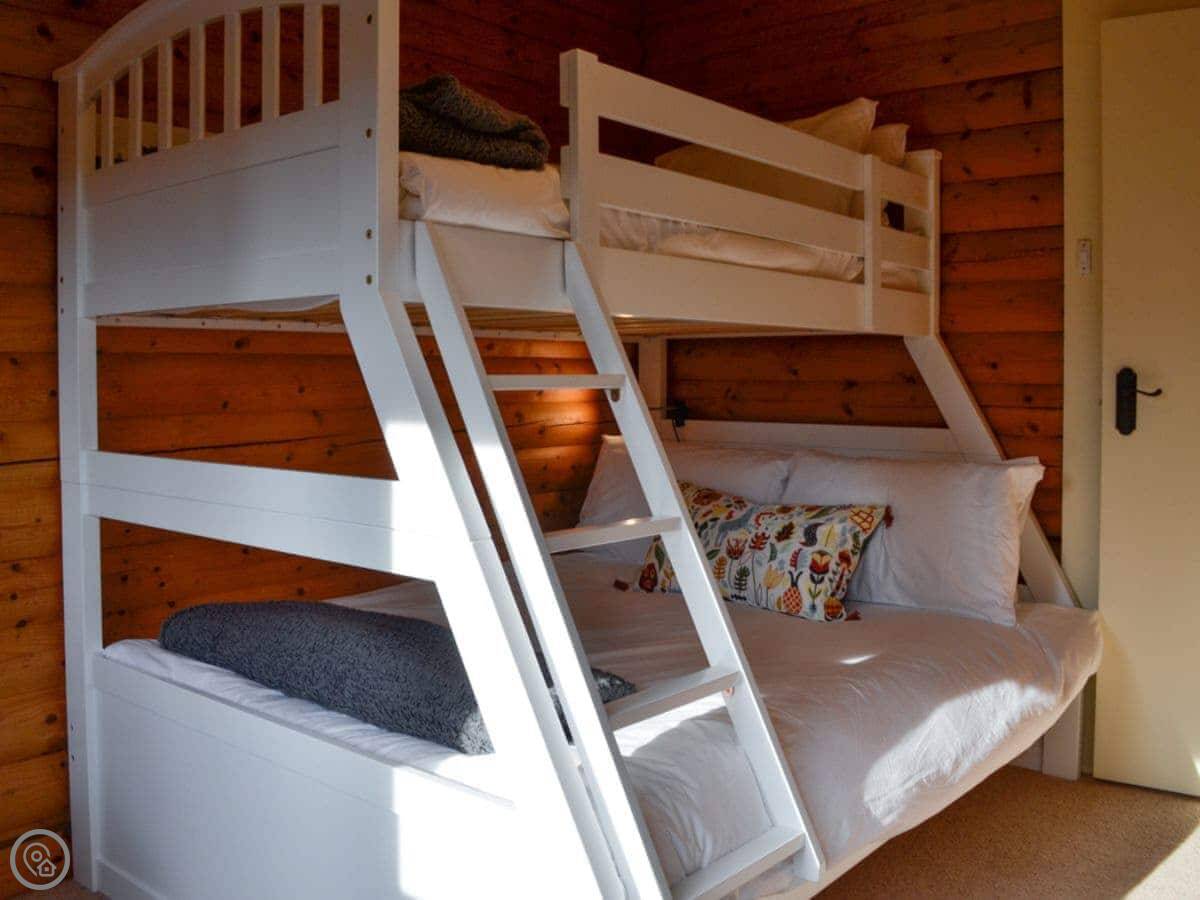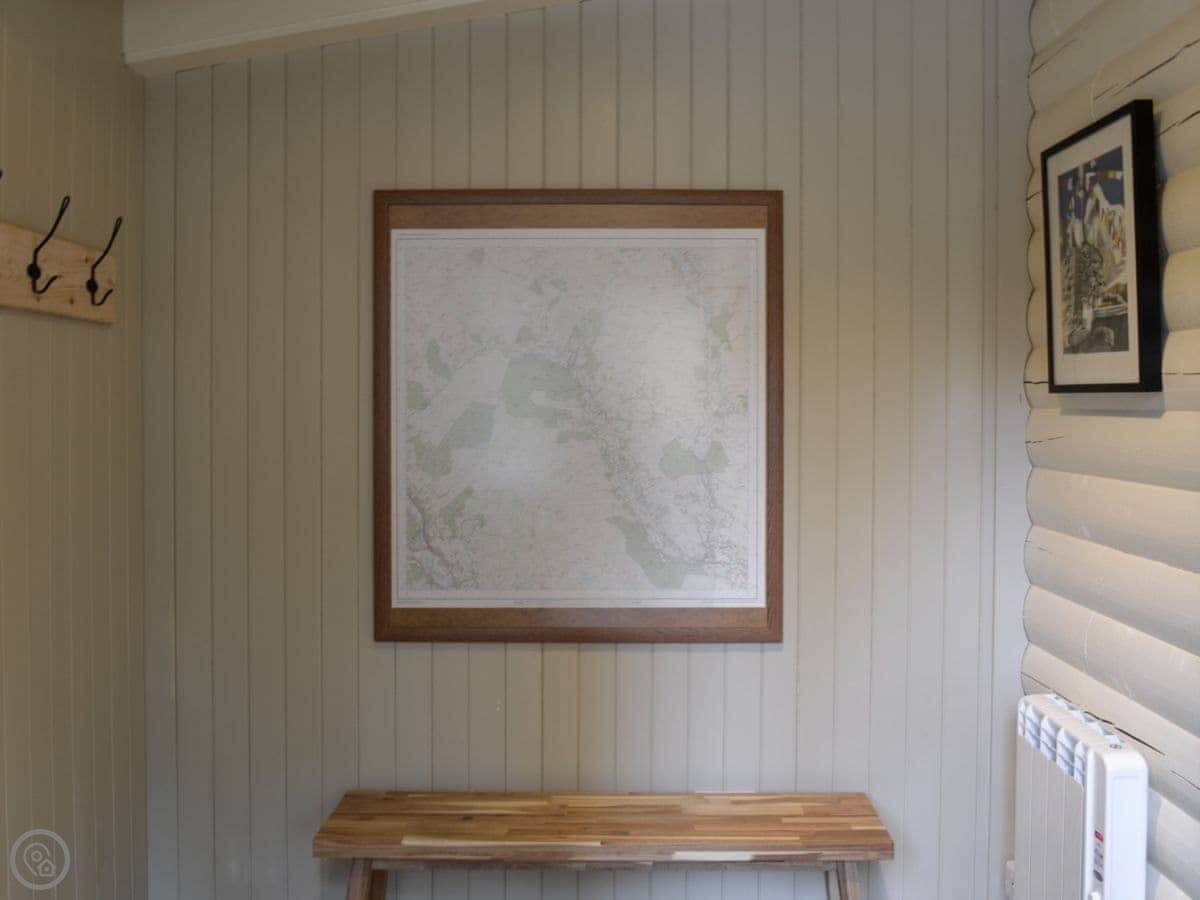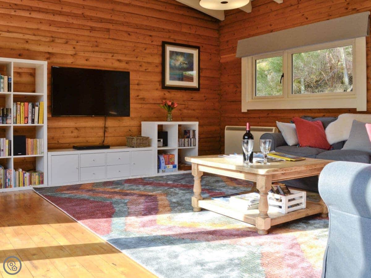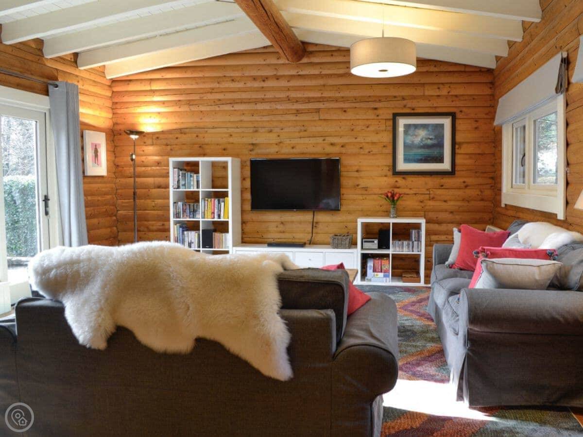 It's a 4 Star place, so it's comfortable and well-equipped. It's a wooden cabin, so the walls are all pine inside. The main room has a high ceiling and a wood burner. The doors open out onto a deck and the garden.