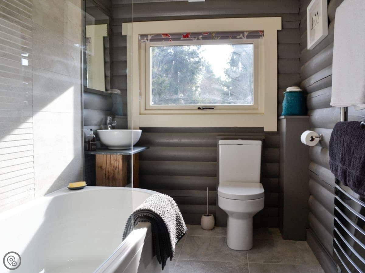 Glen Hideaway is a log cabin near Kirkmichael, in Perthshire. It's got a grass roof so it kind of blends into the hillside. It sleeps four, in two bedrooms. Both bedrooms have their own bathroom, which is handy.