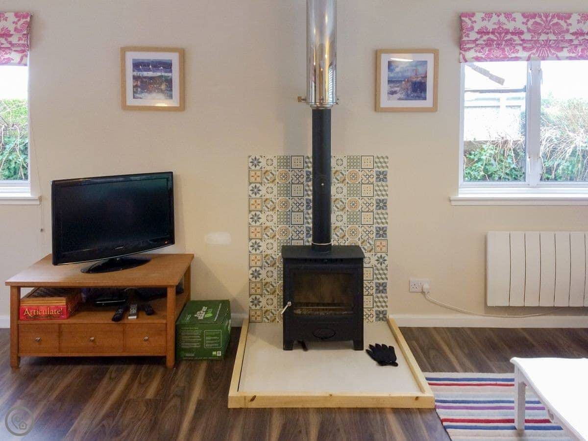 The place has a woodburning stove for cooler evenings. There's a dishwasher, washing machine, WiFi, and parking. Bedding and towels are included. You can bring up to two dogs.