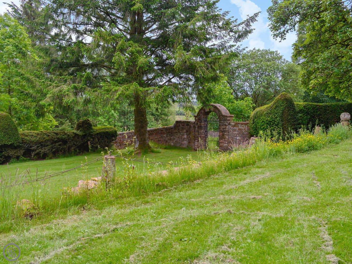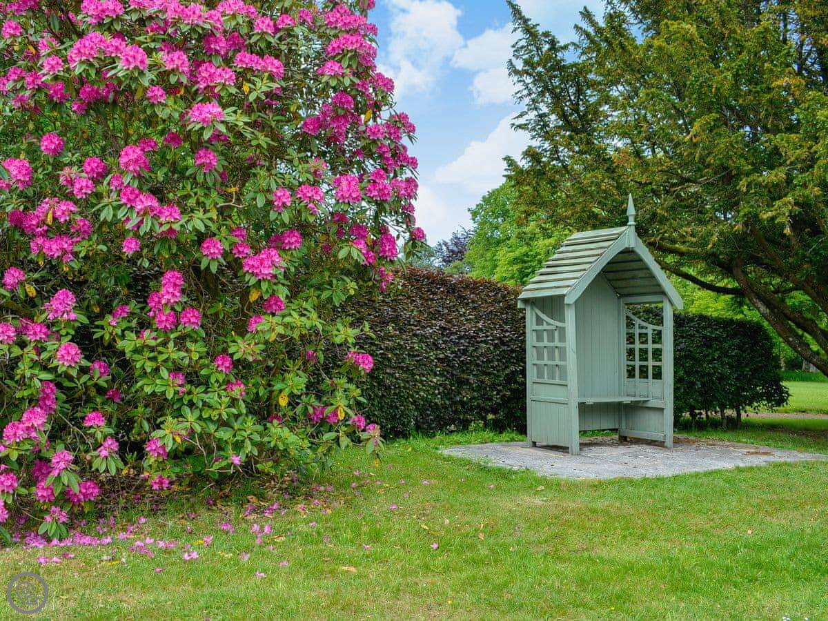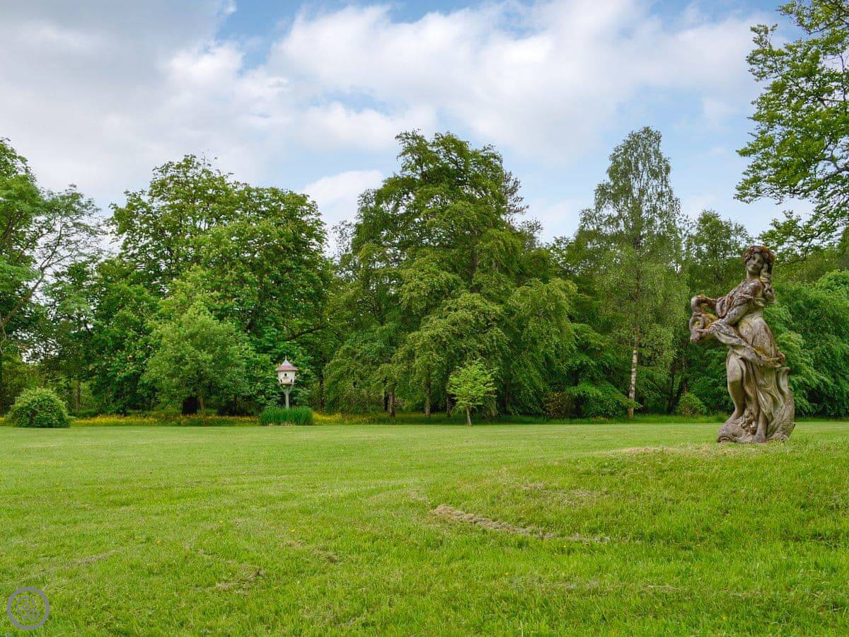 You're up a flight of external stone stairs to get in. The apartment looks out over the estate gardens, which you're welcome to walk around. There's a refurbished summerhouse you can use too. The Victorian stables below are interesting if you like that sort of thing, the owner can show you.