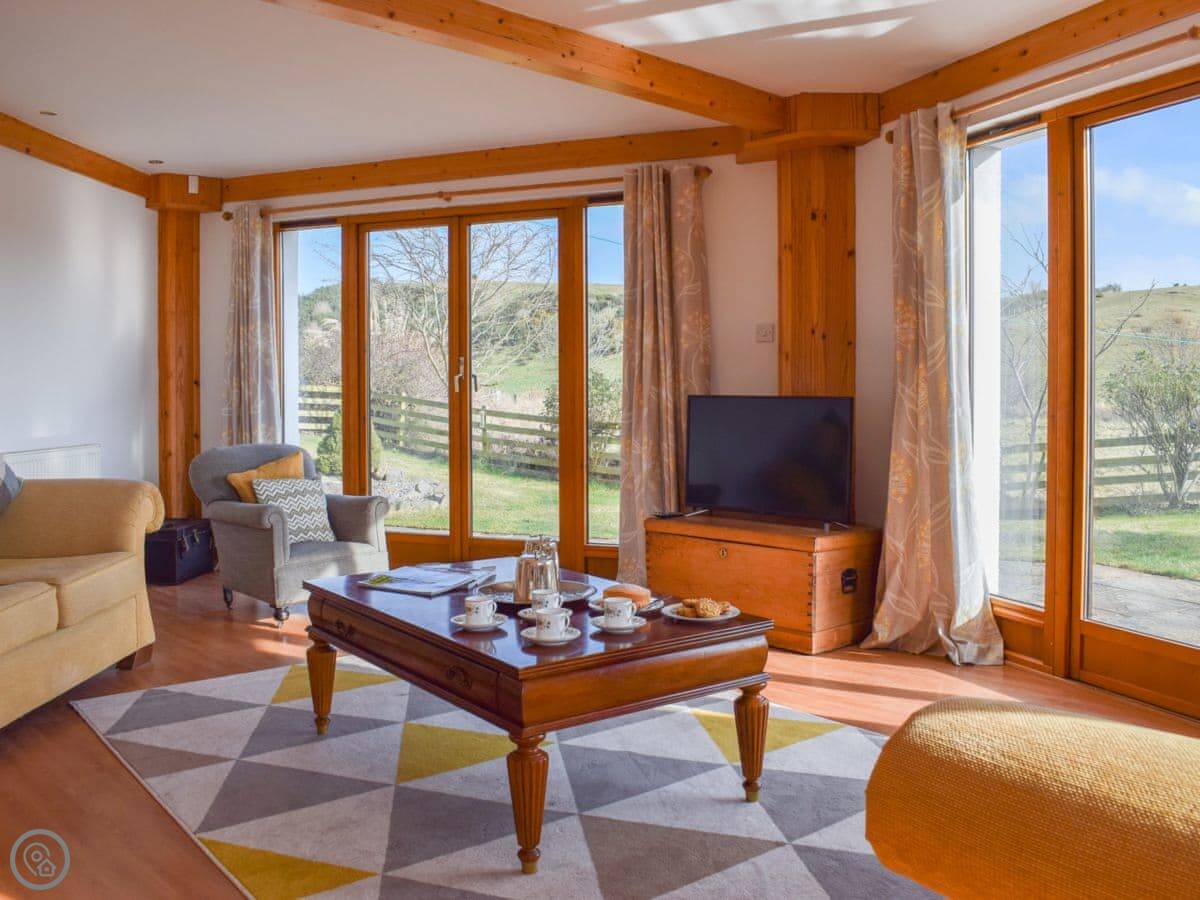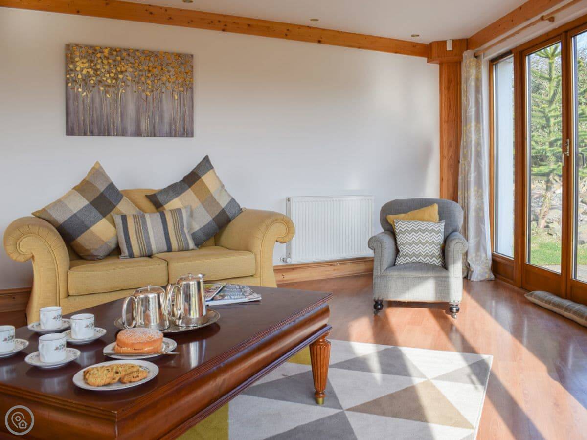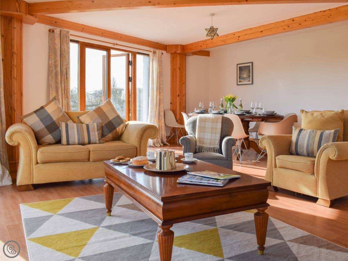 It sleeps eight. Four bedrooms, three bathrooms. It's got a 4 Star rating, so it's comfortable and well equipped. The main living room has patio doors out to the garden. The garden is enclosed, which is good if you've got kids or dogs. You can fit two cars on the drive.