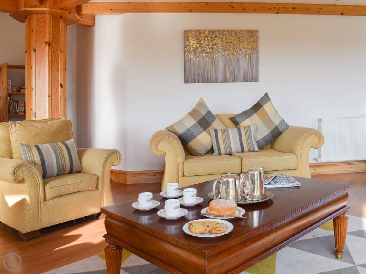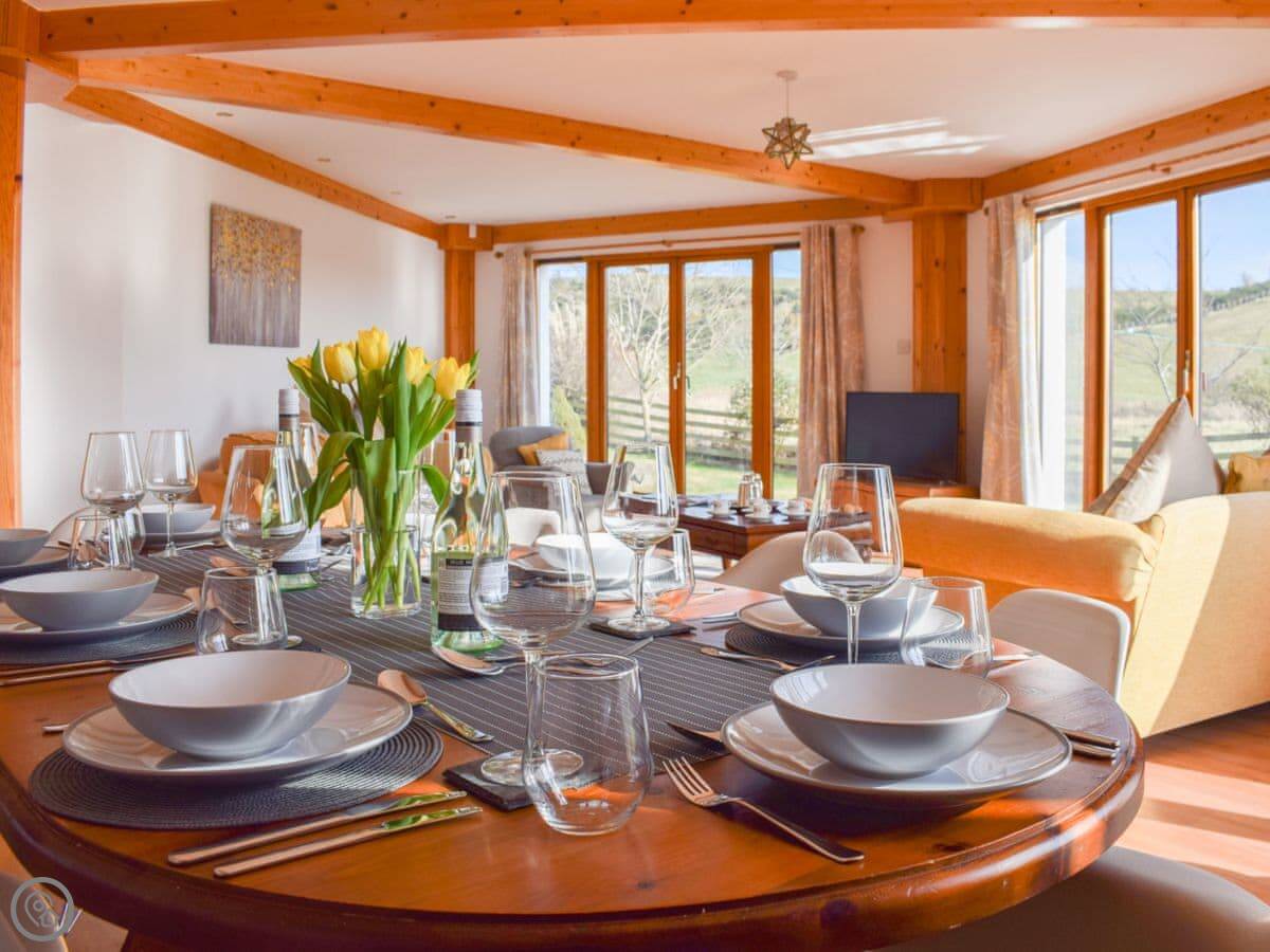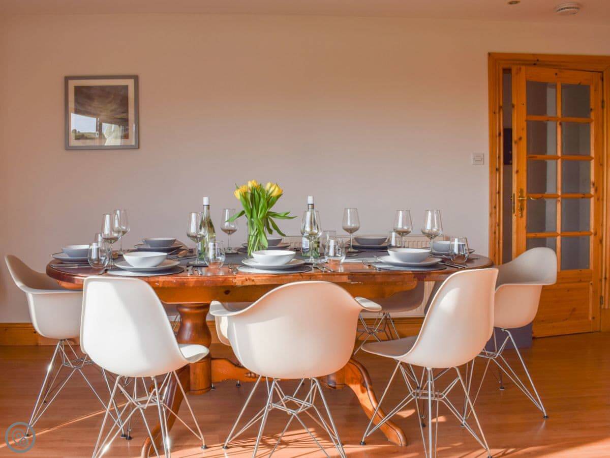 It sleeps eight. Four bedrooms, three bathrooms. It's got a 4 Star rating, so it's comfortable and well equipped. The main living room has patio doors out to the garden. The garden is enclosed, which is good if you've got kids or dogs. You can fit two cars on the drive.