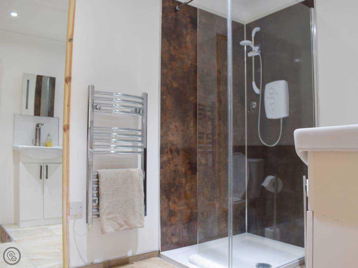 Inside, it's open plan. There's a washing machine, WiFi, and a TV. Bedding and towels are included. We can put a cot or highchair in if you need one. If you want a bottle of something or some basics in the fridge for when you arrive, just let me know beforehand and I'll sort it, you just pay for the goods.