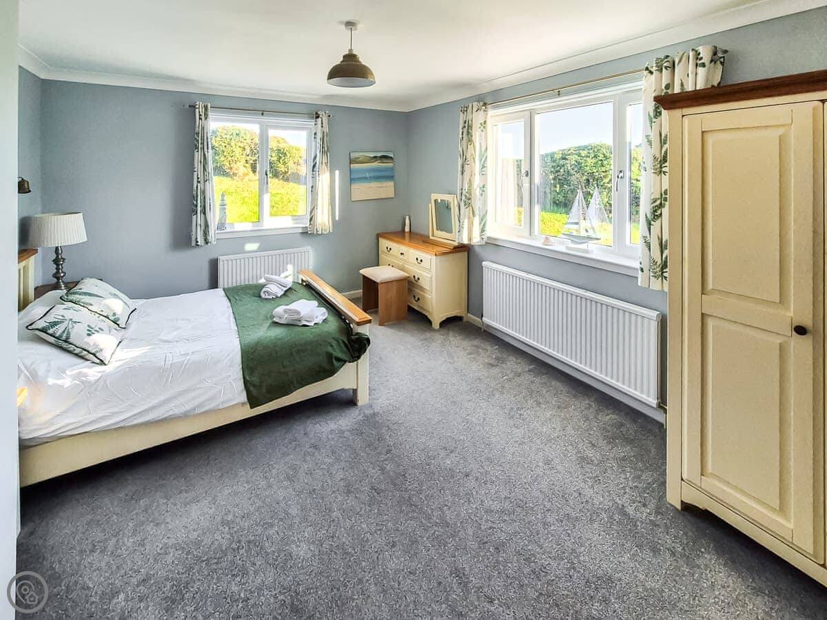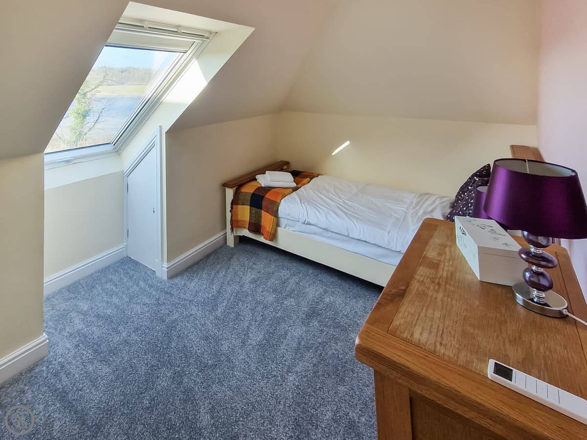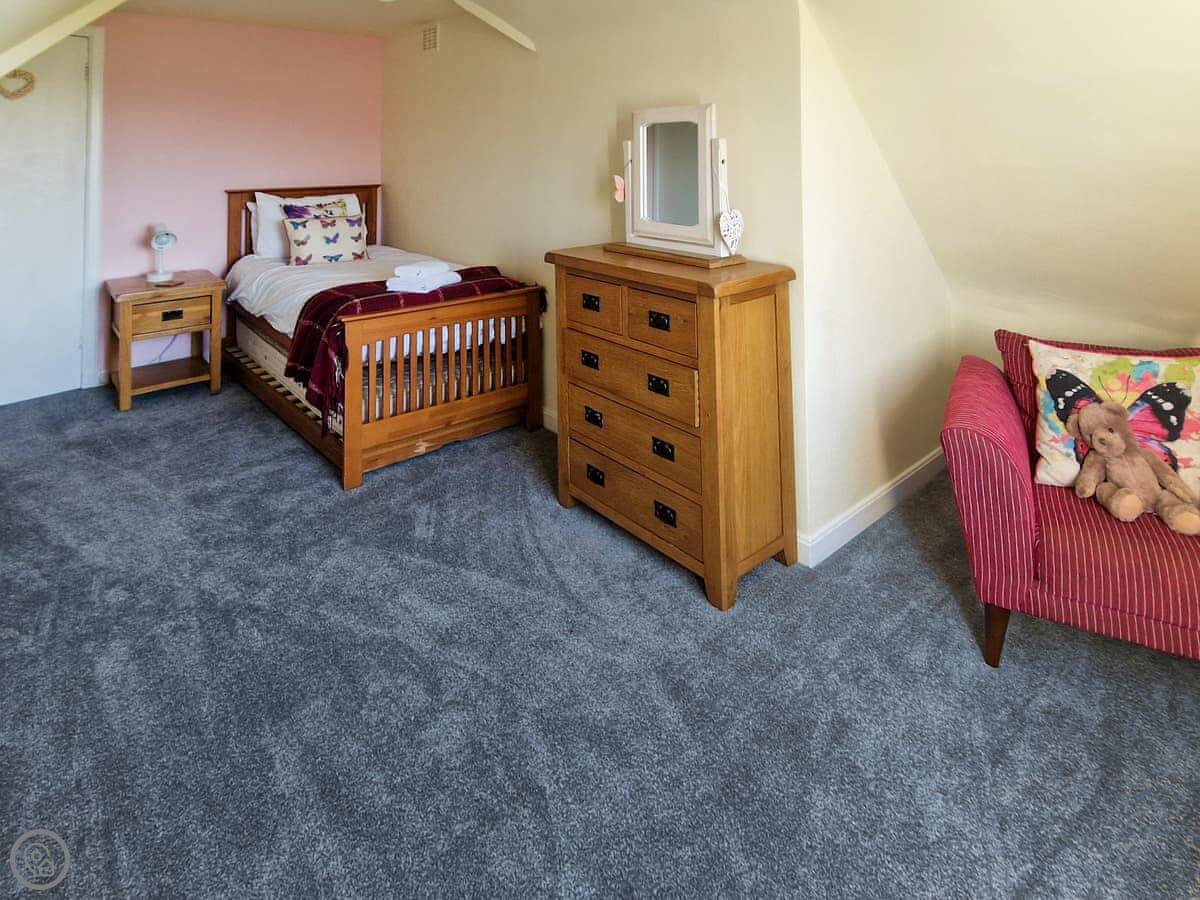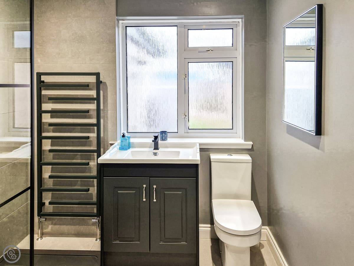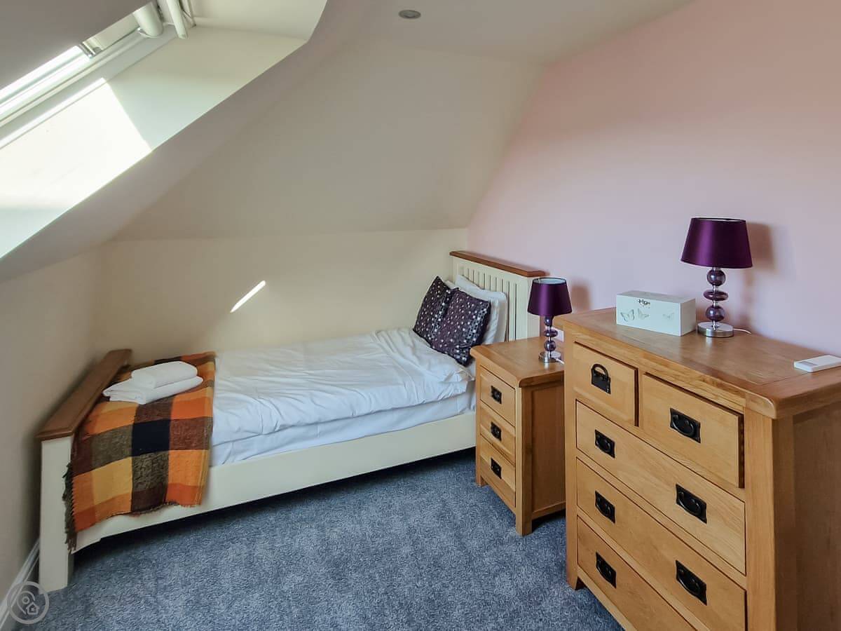 It sleeps nine people in five bedrooms. There are two bathrooms, one is a wet room on the ground floor. It's got a 4 Star rating. It's comfortable, not luxurious.