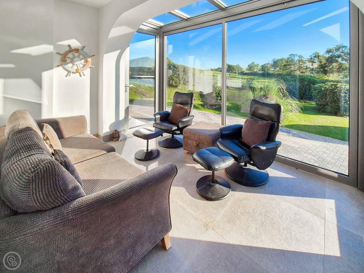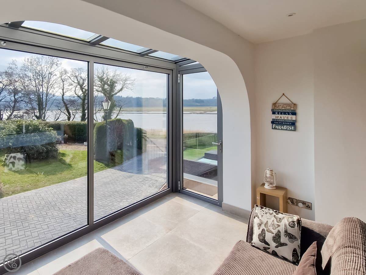The kitchen is big and leads into the dining area, so everyone can be together. The living room has windows on two sides. There's a sun room with a lot of glass, which is where you'll probably end up sitting to look at the view.