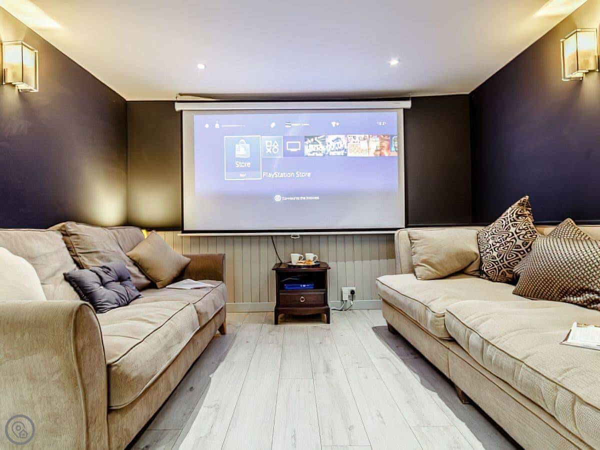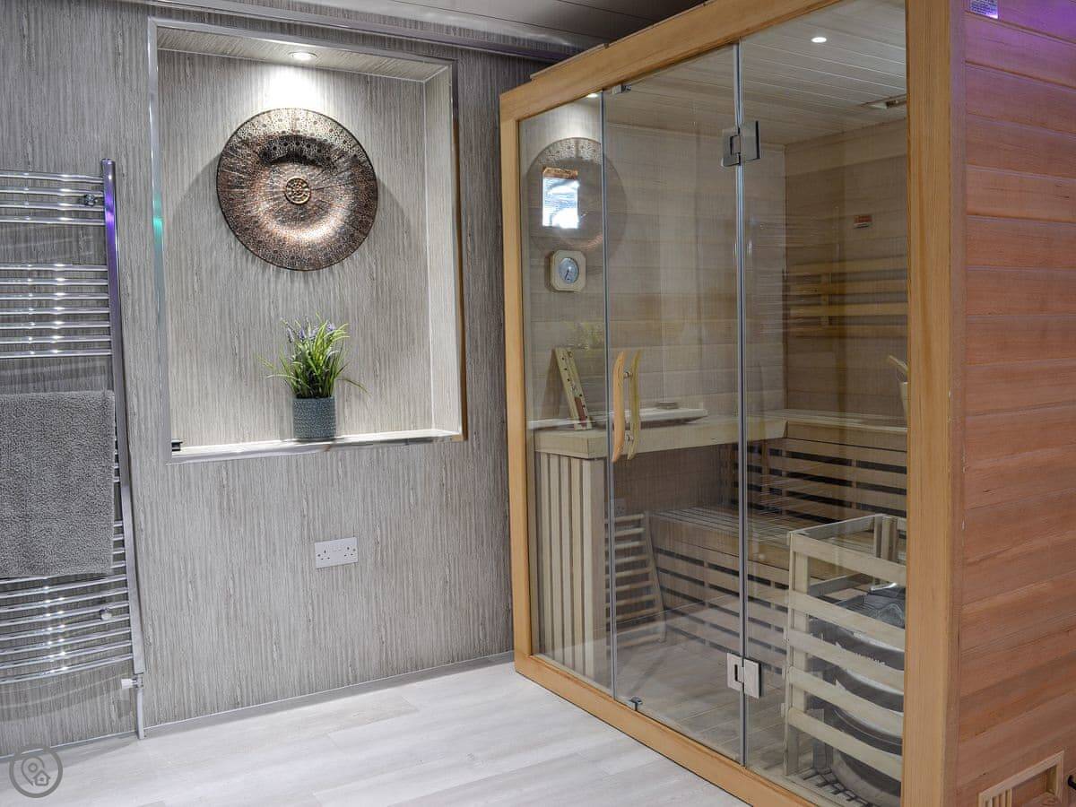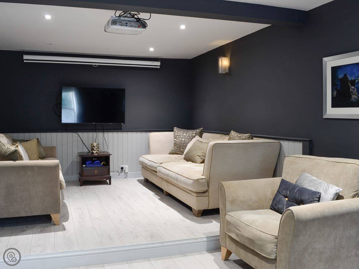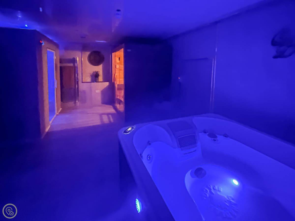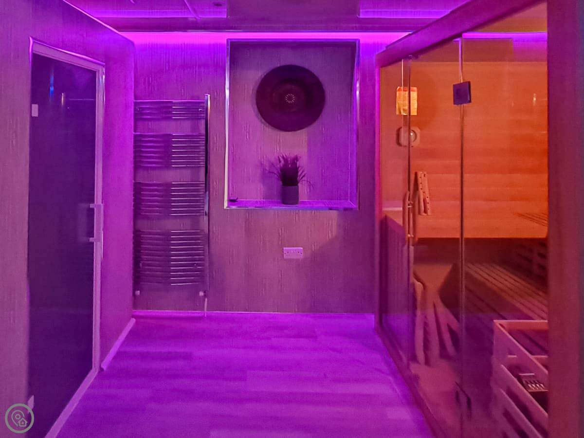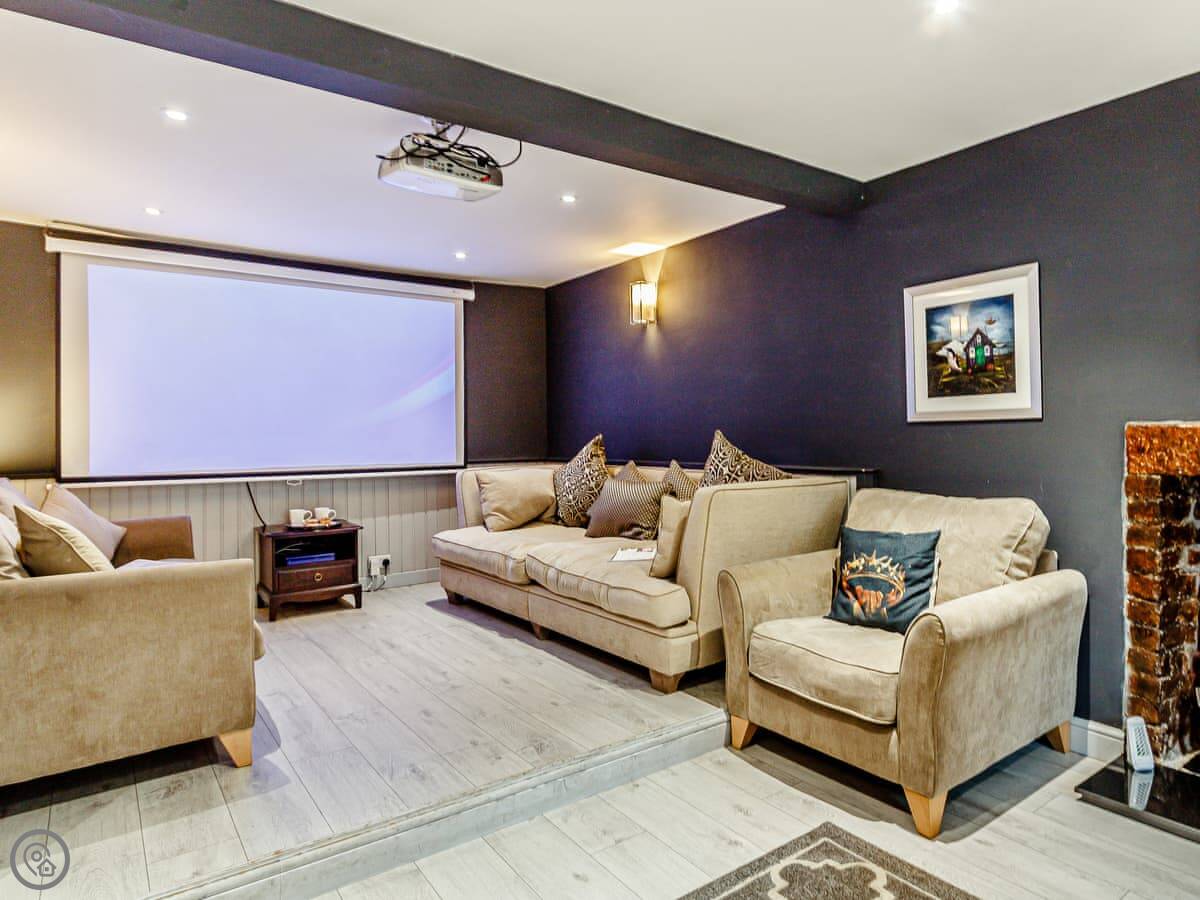 The main thing is, it's set up for groups. There's a hot tub and a sauna outside, and a steam room inside. The lounge has a big cinema screen. You can book catering and spa treatments directly with us beforehand, if you want everything done for you.