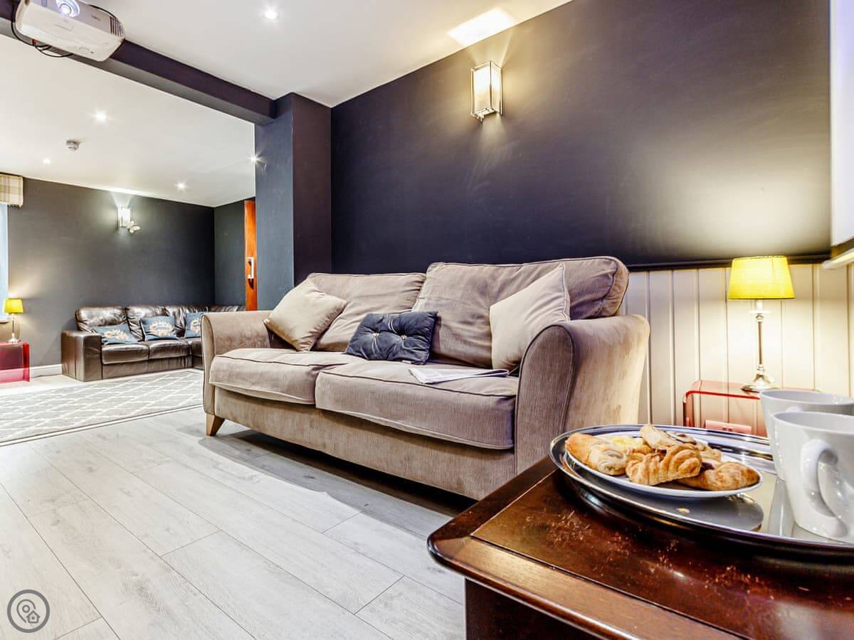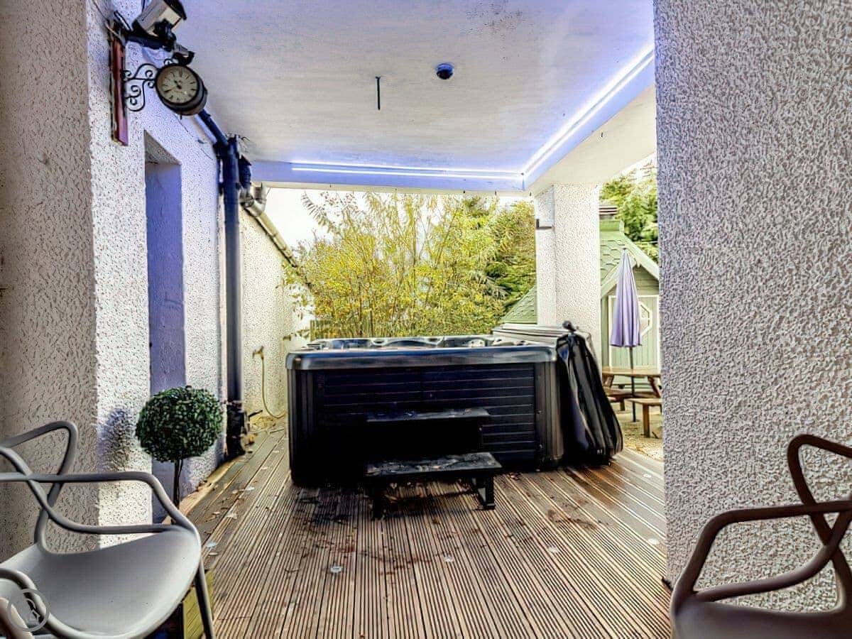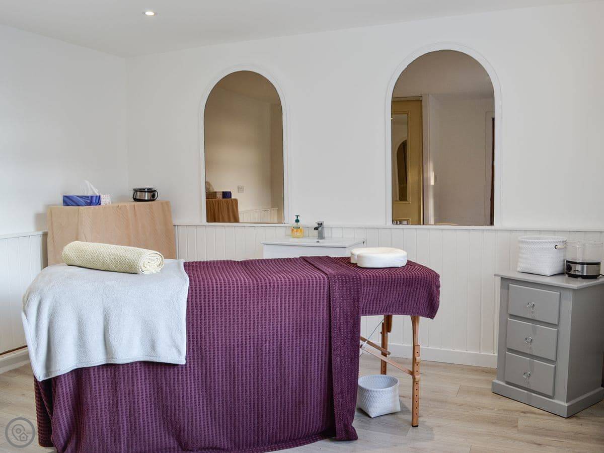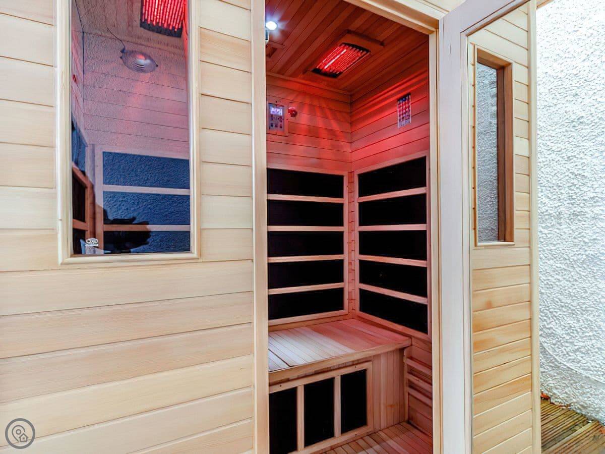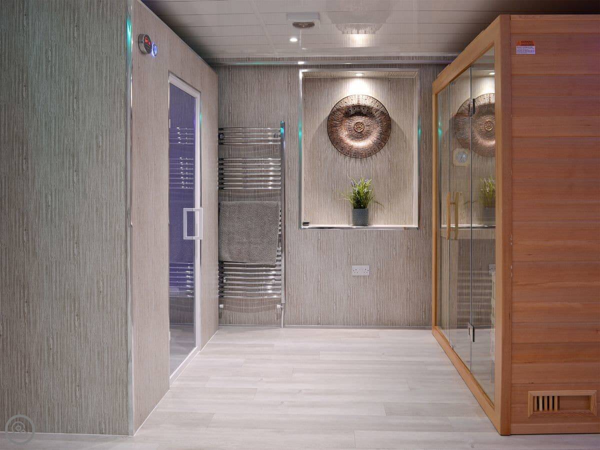 The main thing is, it's set up for groups. There's a hot tub and a sauna outside, and a steam room inside. The lounge has a big cinema screen. You can book catering and spa treatments directly with us beforehand, if you want everything done for you.