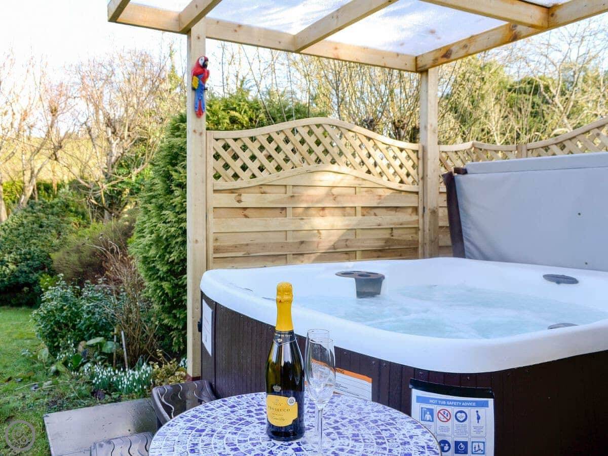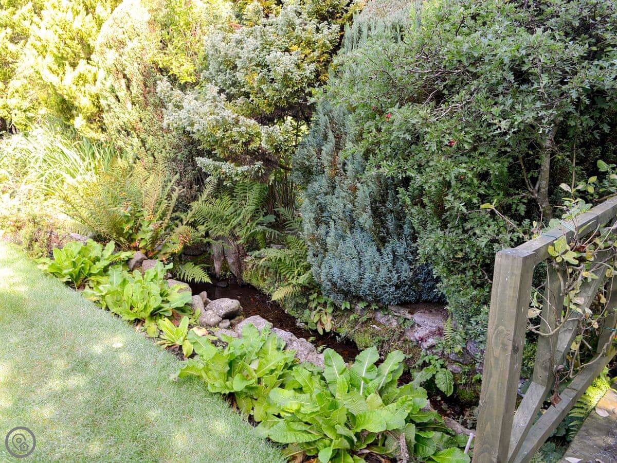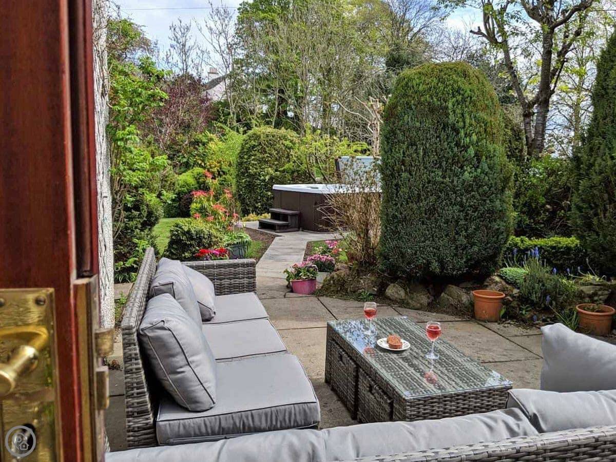 The main thing is the garden at the back. It's quite big and slopes down to a little stream. There's a patio area with a table and chairs, and a hot tub. It gets the sun in the afternoon.