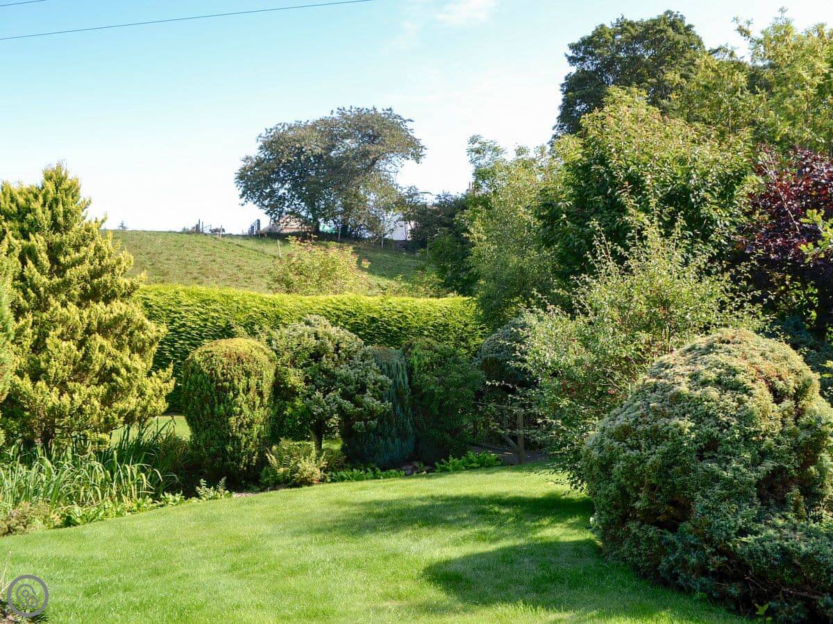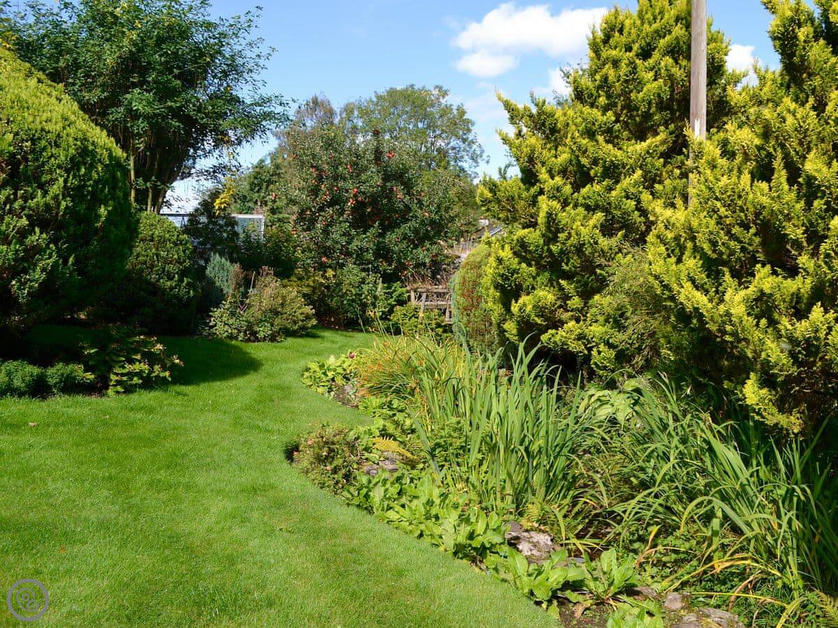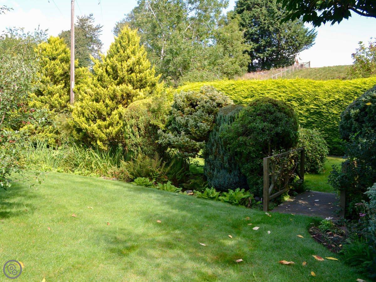 The main thing is the garden at the back. It's quite big and slopes down to a little stream. There's a patio area with a table and chairs, and a hot tub. It gets the sun in the afternoon.