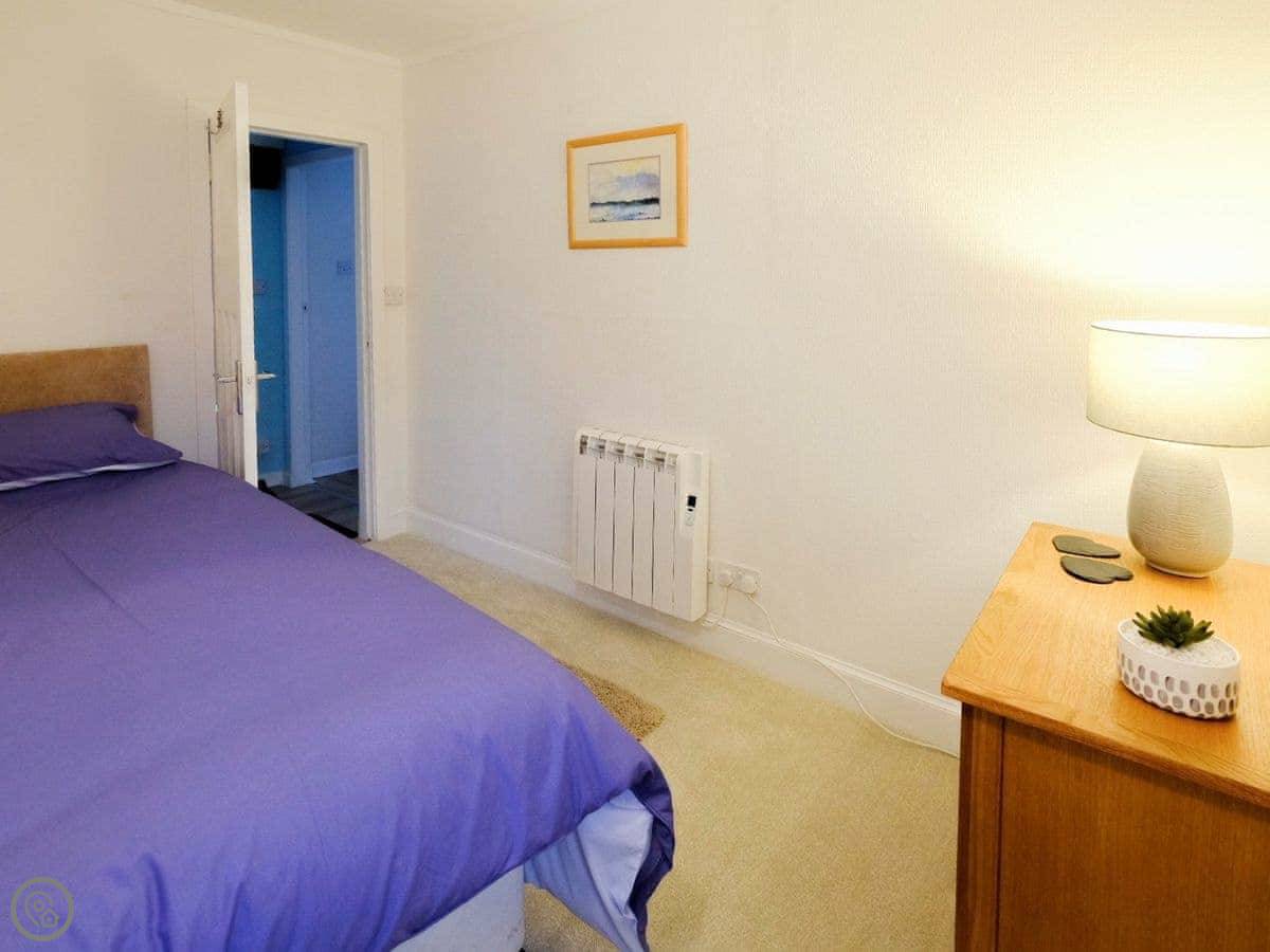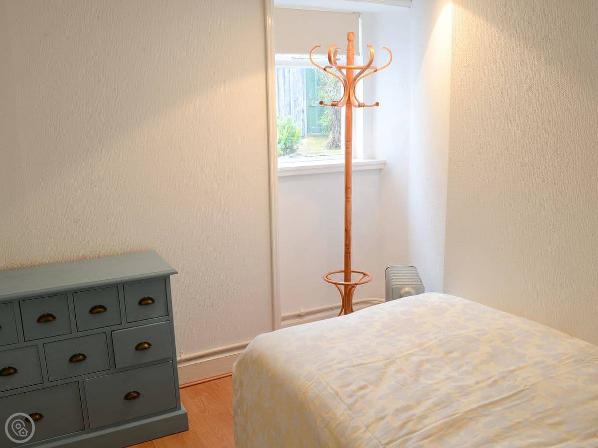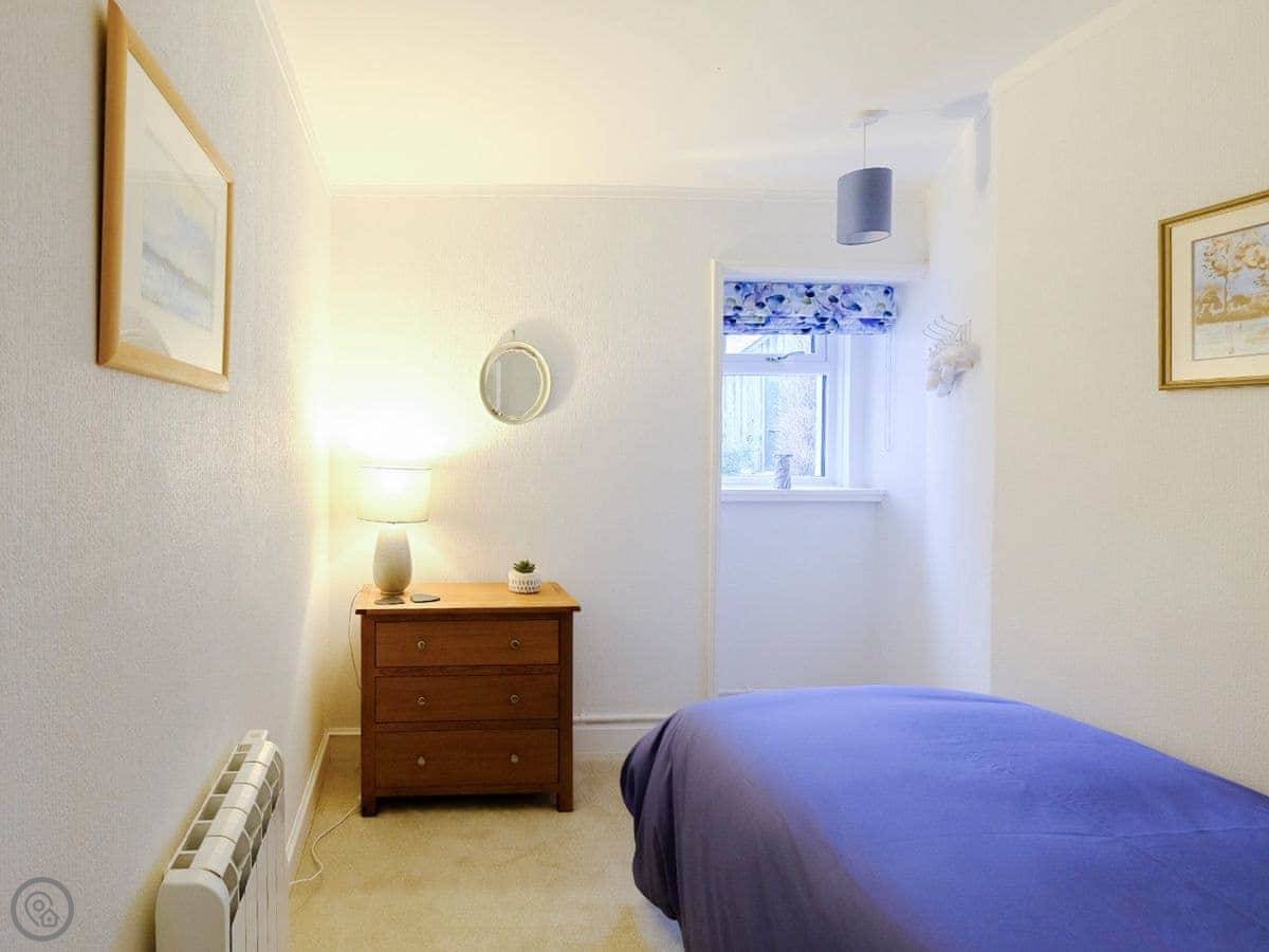 It sleeps three. Two bedrooms, one's a kingsize and the other is a single. One bathroom with a shower over the bath. It's got a 4 Star rating. It's clean and tidy, modern inside but in a traditional shell. The back door opens onto an enclosed garden with a lawn and some shrubs. It's quiet.