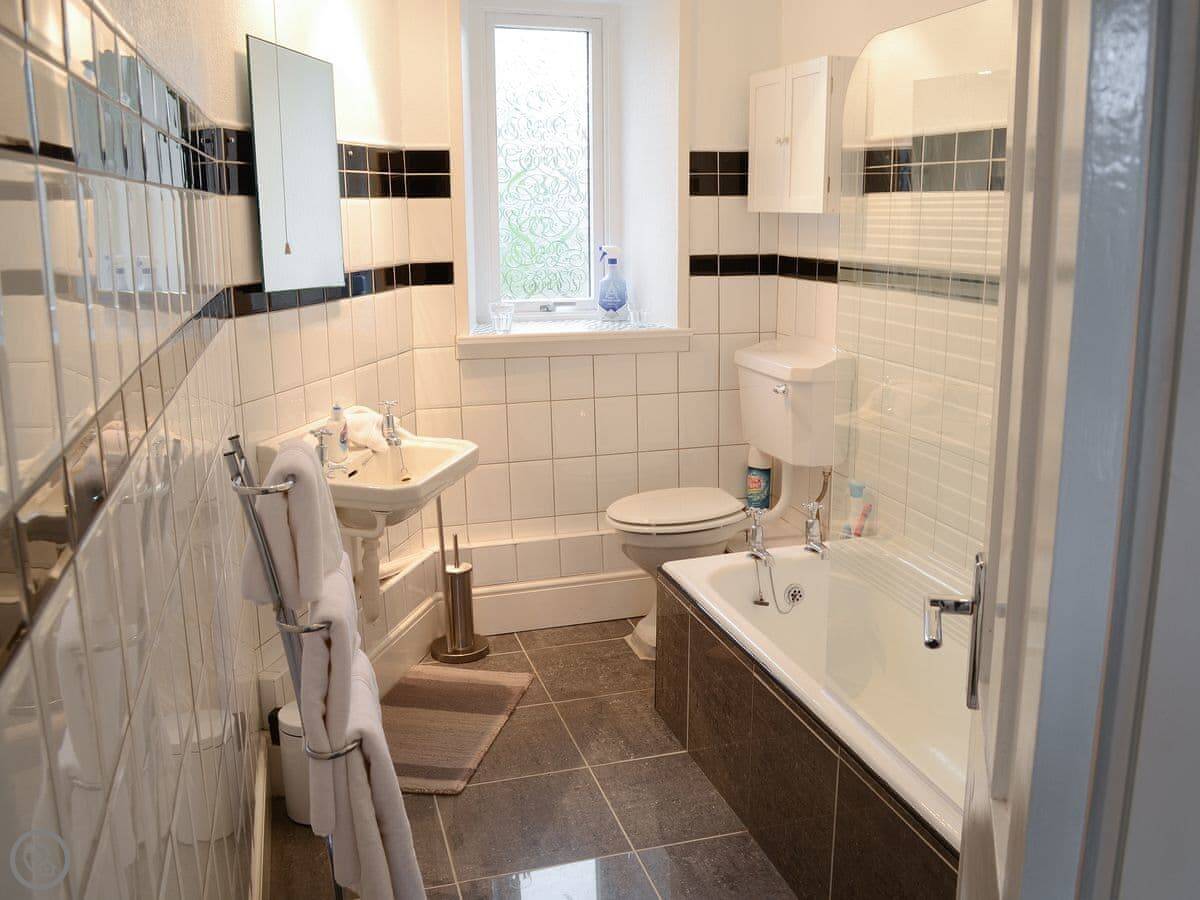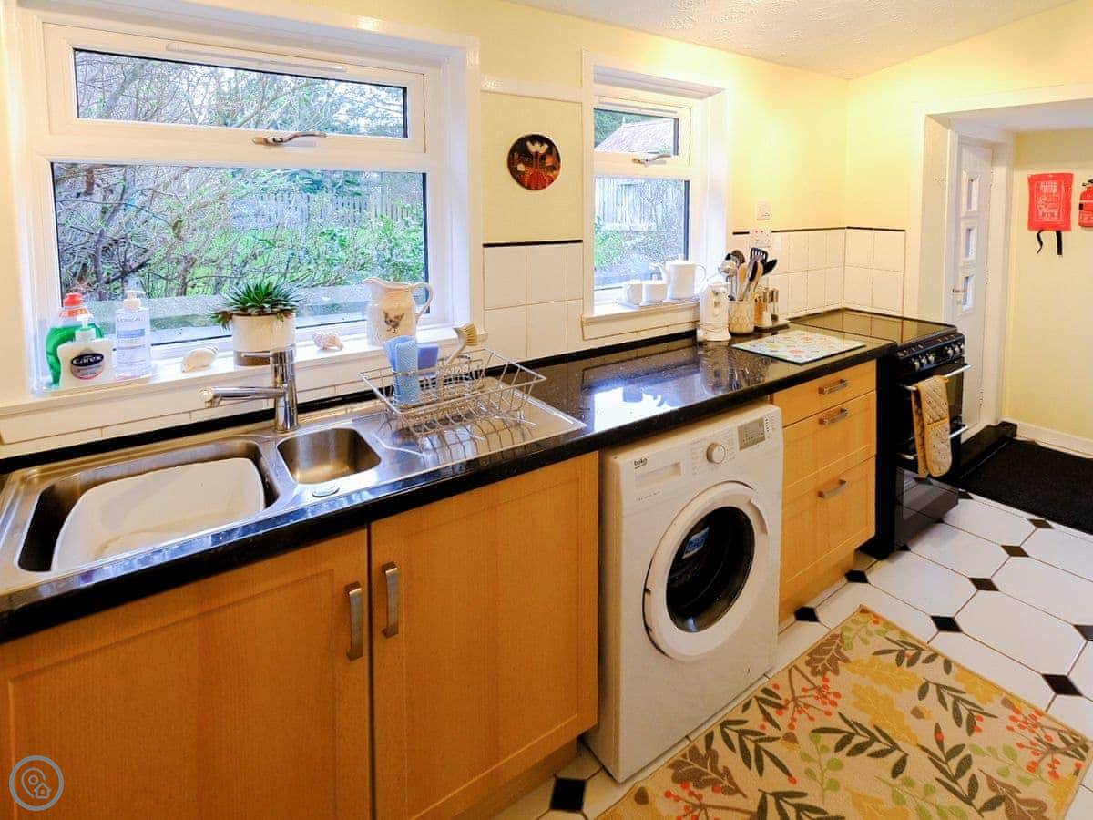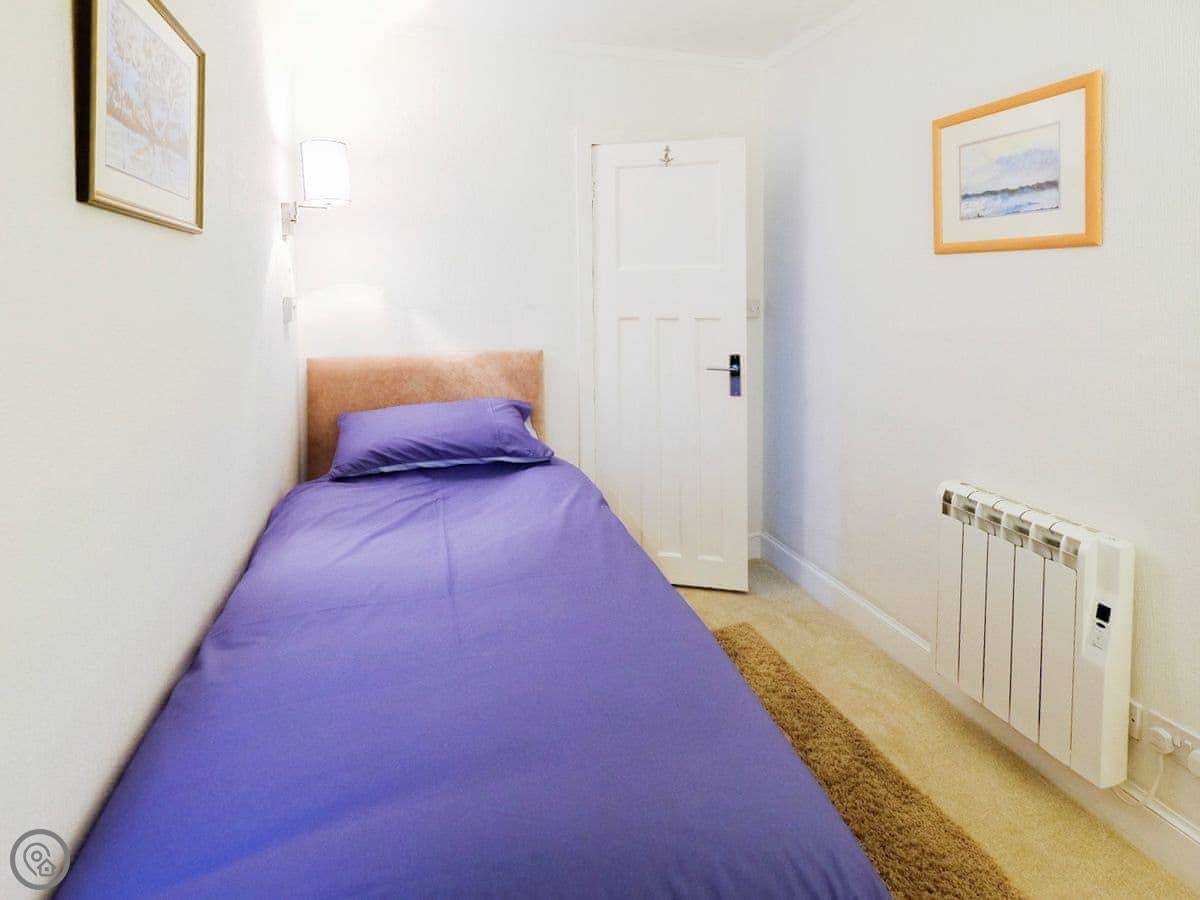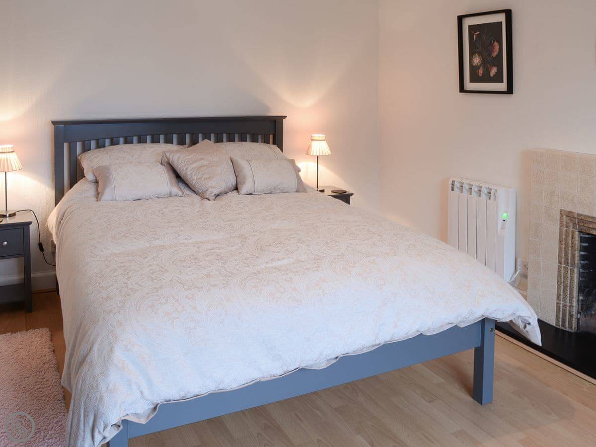It sleeps three. Two bedrooms, one's a kingsize and the other is a single. One bathroom with a shower over the bath. It's got a 4 Star rating. It's clean and tidy, modern inside but in a traditional shell. The back door opens onto an enclosed garden with a lawn and some shrubs. It's quiet.