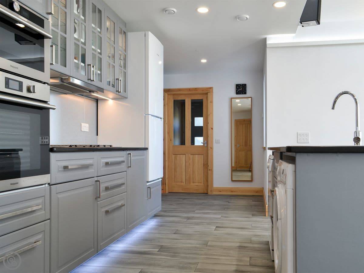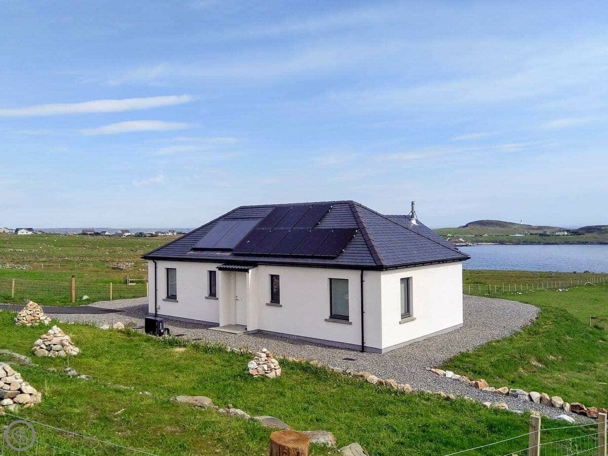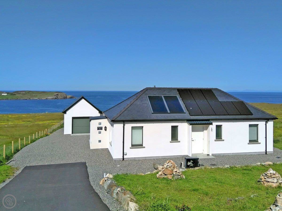 Situated in a unique location, with stunning sea views from the large cathedral window, this detached, architect-designed single-storey house is in a perfect location for exploring the Outer Hebrides. It has gated access to the coastal path through the owner’s croft, and offers modern conveniences such as USB charging sockets in most rooms, wall-mounted TVs and multiple lighting options. The open plan living space has vaulted ceilings and wood plank effect porcelain floor tiles, whilst the kitchen has granite work surfaces, and there is a handy drying room with ceiling mounted pulley dryer, drying shelves and hangers.