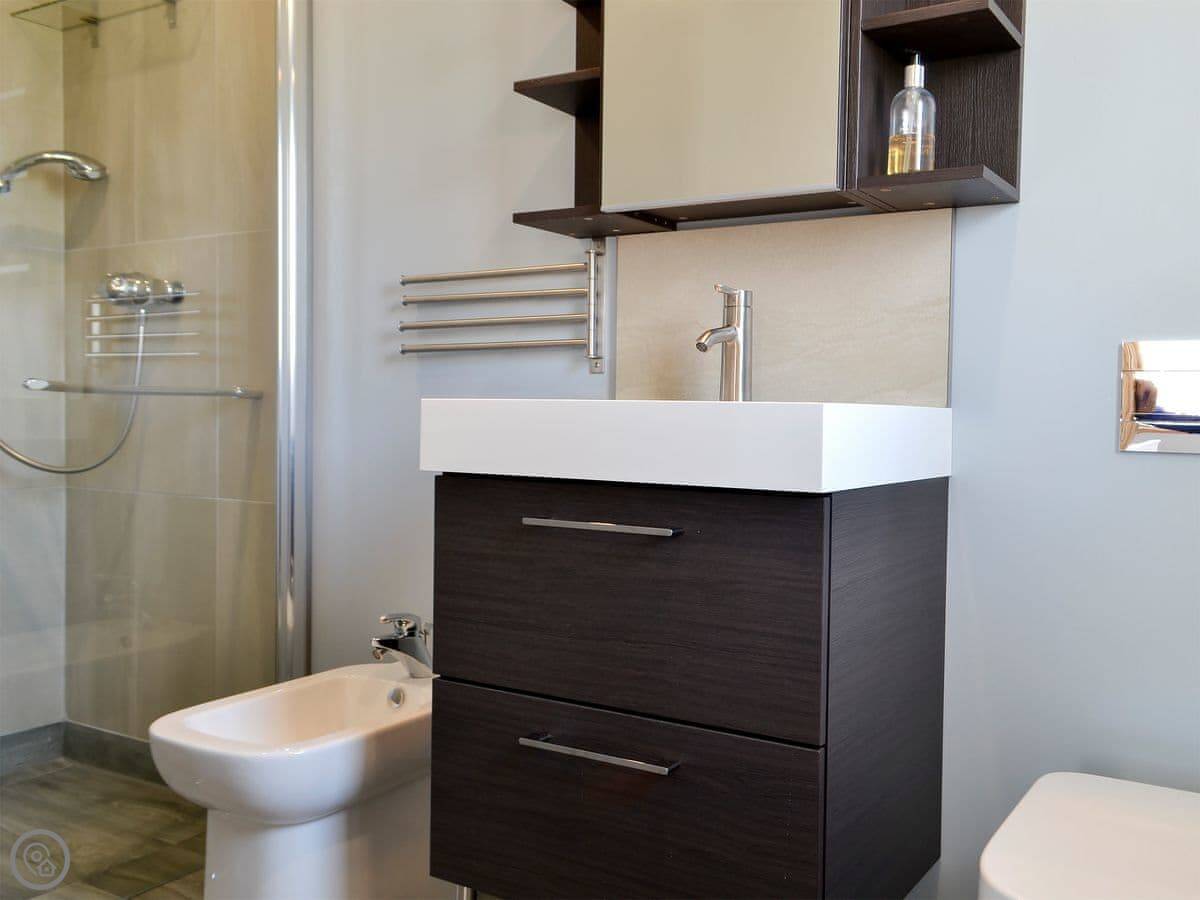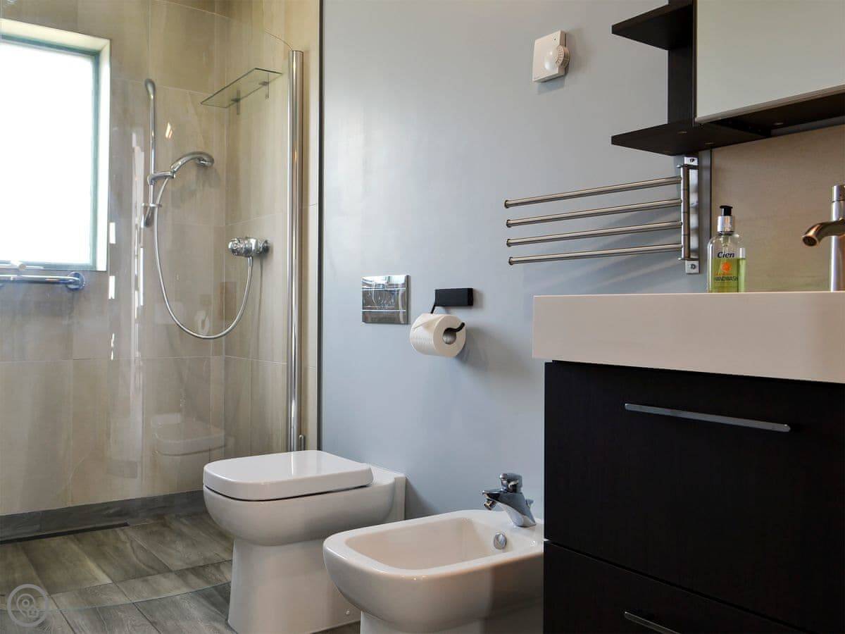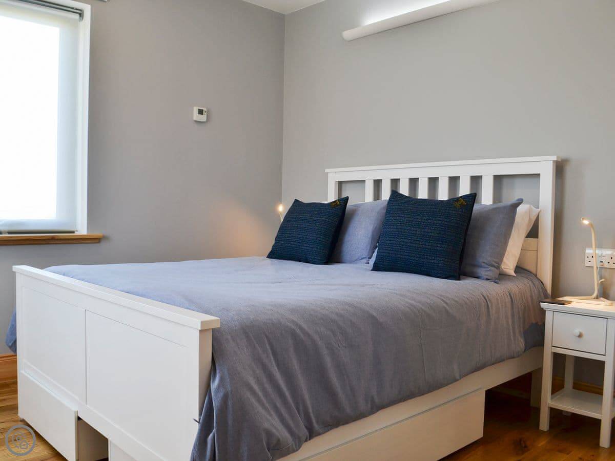Situated in a unique location, with stunning sea views from the large cathedral window, this detached, architect-designed single-storey house is in a perfect location for exploring the Outer Hebrides. It has gated access to the coastal path through the owner’s croft, and offers modern conveniences such as USB charging sockets in most rooms, wall-mounted TVs and multiple lighting options. The open plan living space has vaulted ceilings and wood plank effect porcelain floor tiles, whilst the kitchen has granite work surfaces, and there is a handy drying room with ceiling mounted pulley dryer, drying shelves and hangers.