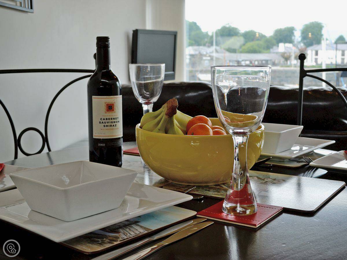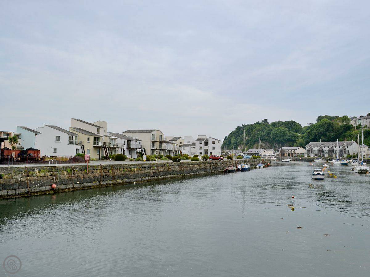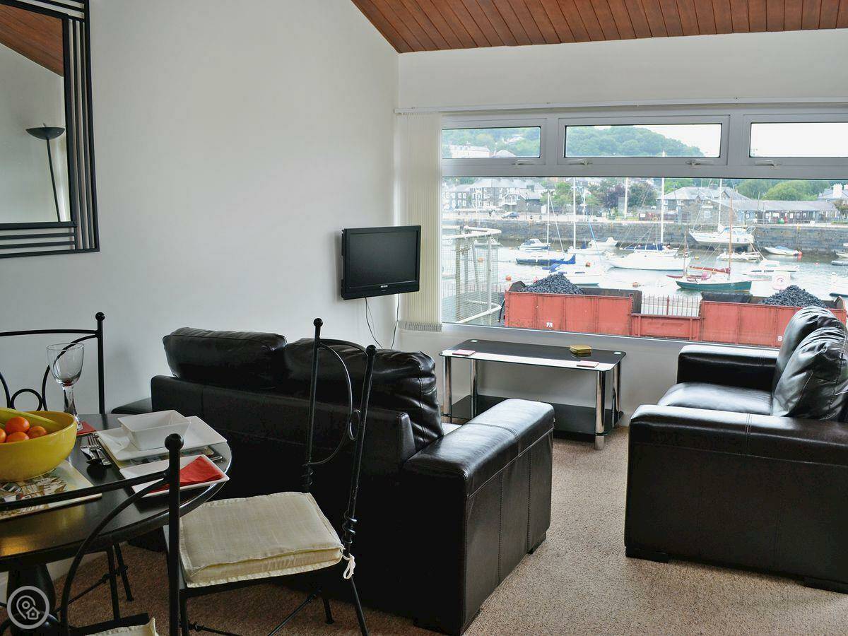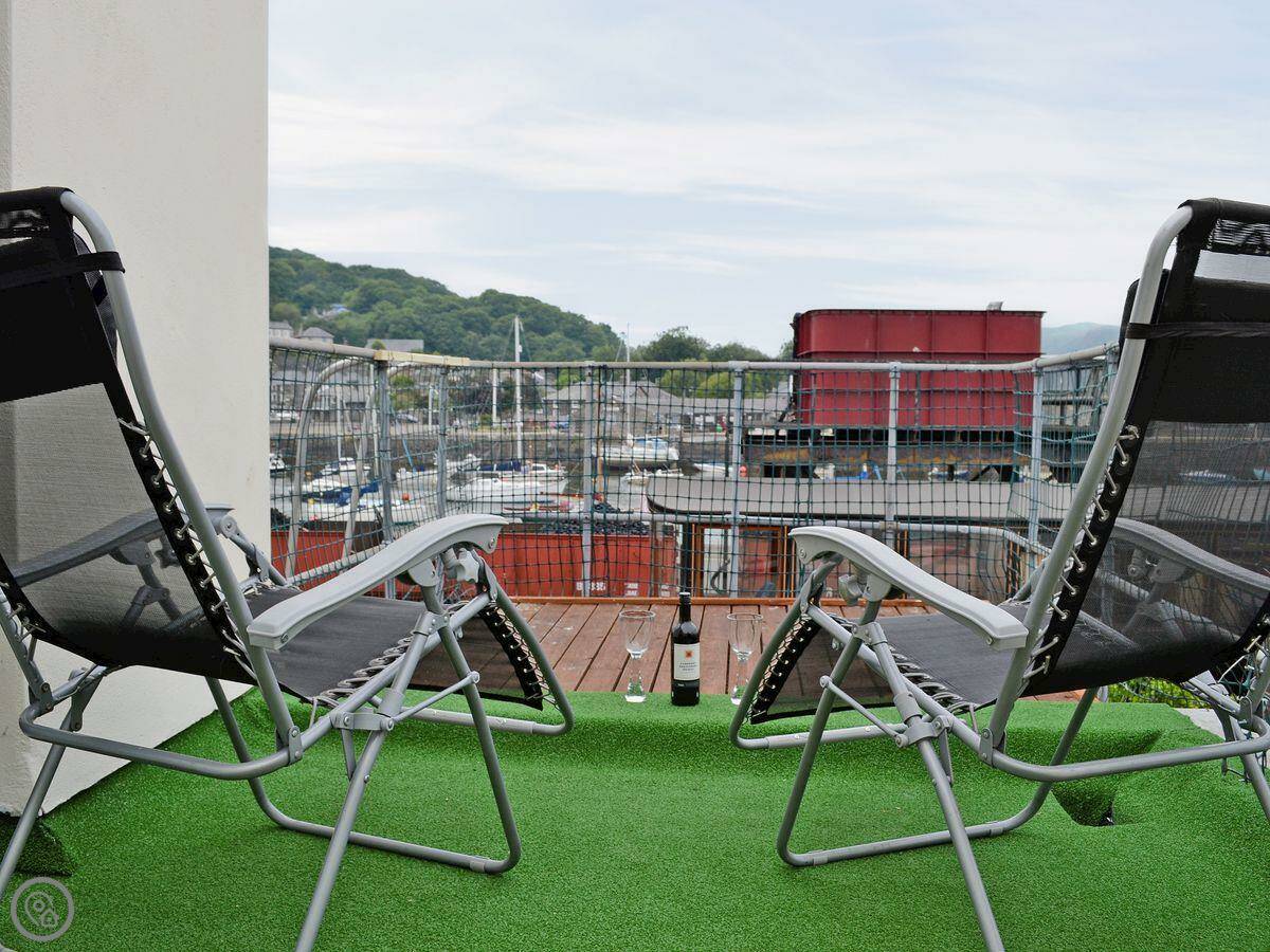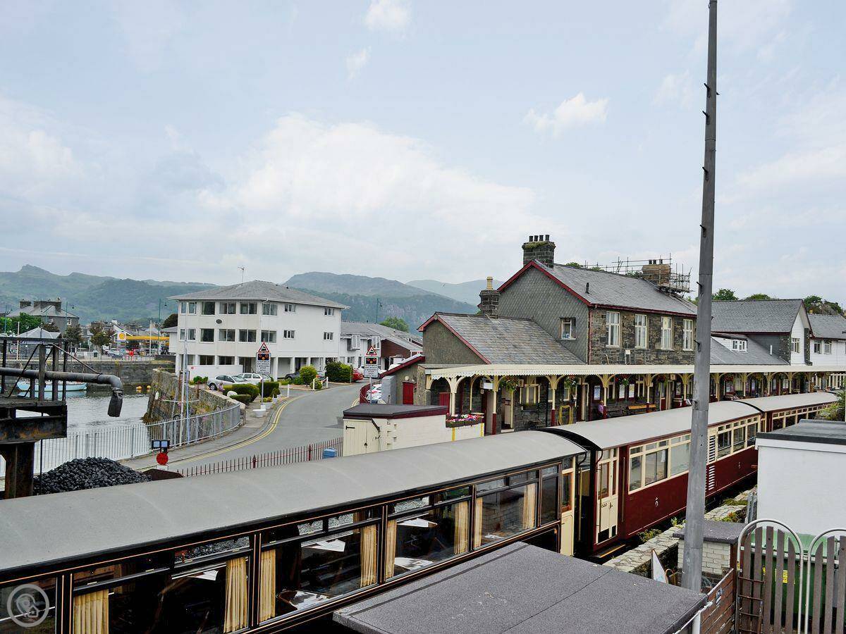 The main thing is the view. You look straight out over the harbour, and the tidal changes make it different all day. The little steam trains from the Ffestiniog and Welsh Highland Railway go past the end of the wharf. You can sit on the balcony and watch them.