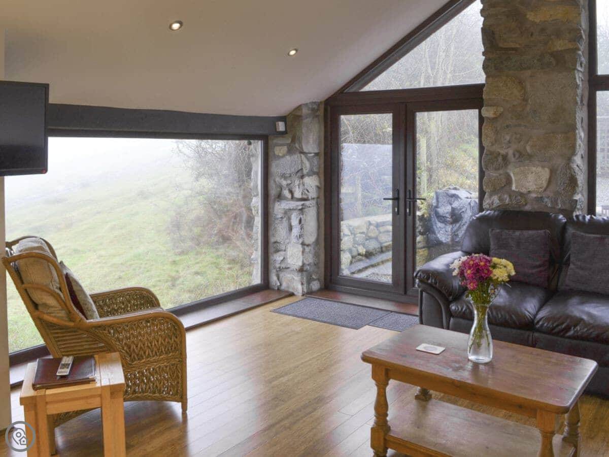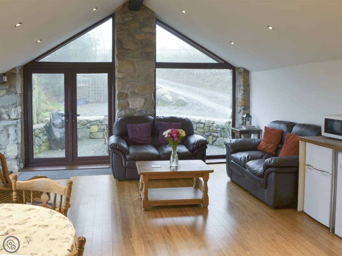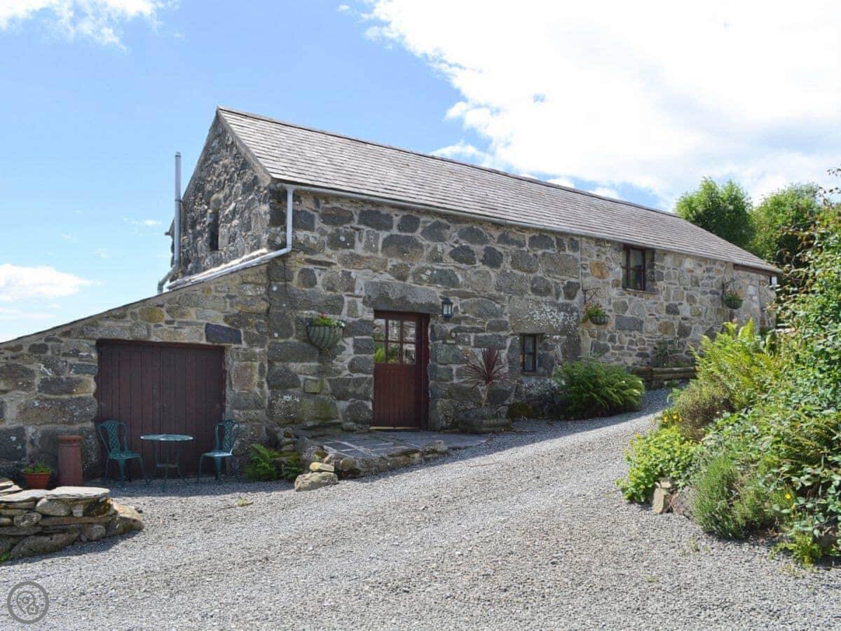 The Stable is in Pentrefelin. It's a converted stone barn, detached, on our farm. You look out over fields towards the sea, and the mountains are behind you. You get the whole building and the garden to yourselves.