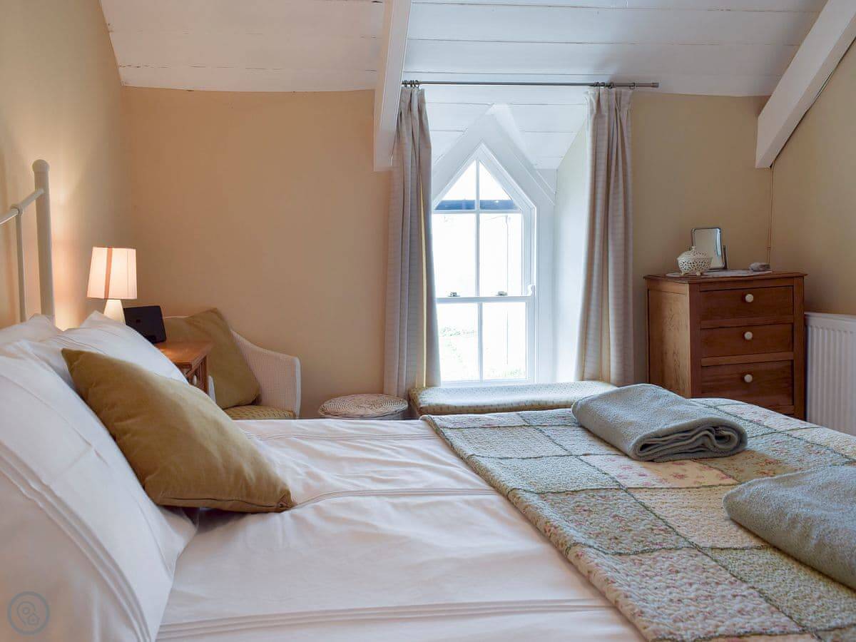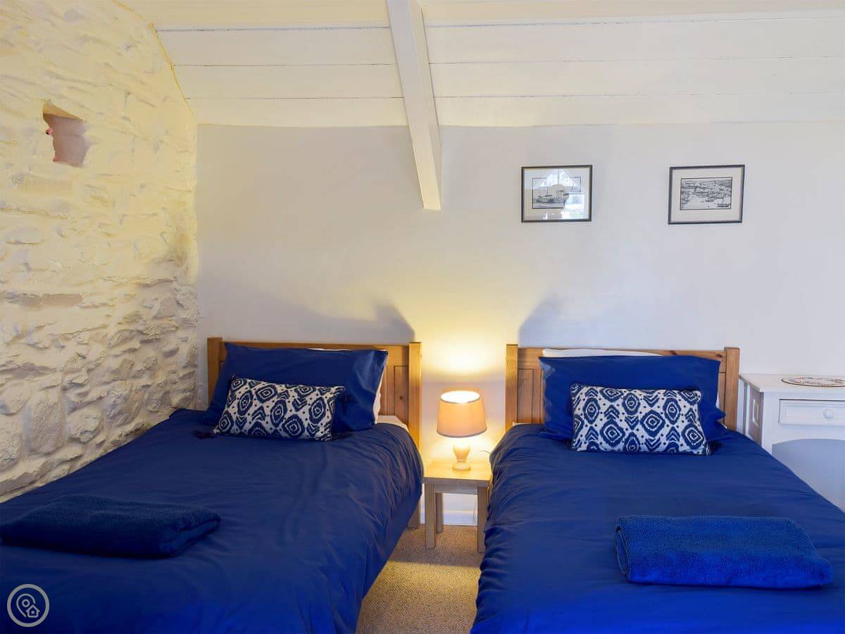 It sleeps four. Two bedrooms, two bathrooms. It's got a 4 Star rating. It's been done up but they kept the old beams and the slate floors. There's a wood burner in the dining area. The stairs are typical for a cottage, so they're a bit steep and narrow.