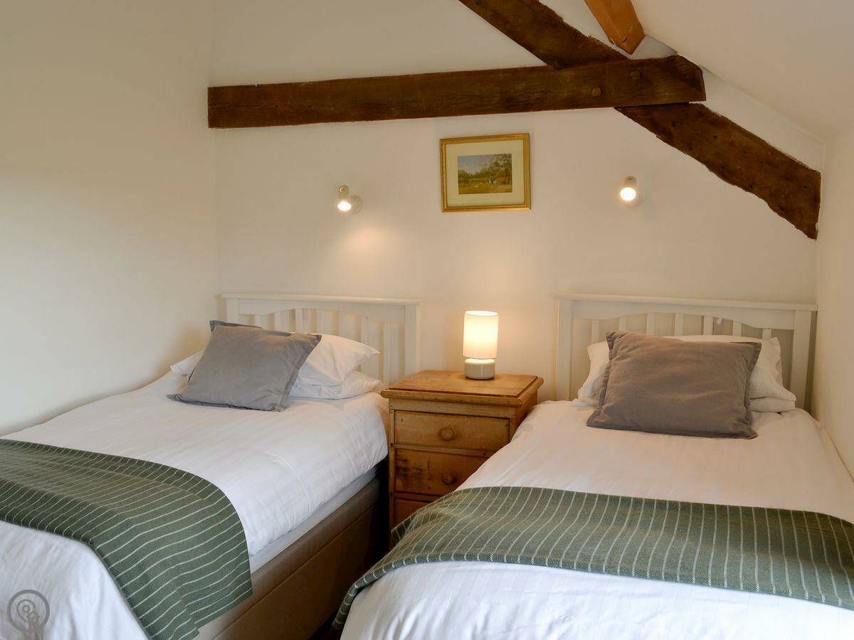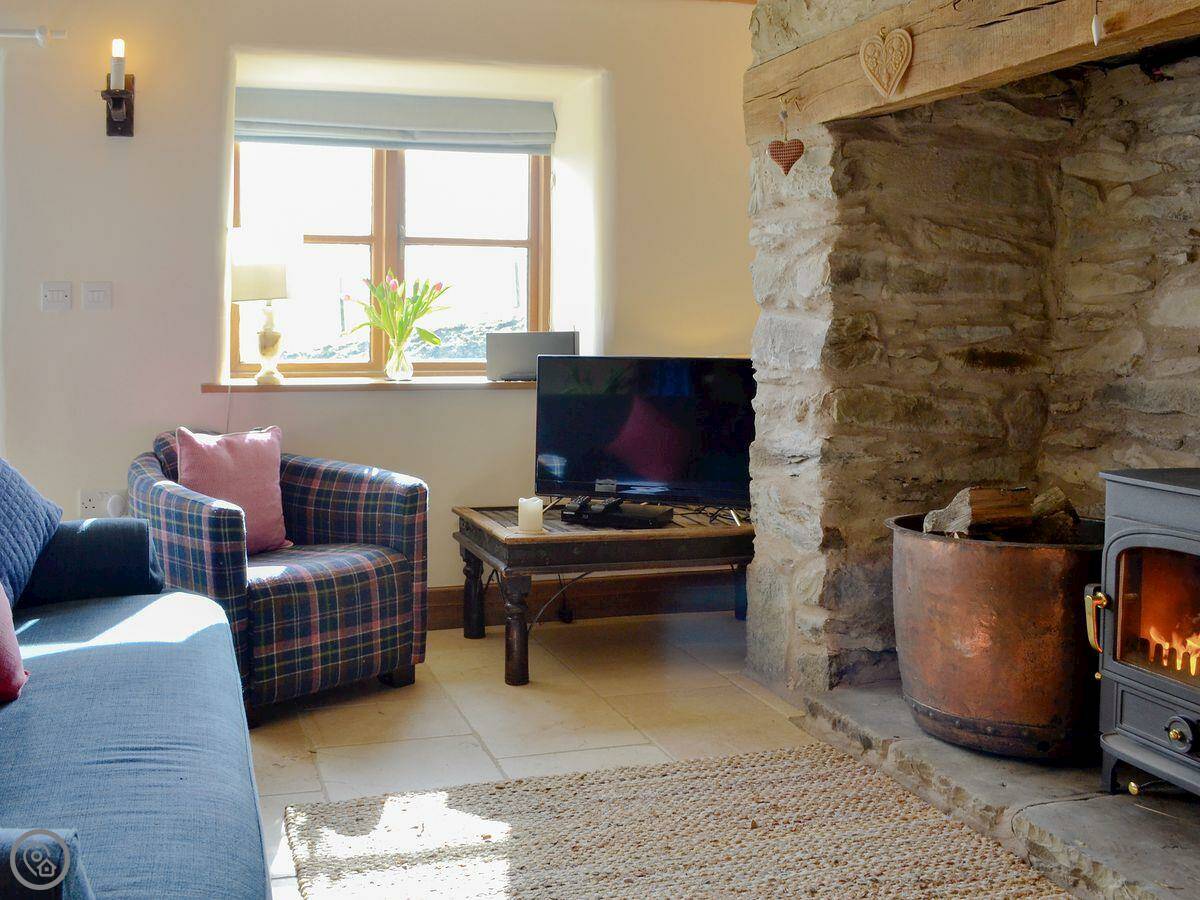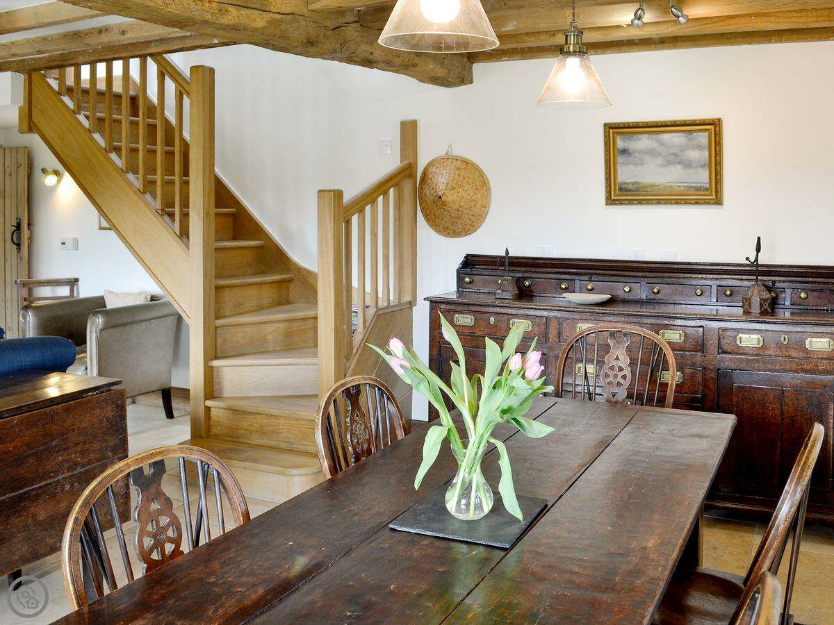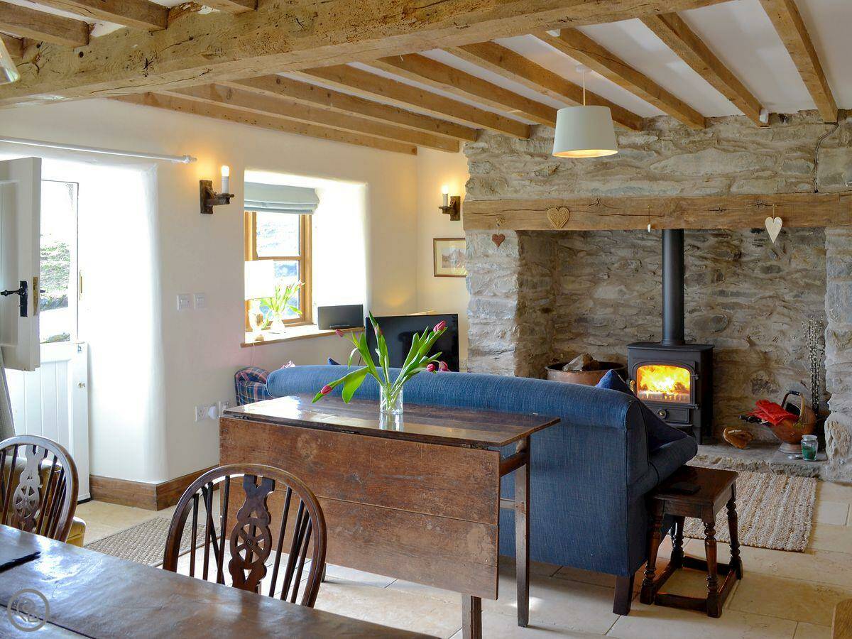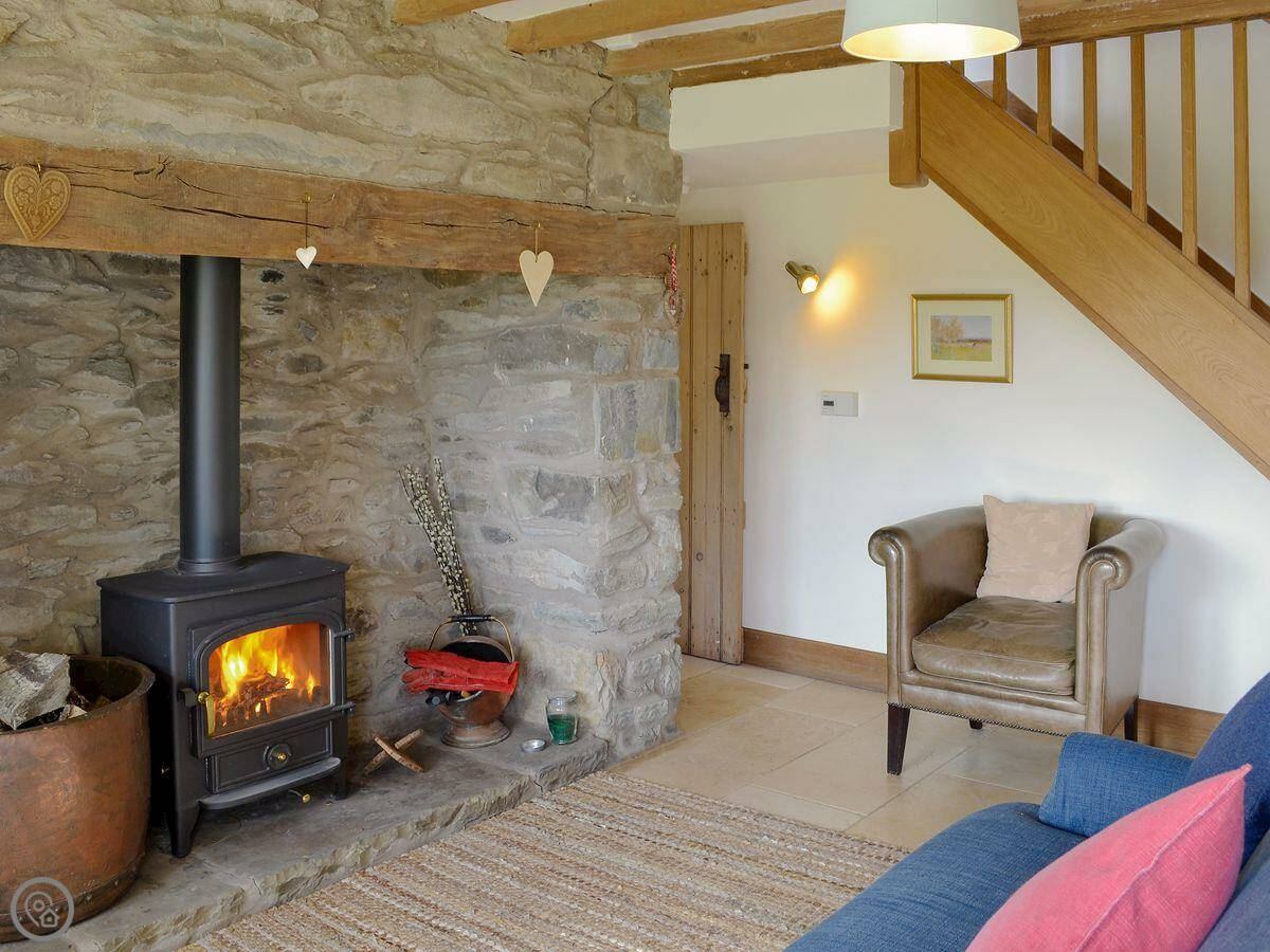 It sleeps five. Three bedrooms, two bathrooms. One bathroom is a wet room on the ground floor. It has a 4 Star rating. It's comfortable. There's a wood burner in the main room. The stairs are normal.