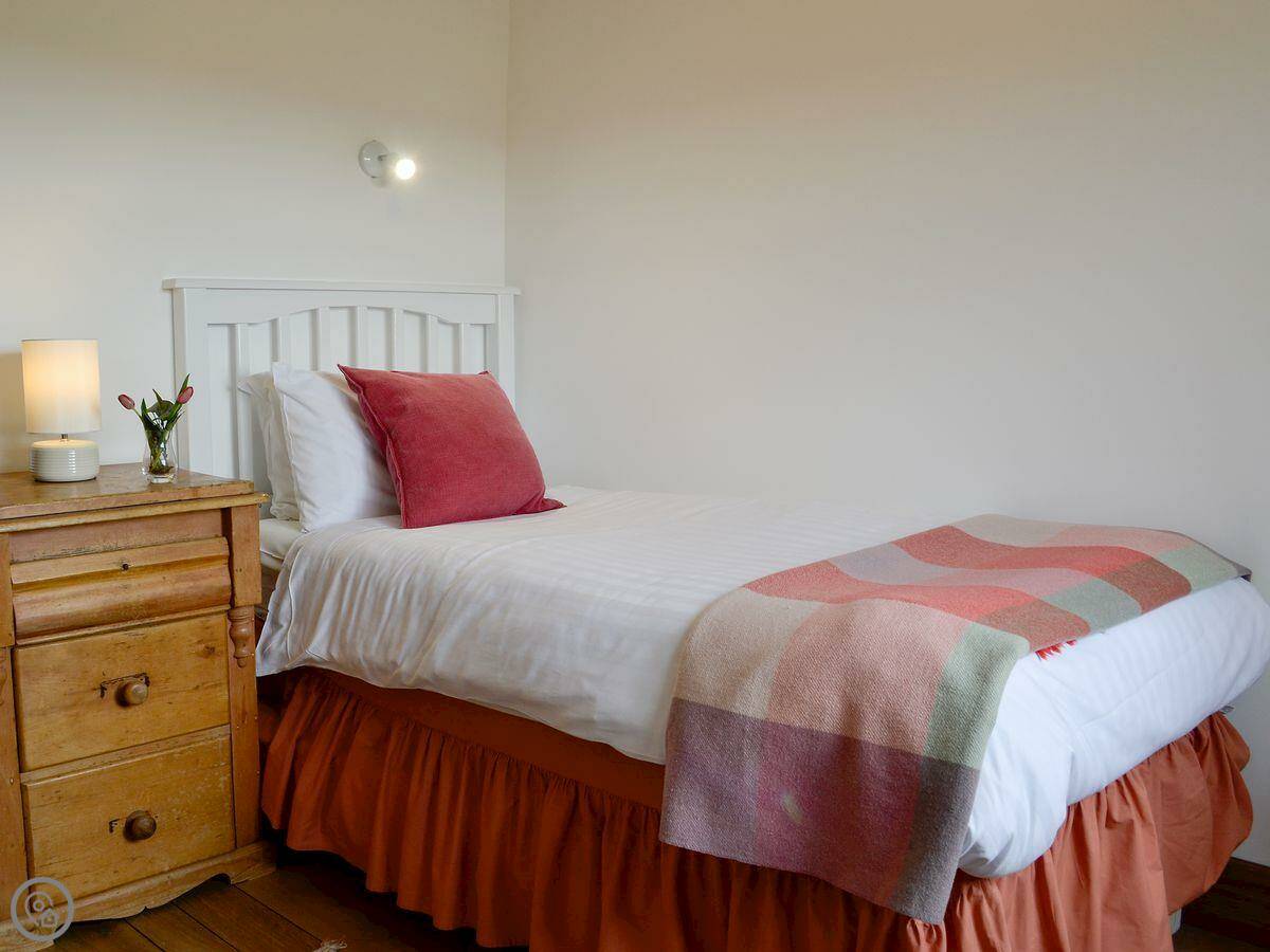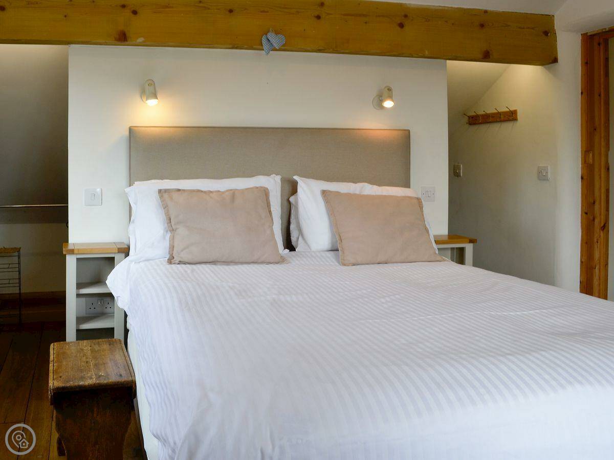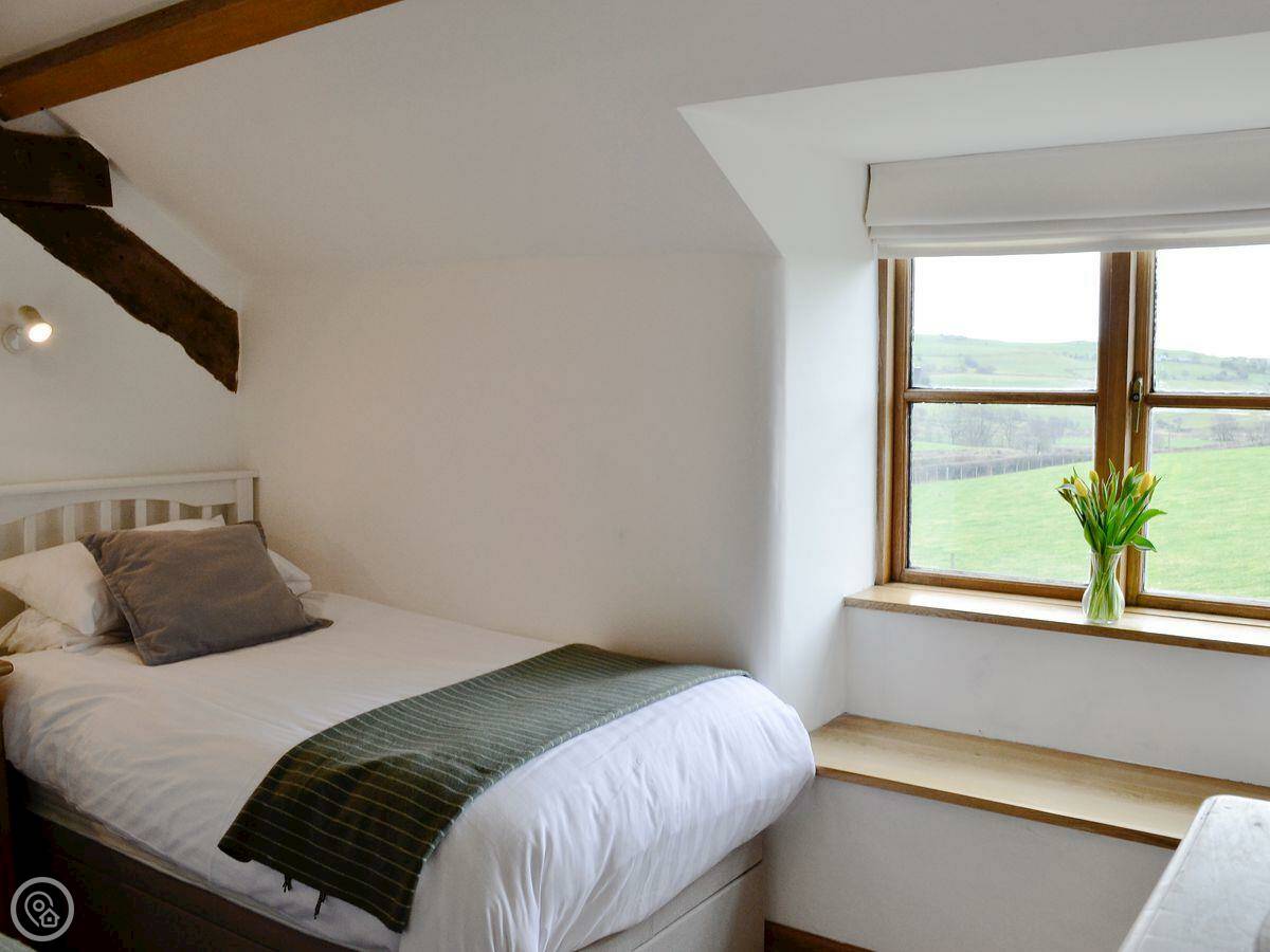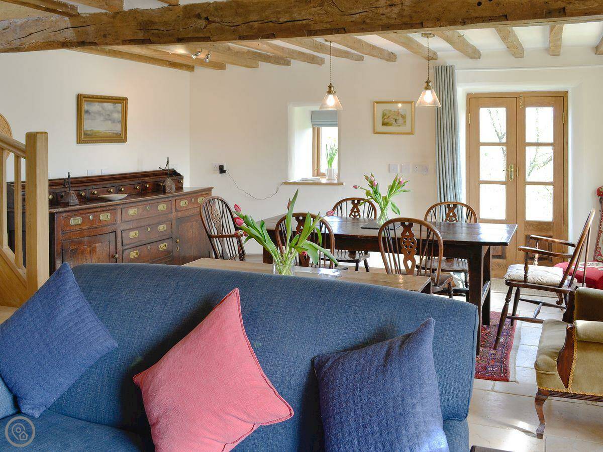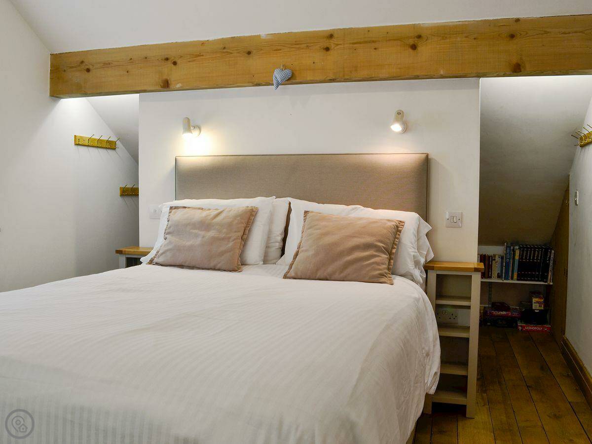 It sleeps five. Three bedrooms, two bathrooms. One bathroom is a wet room on the ground floor. It has a 4 Star rating. It's comfortable. There's a wood burner in the main room. The stairs are normal.