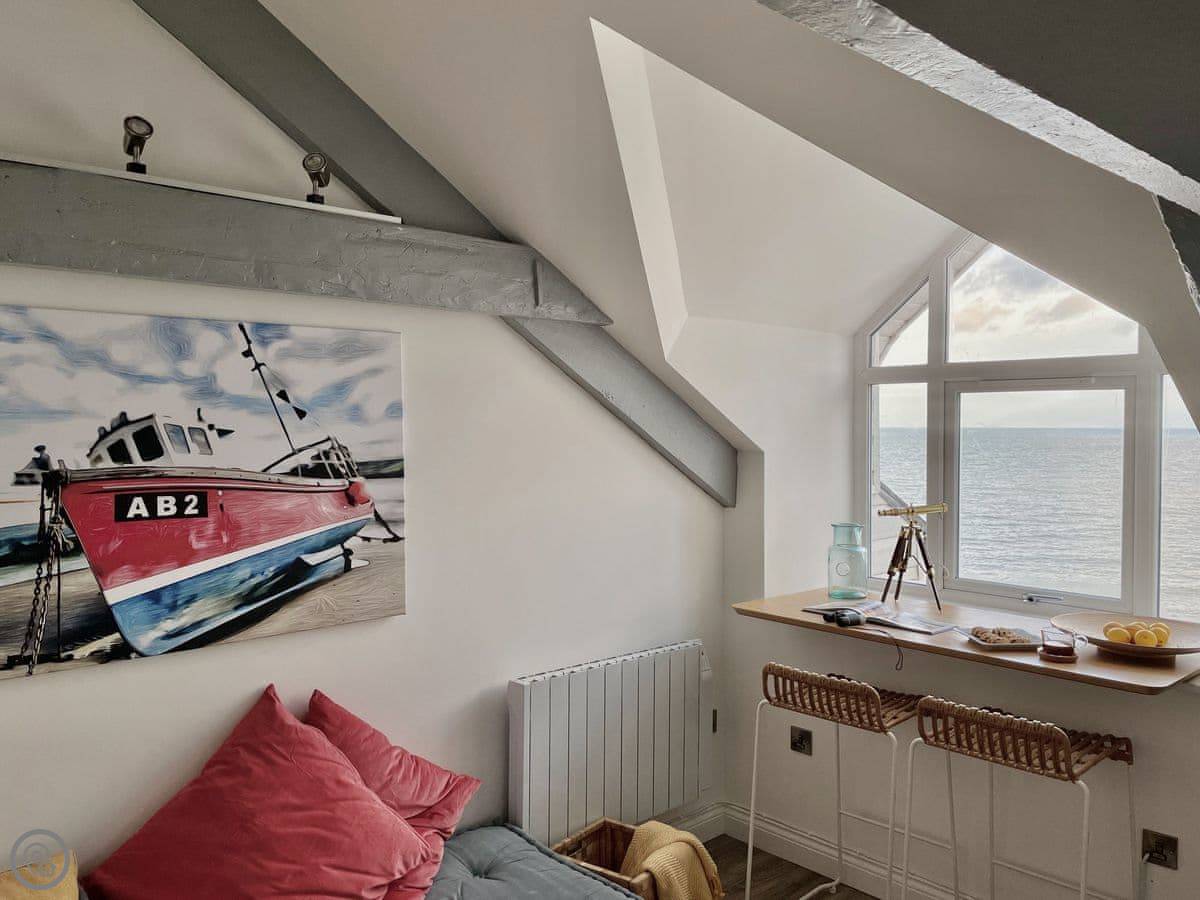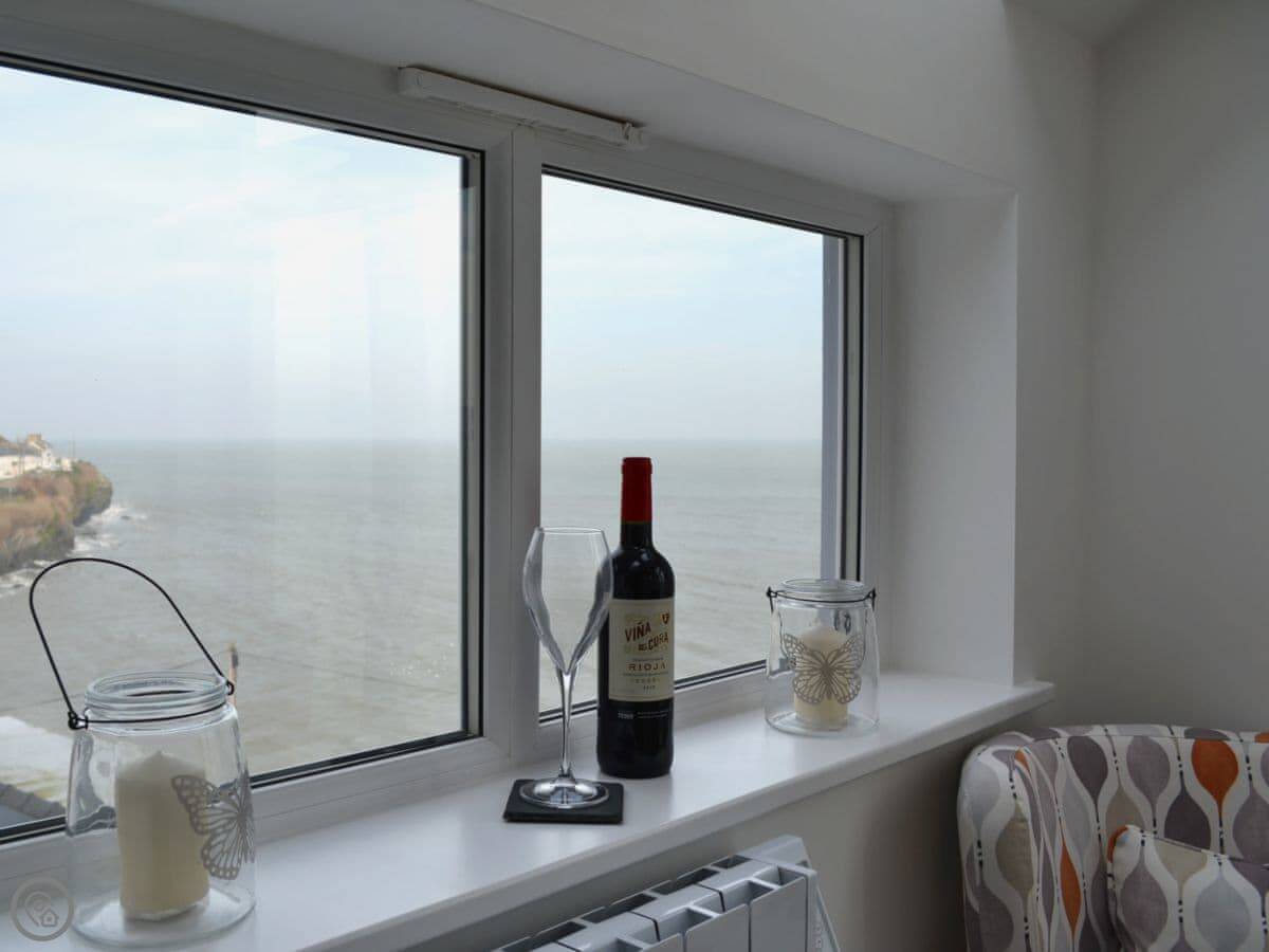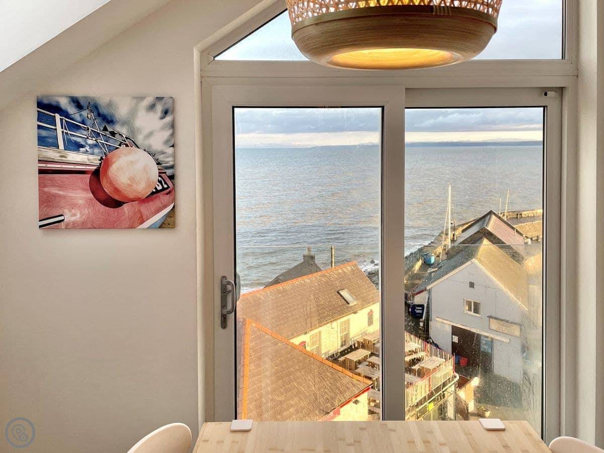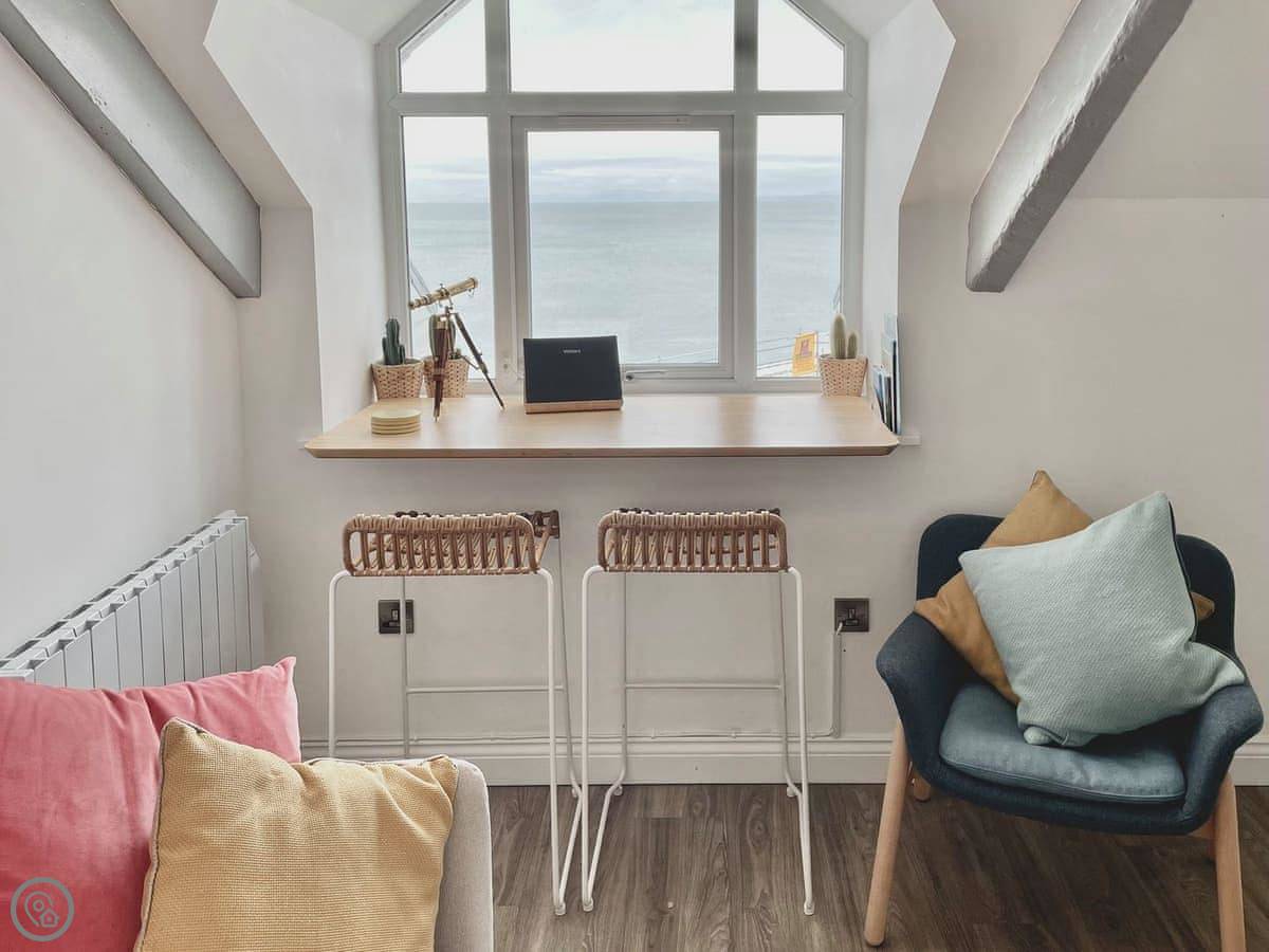 Seascape is a flat at the top of a building on the hill in New Quay. It’s on the third floor, so there are stairs to climb. The views from the big windows are the main thing. You look straight out over the harbour and the bay. You can watch the boats from the sofa. We’ve seen dolphins from there too.