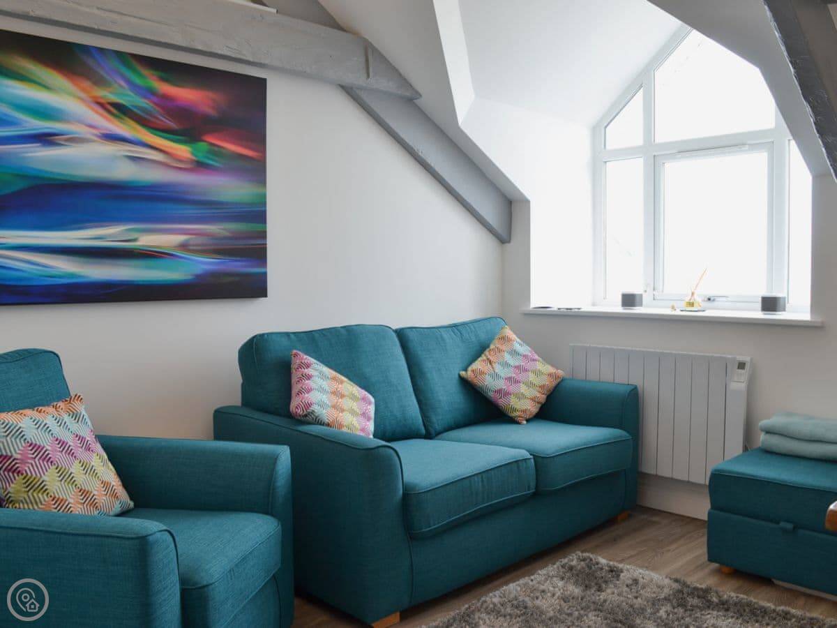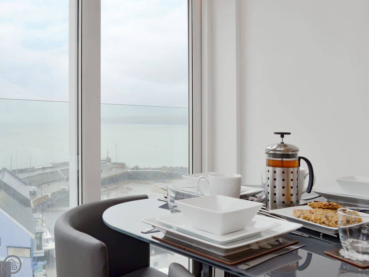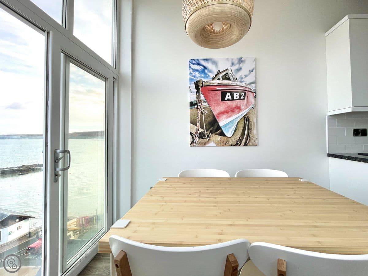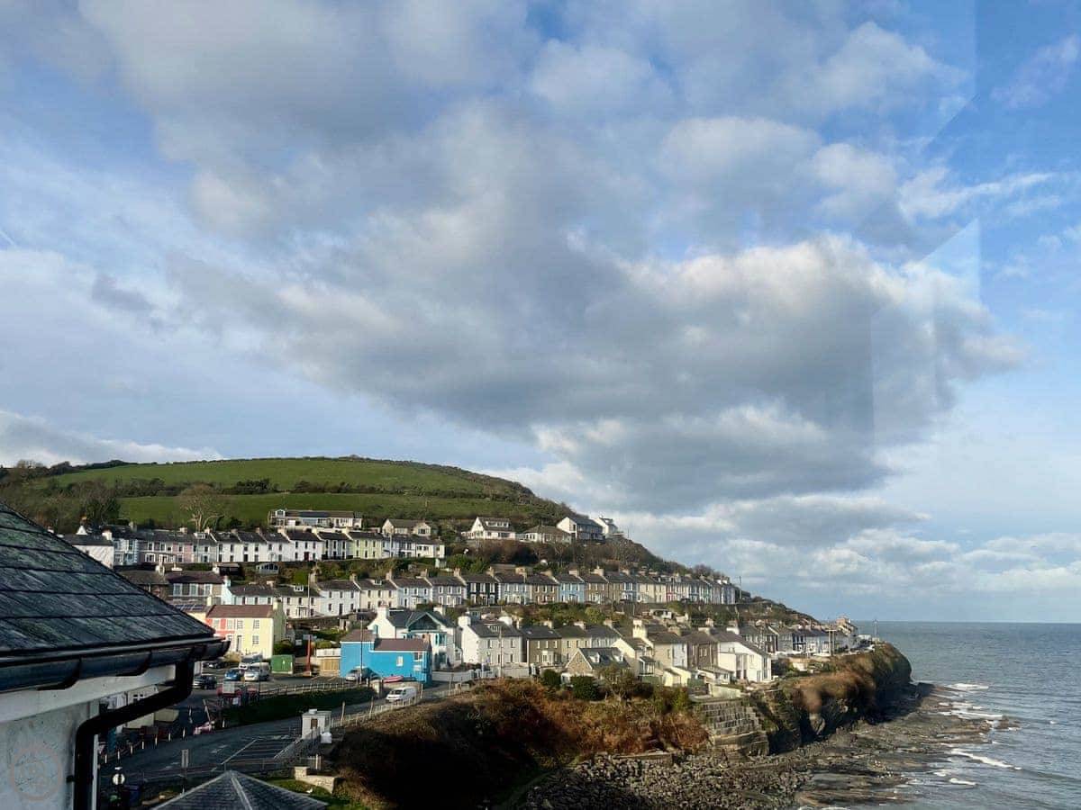 Seascape is a flat at the top of a building on the hill in New Quay. It’s on the third floor, so there are stairs to climb. The views from the big windows are the main thing. You look straight out over the harbour and the bay. You can watch the boats from the sofa. We’ve seen dolphins from there too.