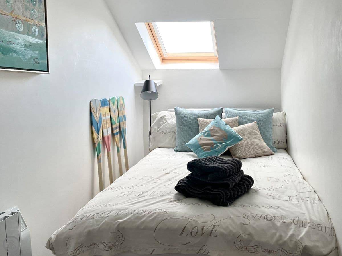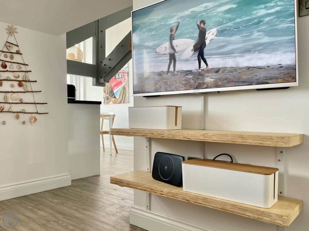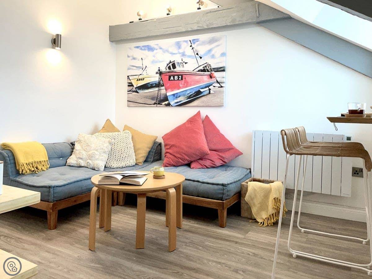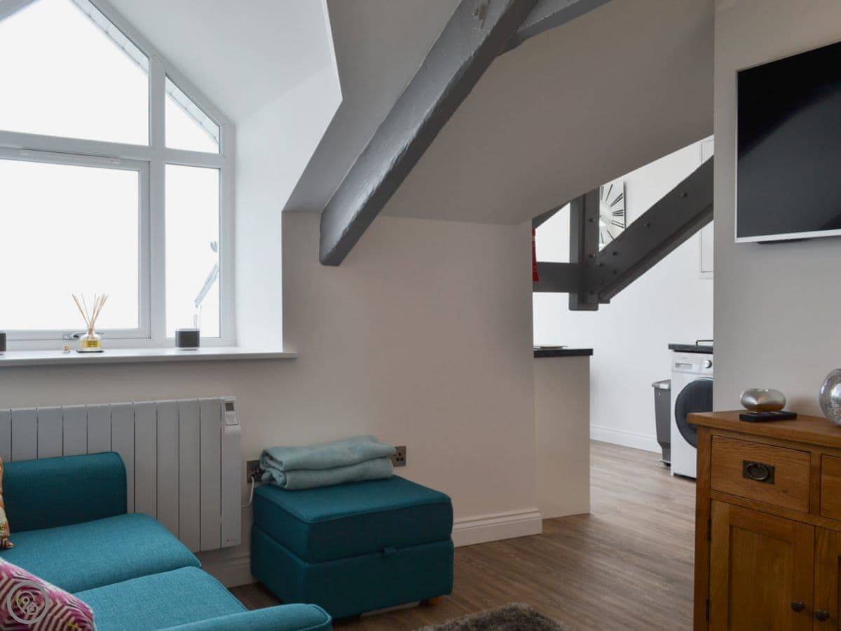 Seascape is a flat at the top of a building on the hill in New Quay. It’s on the third floor, so there are stairs to climb. The views from the big windows are the main thing. You look straight out over the harbour and the bay. You can watch the boats from the sofa. We’ve seen dolphins from there too.