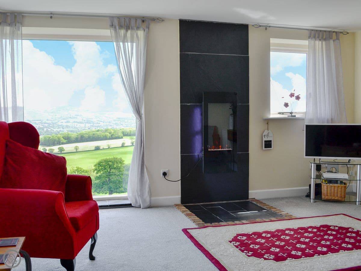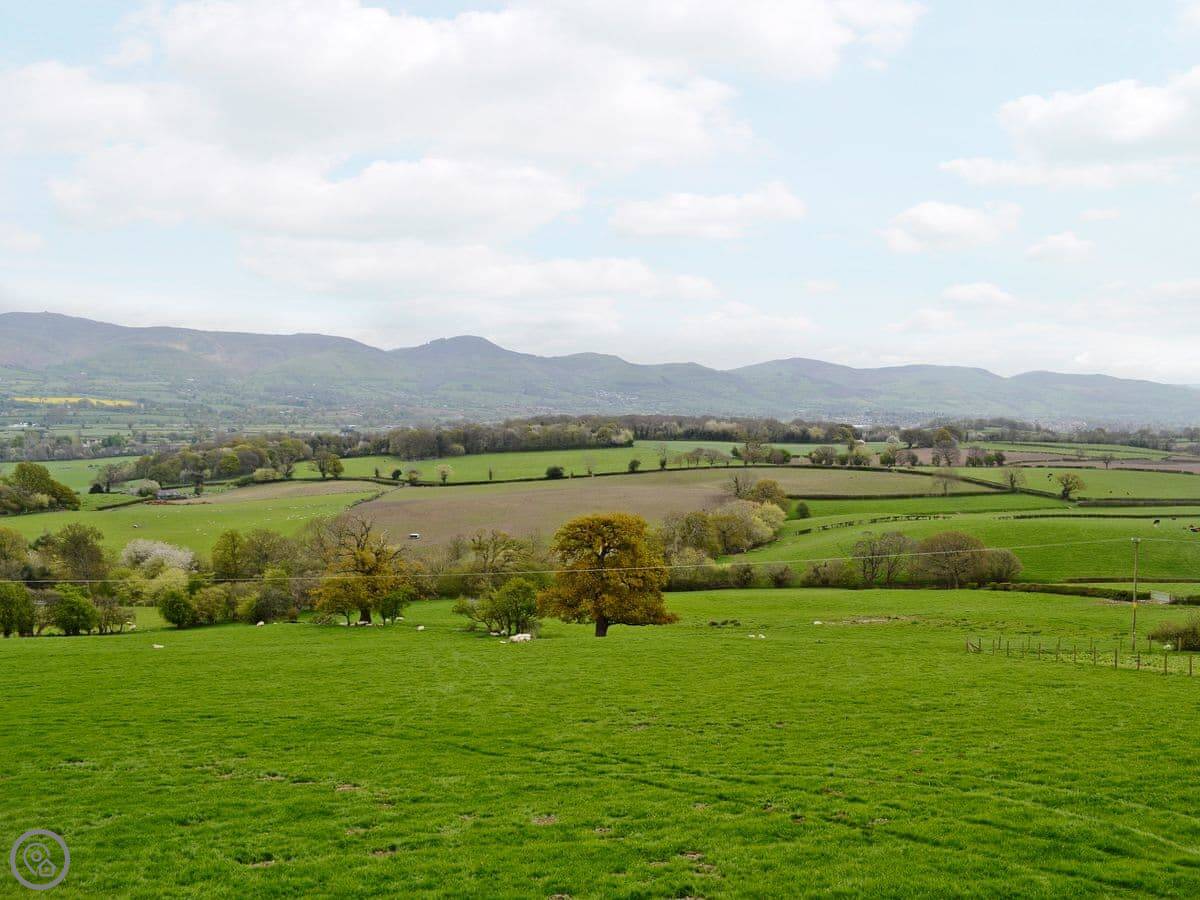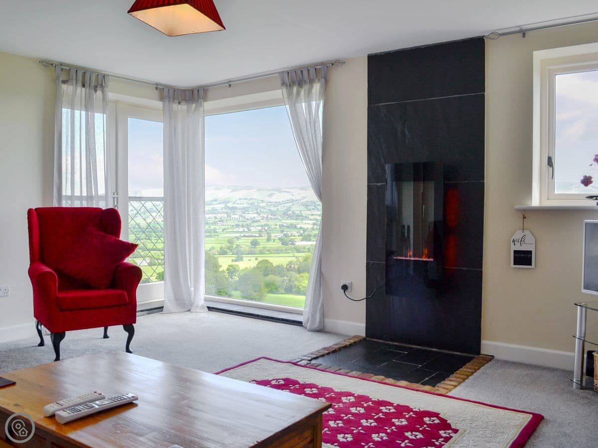 The main thing is the view. You're up a lane, about a mile and a half, so you look right out over the valley towards Moel Famau and the Clwydian Range. The living room has doors that open onto a Juliet balcony. You can just sit there with a drink. It's very quiet.