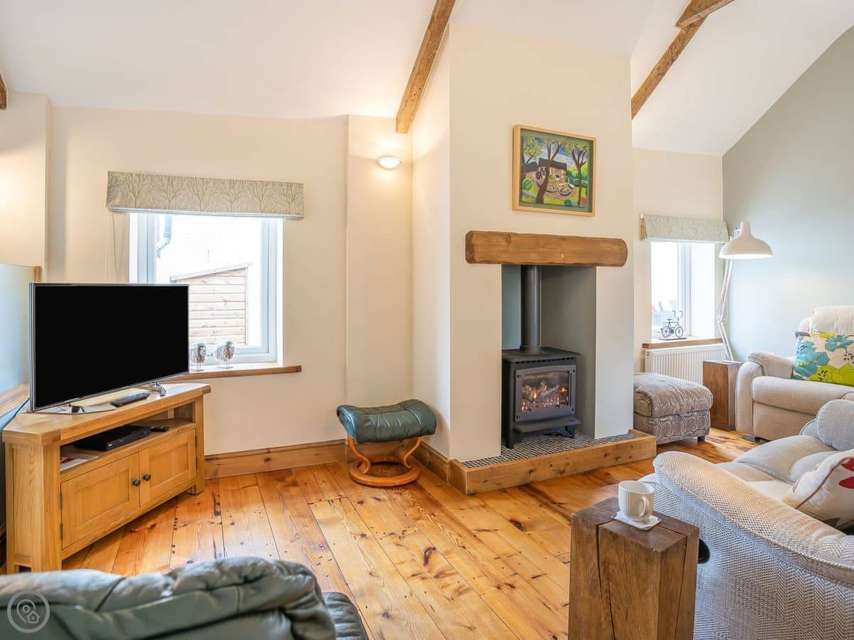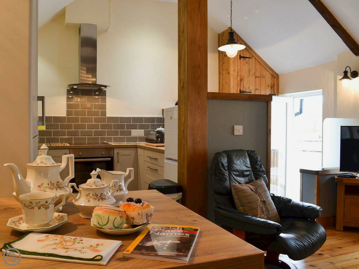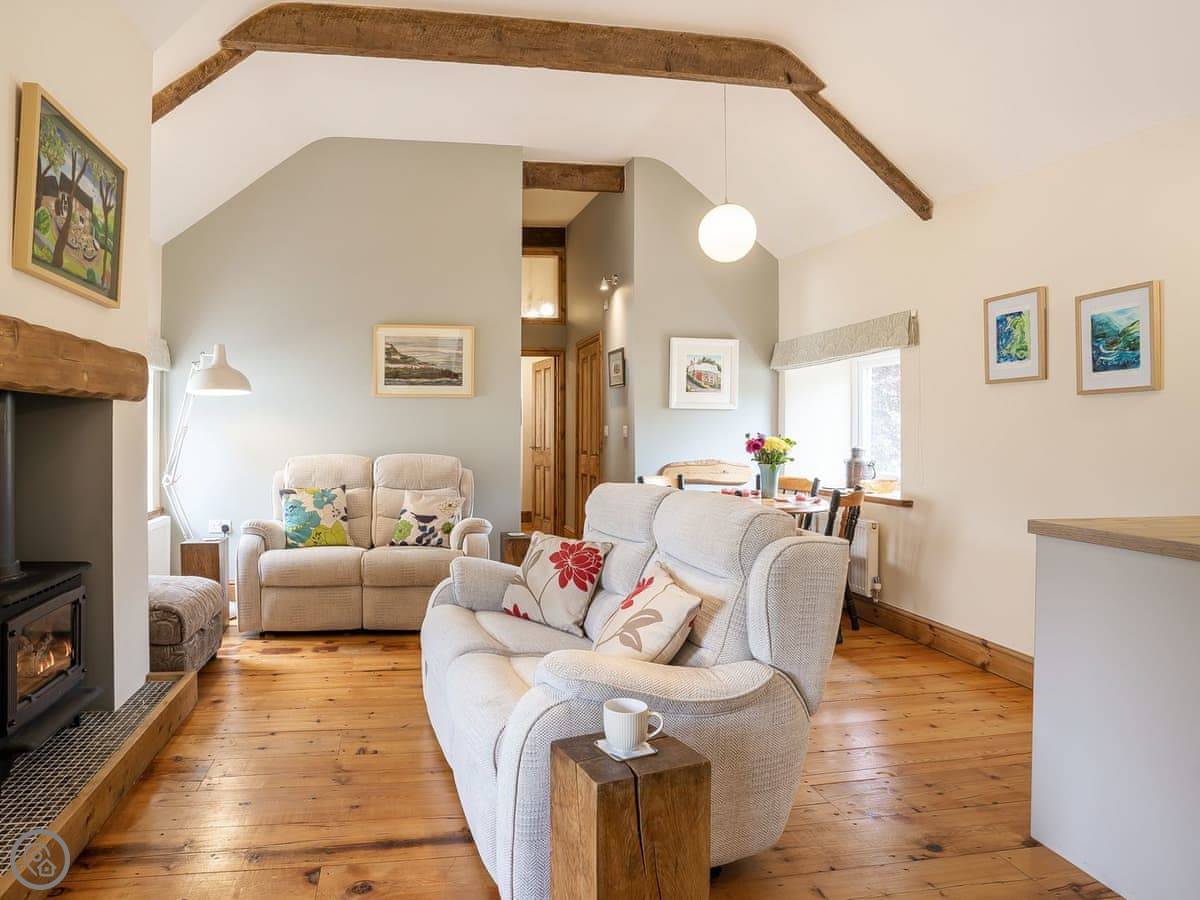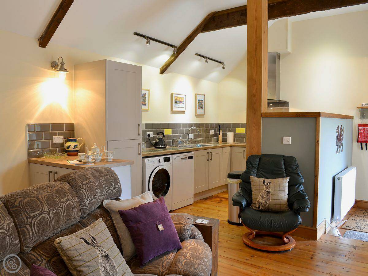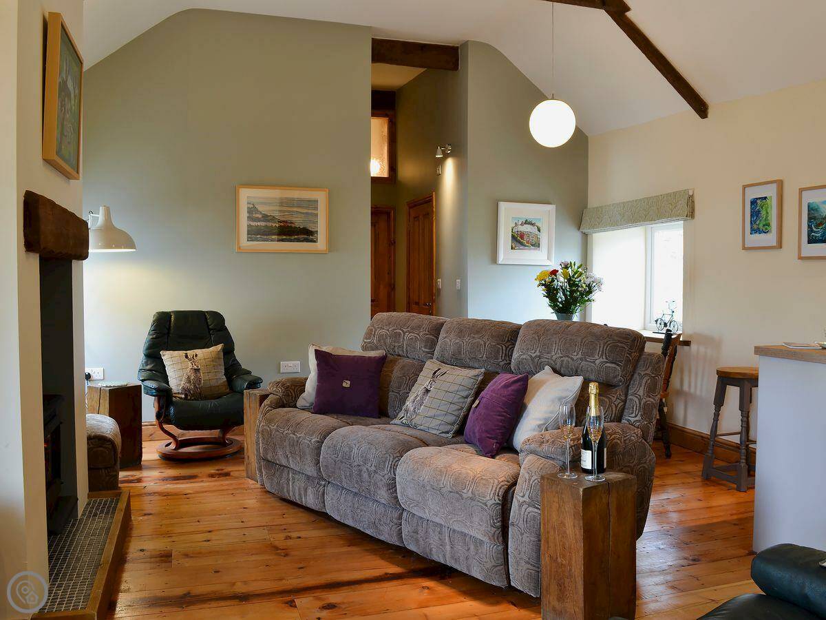 It sleeps five. There are two bedrooms and two bathrooms. One bathroom is a wet room on the ground floor. It’s got a 4 Star rating. It’s clean and warm, with wooden beams and a slate floor. The furniture is a mix of old and new. It’s open plan.