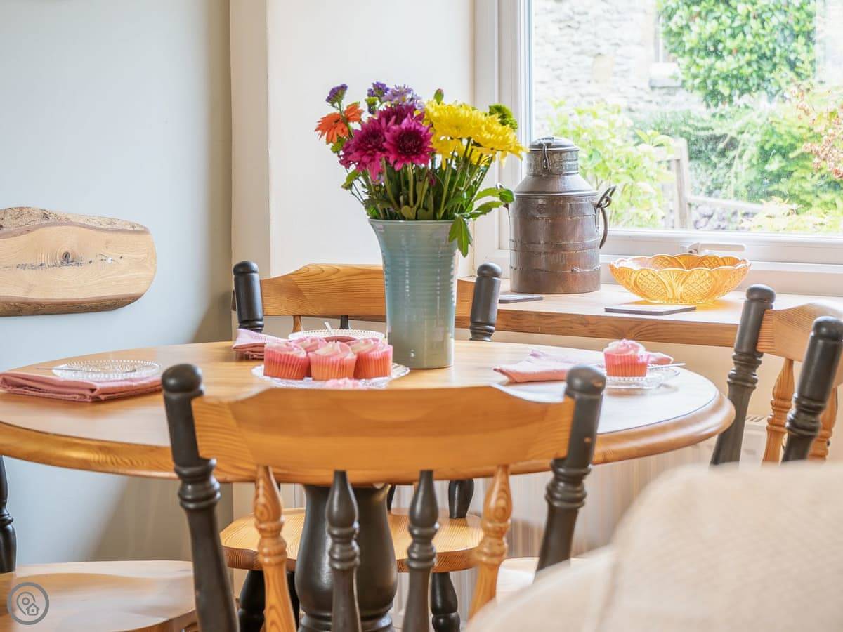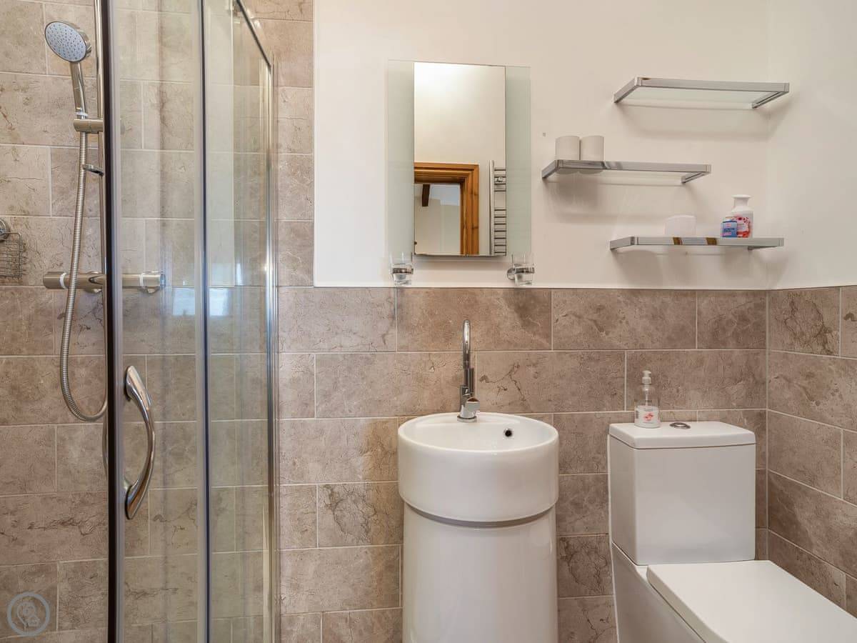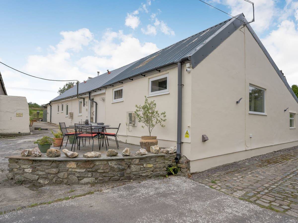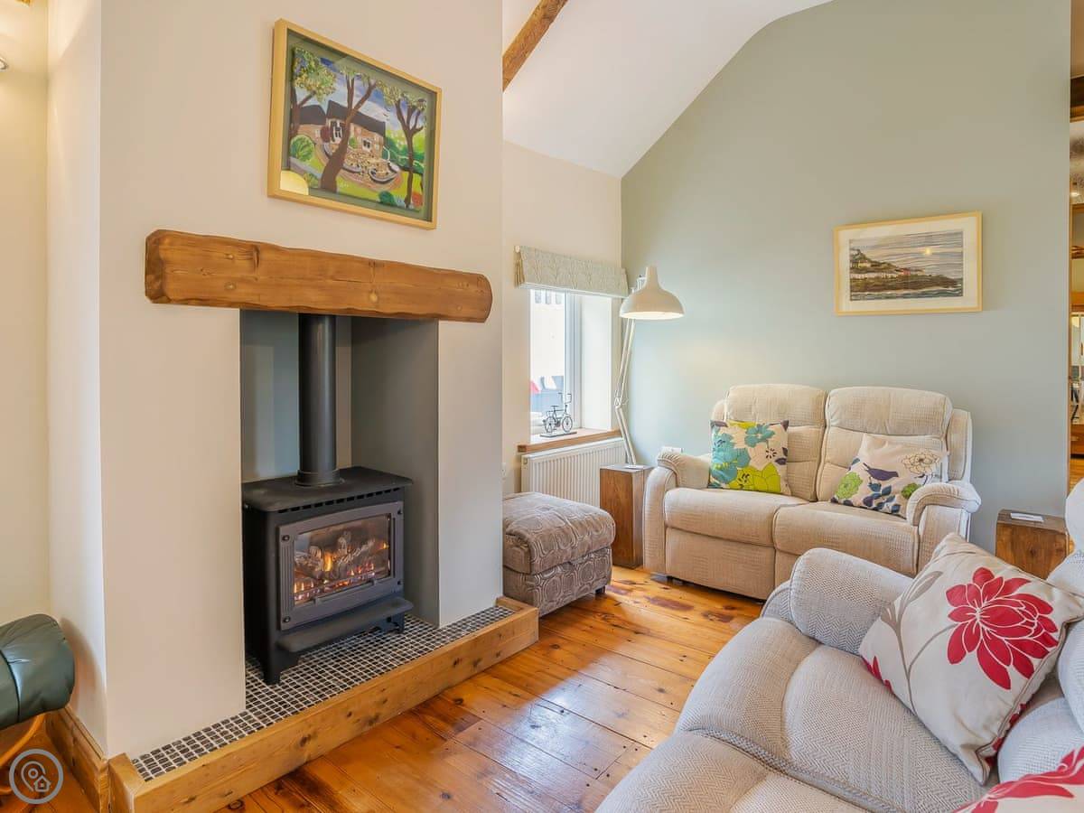It sleeps five. There are two bedrooms and two bathrooms. One bathroom is a wet room on the ground floor. It’s got a 4 Star rating. It’s clean and warm, with wooden beams and a slate floor. The furniture is a mix of old and new. It’s open plan.