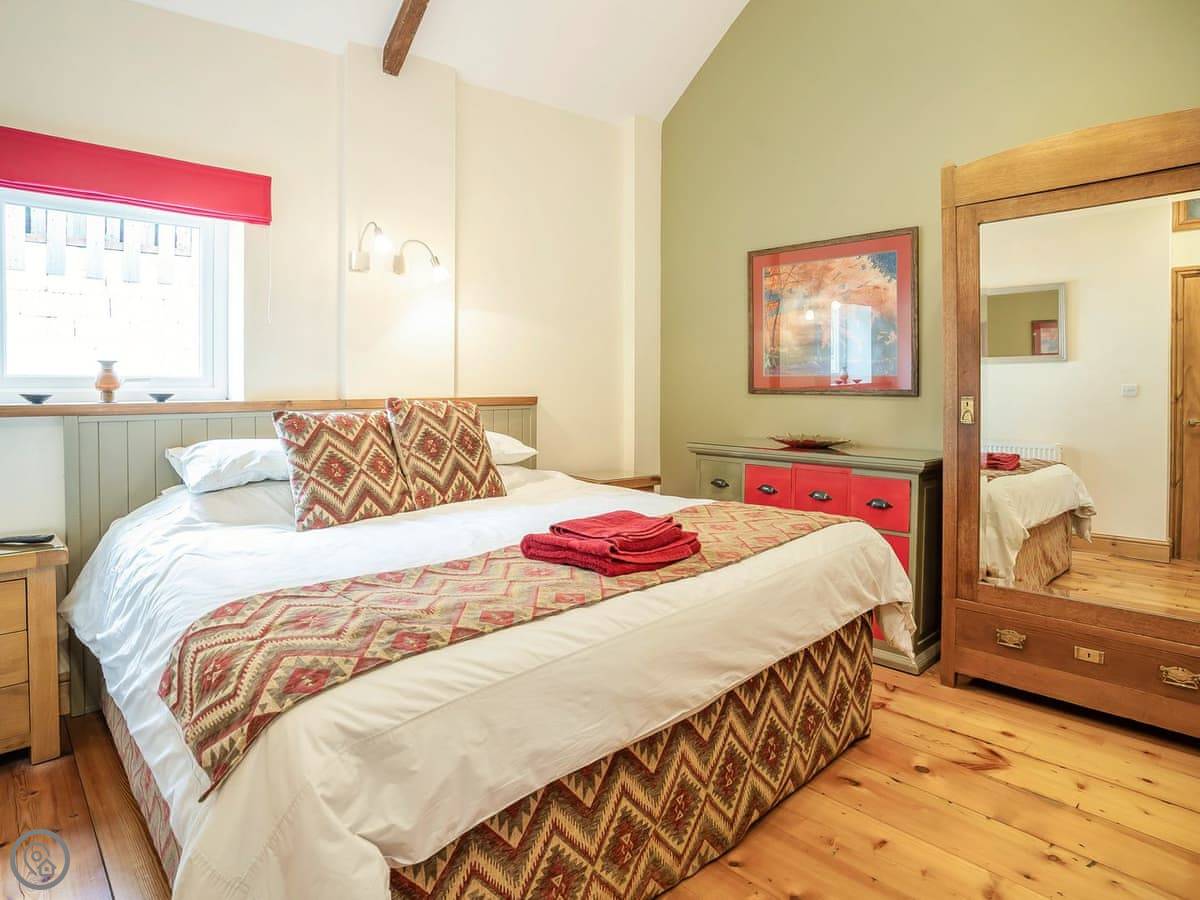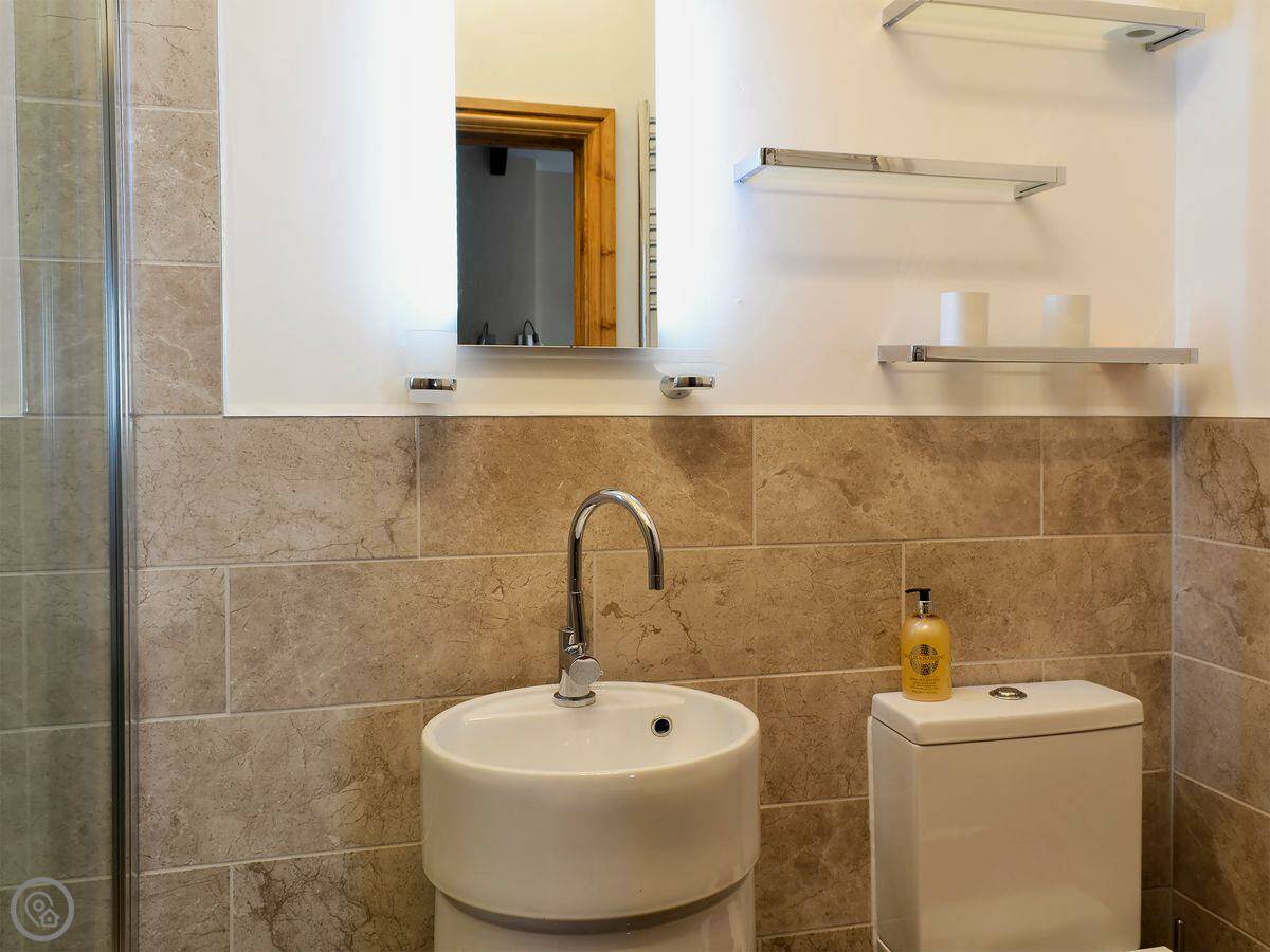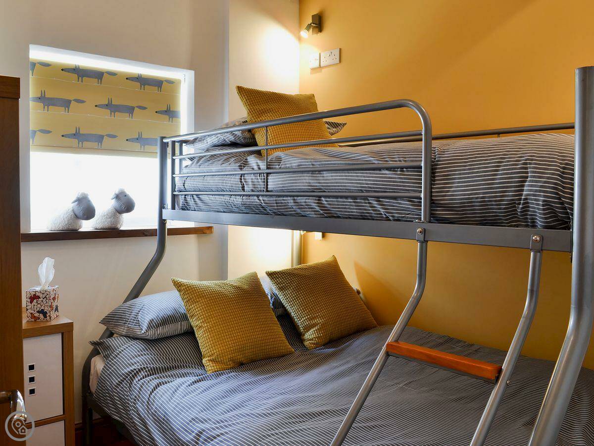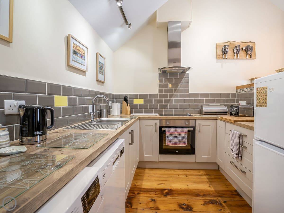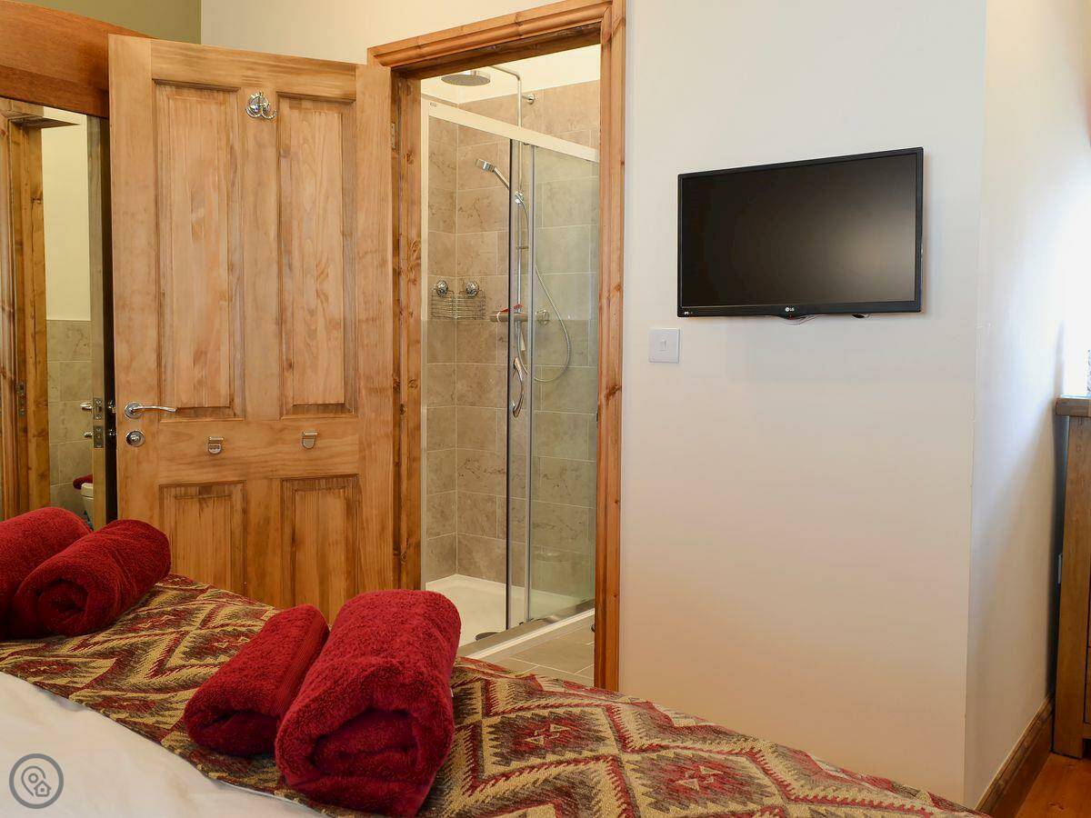 It sleeps five. There are two bedrooms and two bathrooms. One bathroom is a wet room on the ground floor. It’s got a 4 Star rating. It’s clean and warm, with wooden beams and a slate floor. The furniture is a mix of old and new. It’s open plan.