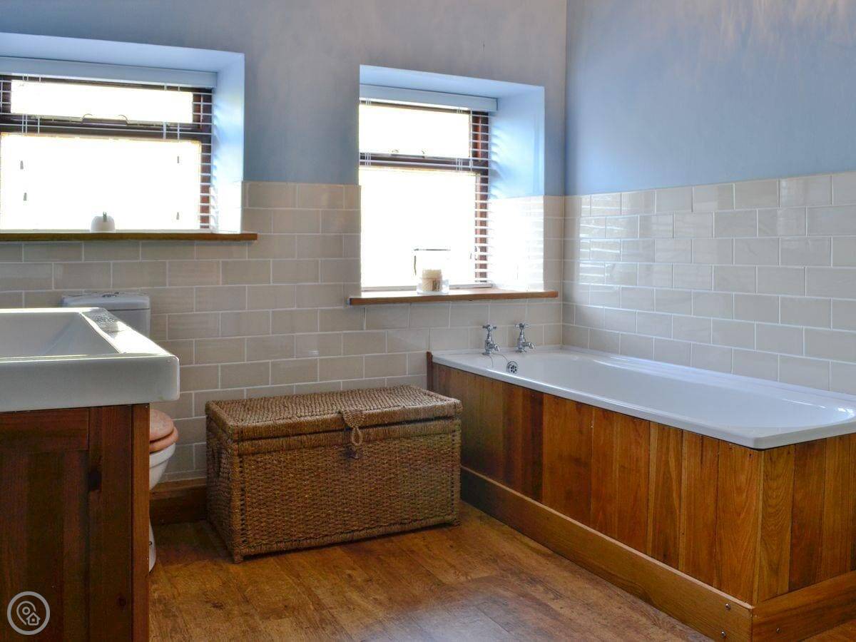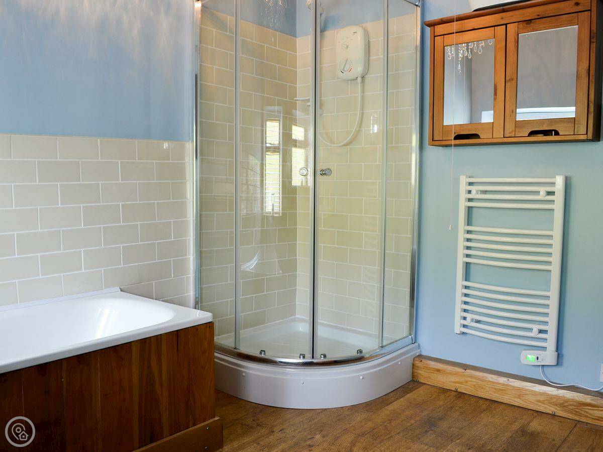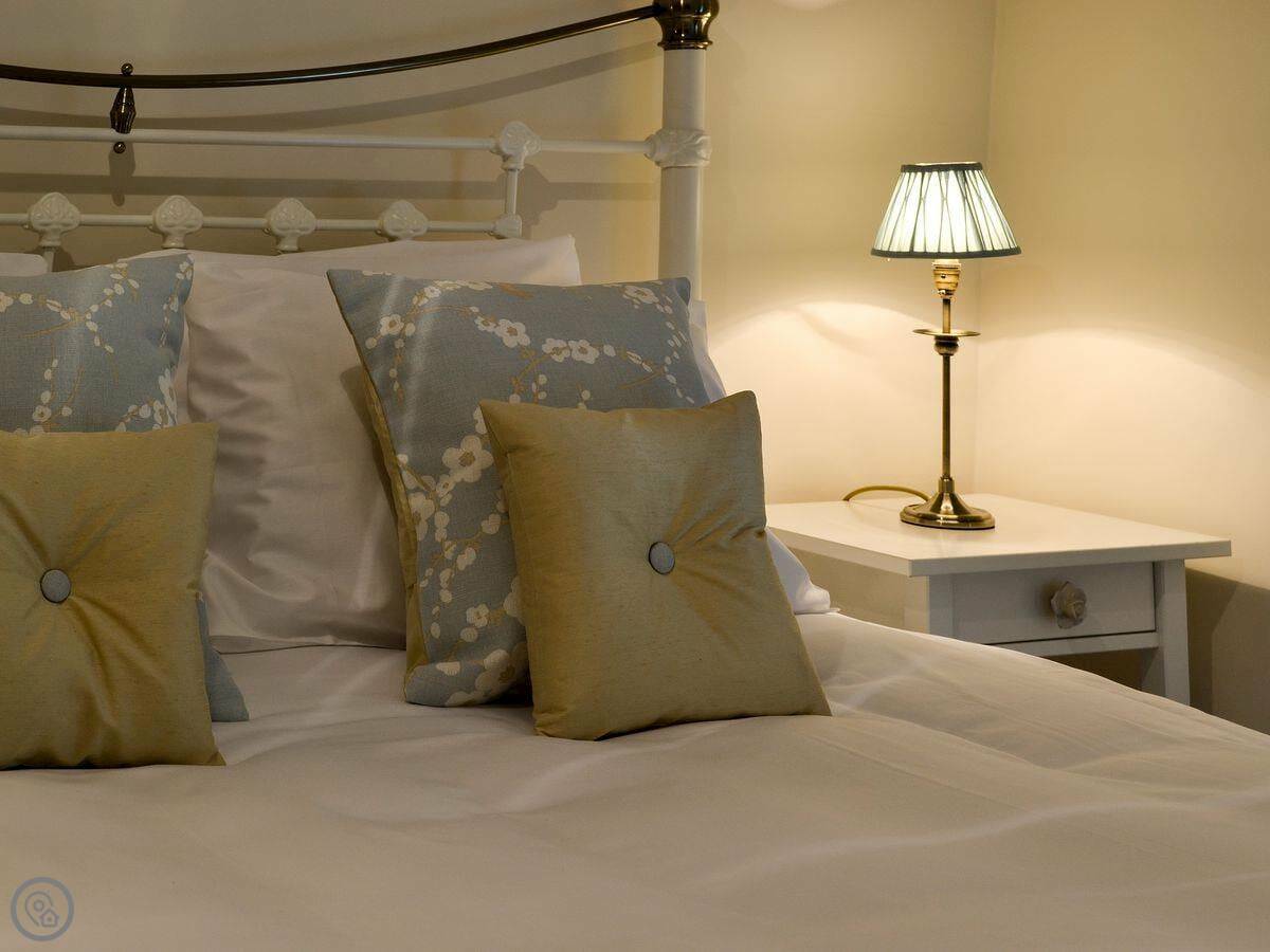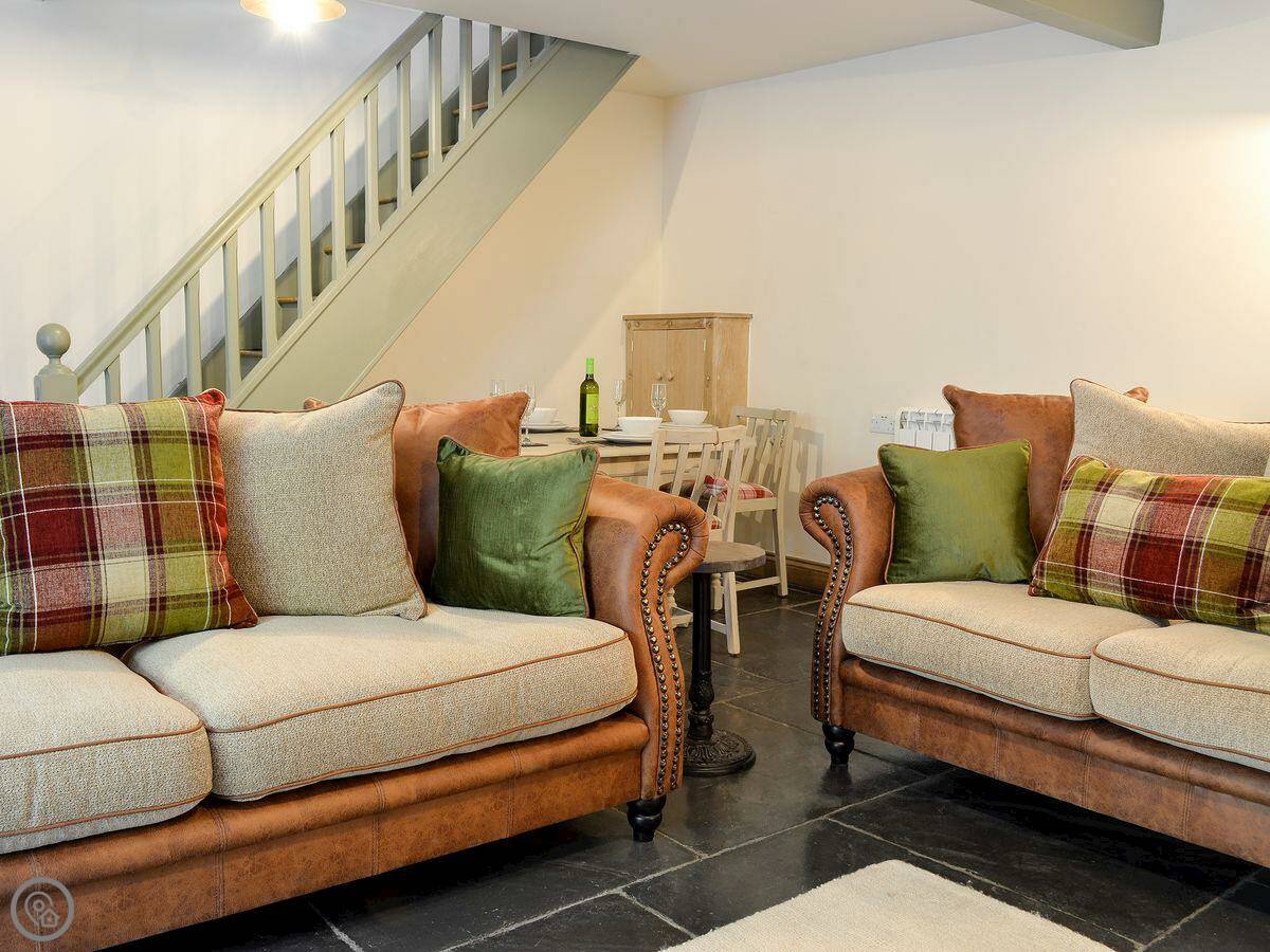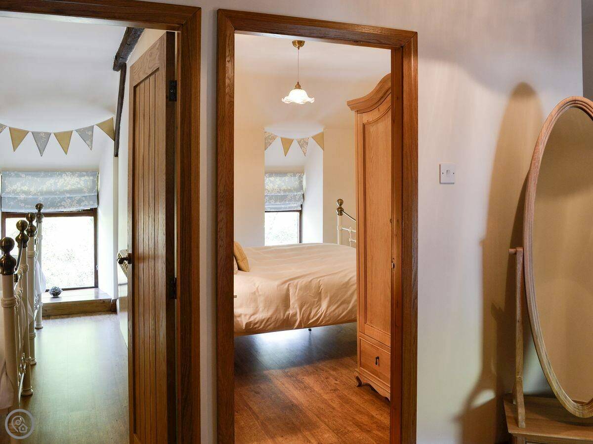 It sleeps four in two bedrooms. One bathroom with a shower. The living room is a good size and has the wood burner. It's got a 4 Star rating, so it's comfortable and well-kept. The stairs to the first floor are fairly standard, but the step down into the main bedroom is quite deep, so just watch your step.