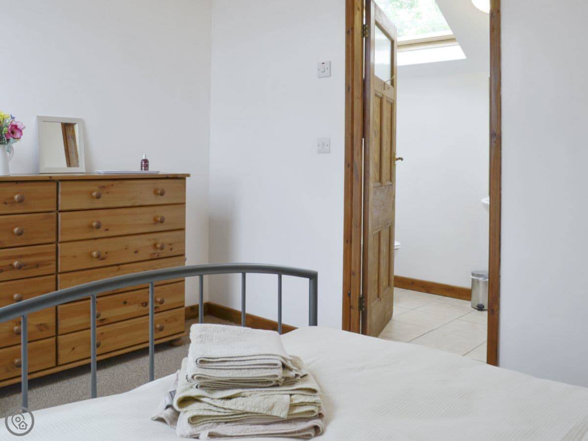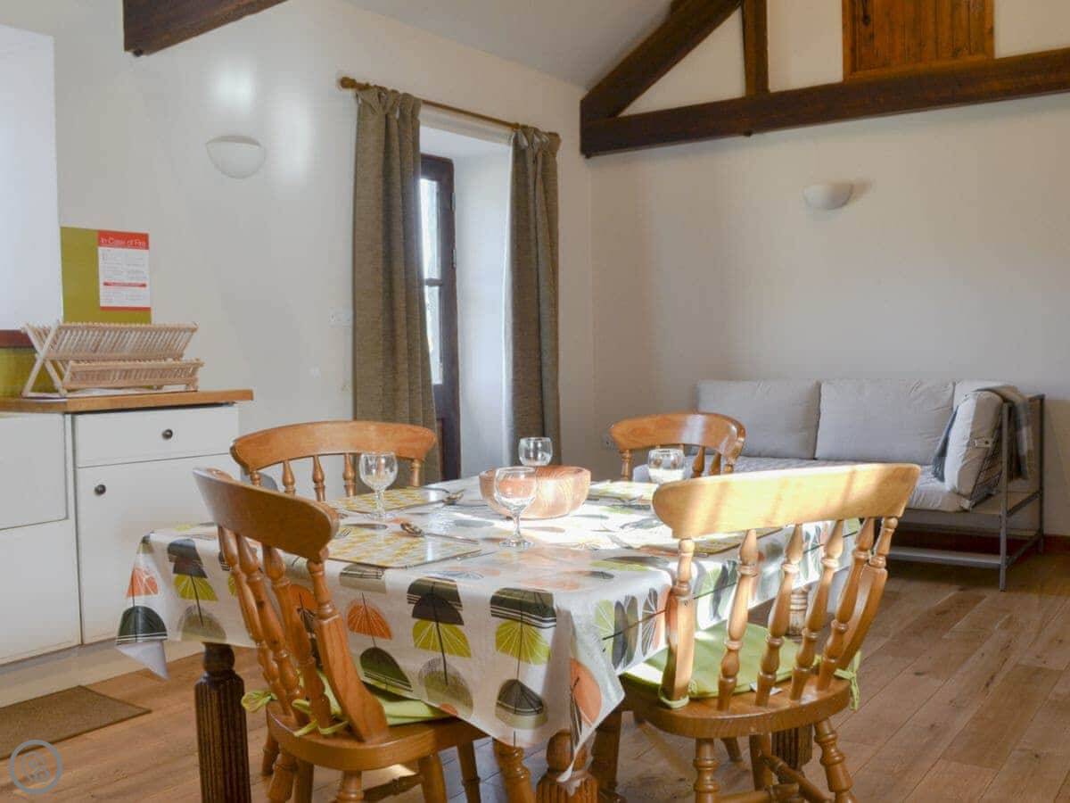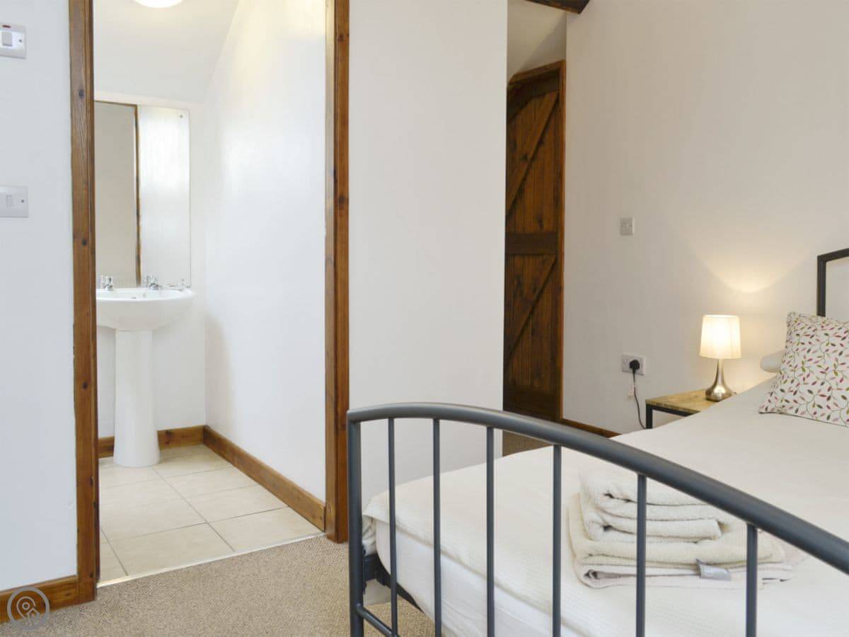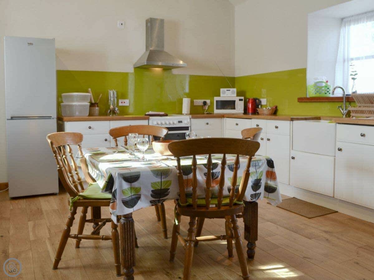 It sleeps four. Two bedrooms, each with its own bathroom, which is handy. It's got a 3 Star rating. It's clean and comfortable, more practical than luxurious. It's a barn conversion, so the ceilings are high. The kitchen is big.