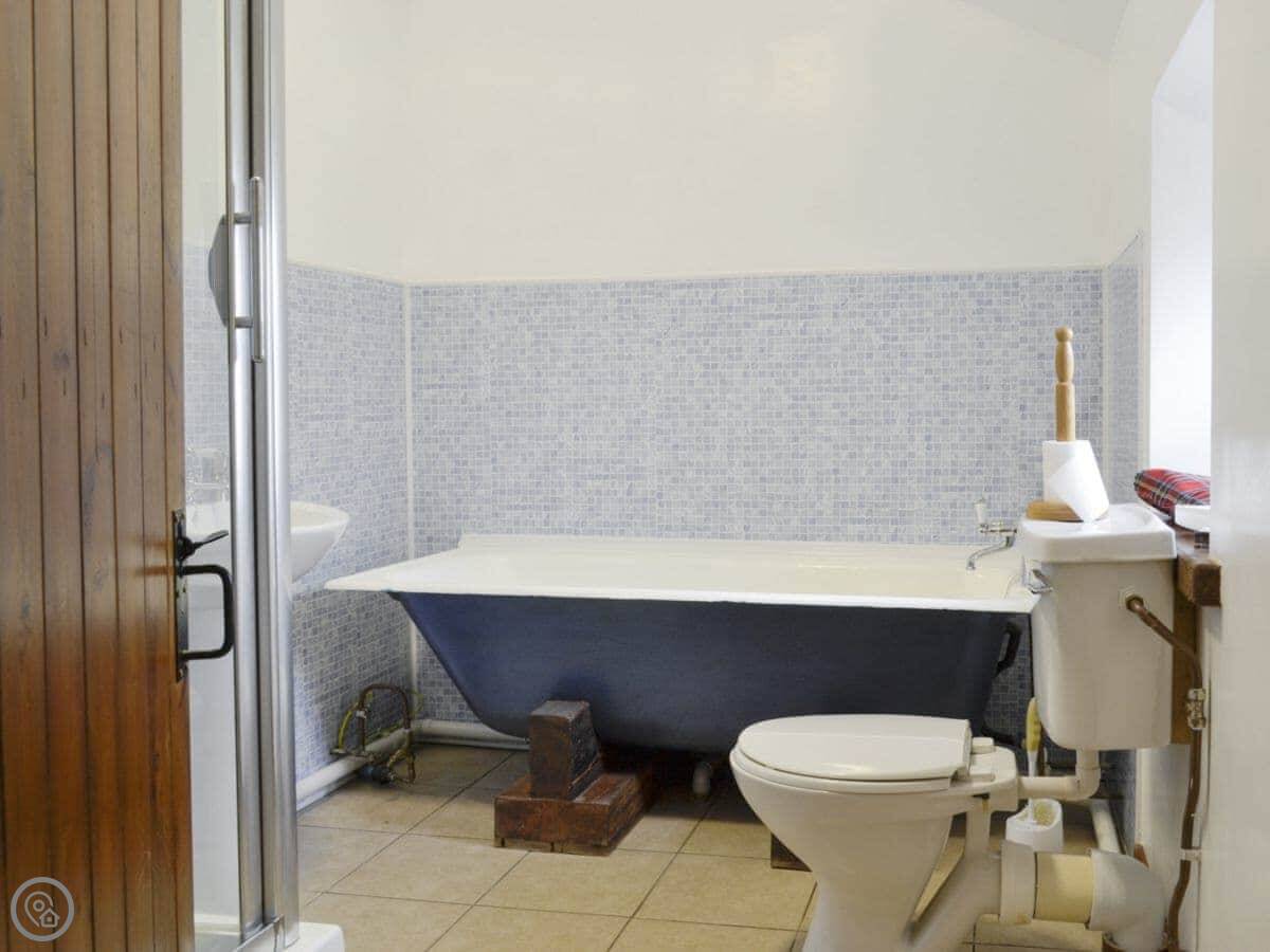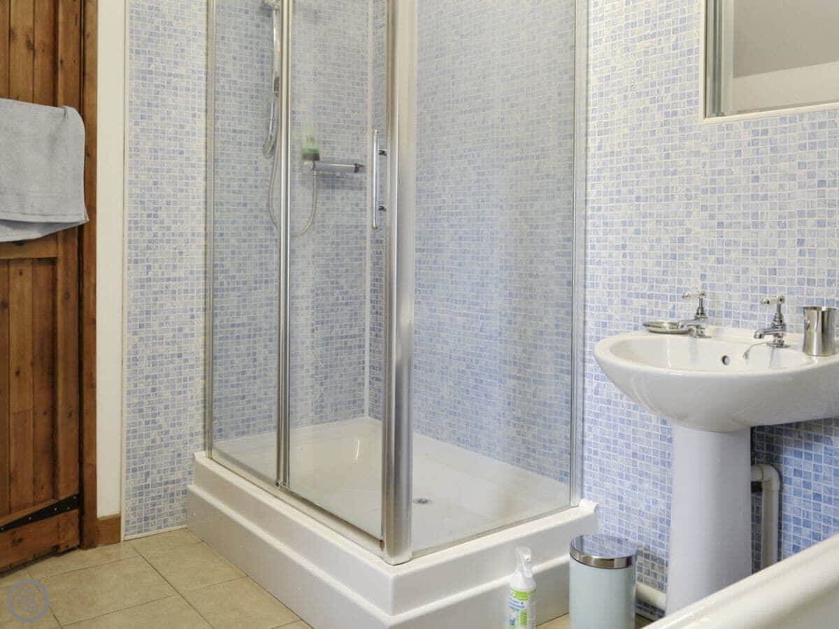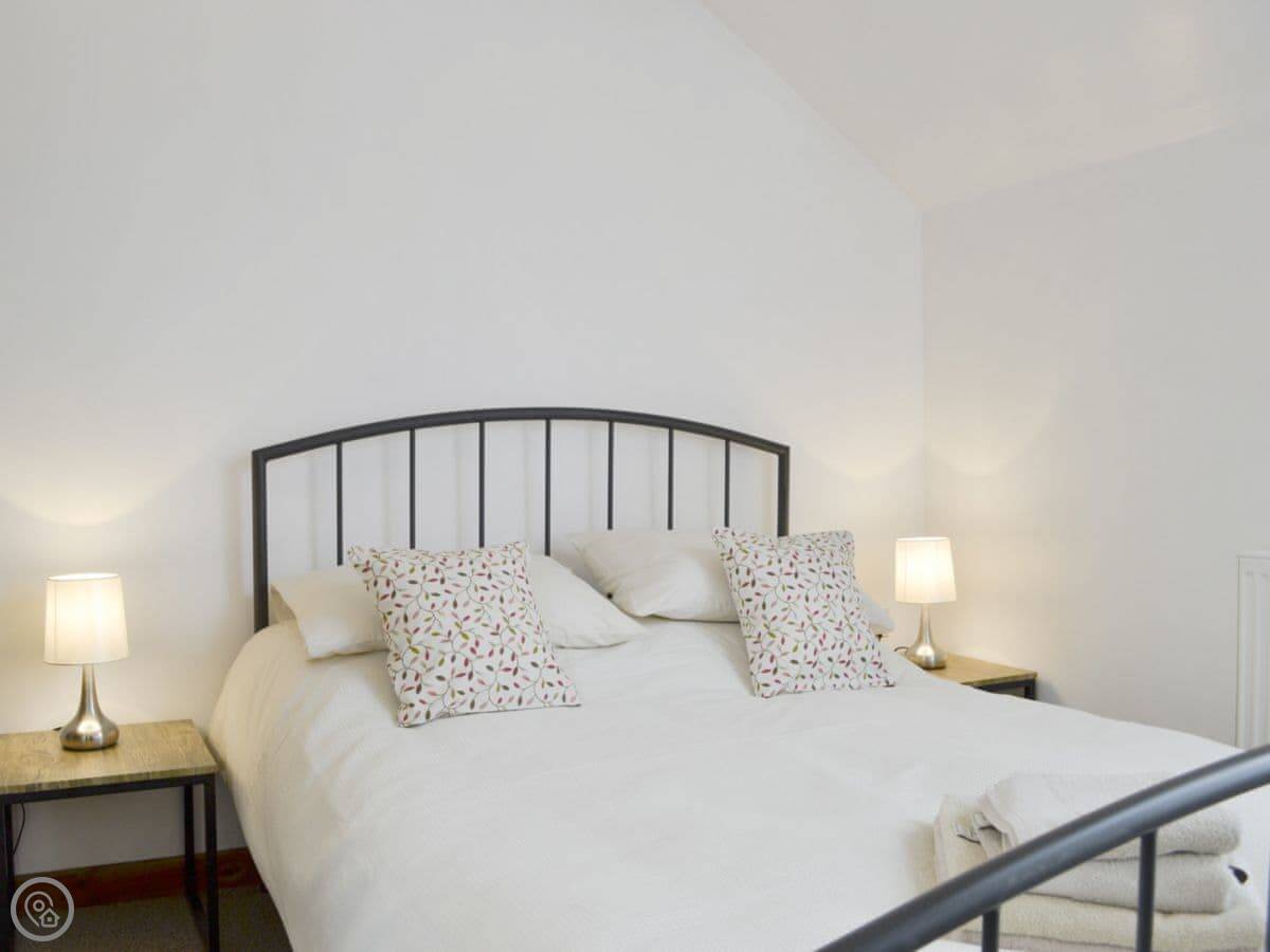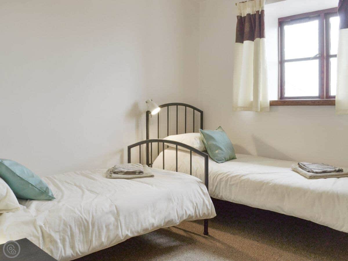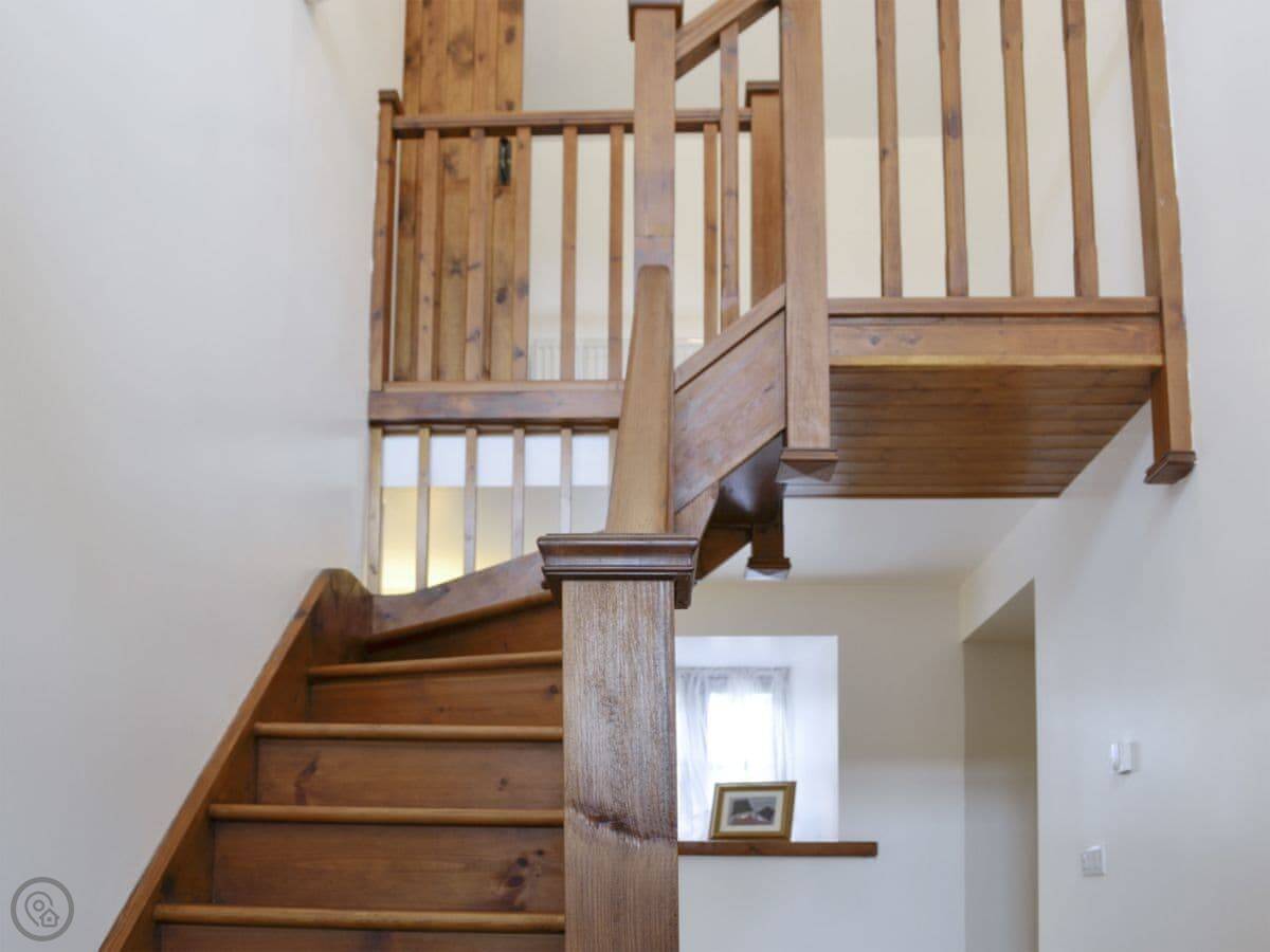 It sleeps four. Two bedrooms, each with its own bathroom, which is handy. It's got a 3 Star rating. It's clean and comfortable, more practical than luxurious. It's a barn conversion, so the ceilings are high. The kitchen is big.