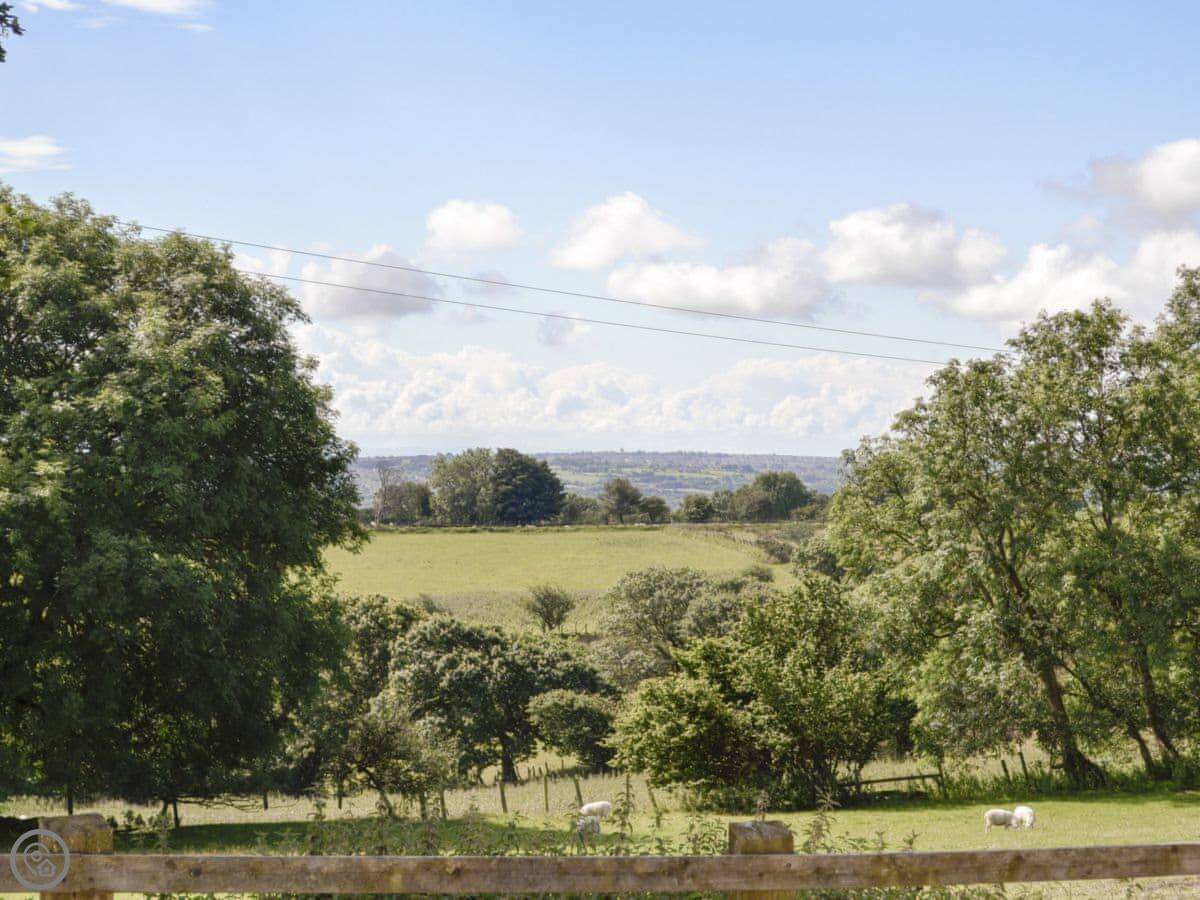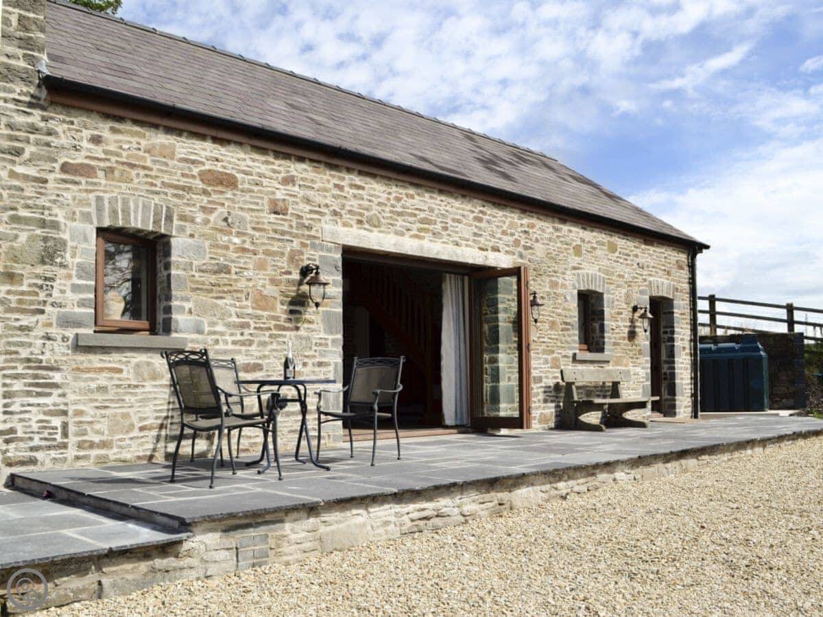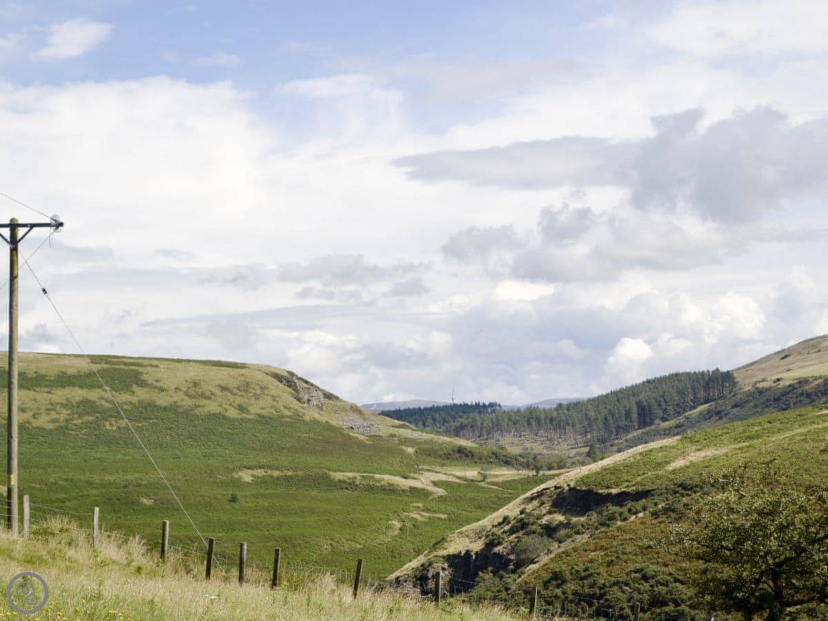 Outside, there's a garden area with a barbecue. You can look out over the fields. You'll see sheep and cattle. The birdlife is good. Red kites are common. You can walk up onto Mynydd y Gwair from the door.