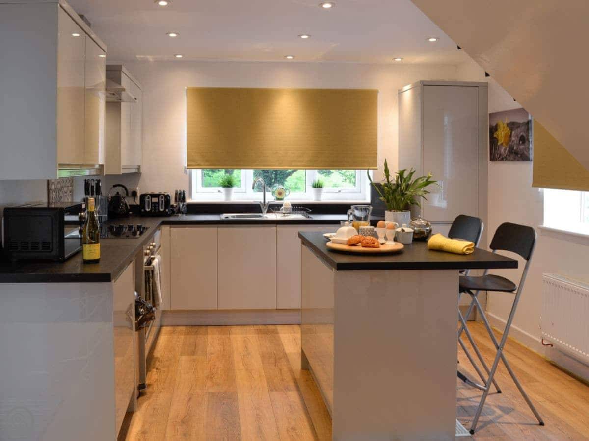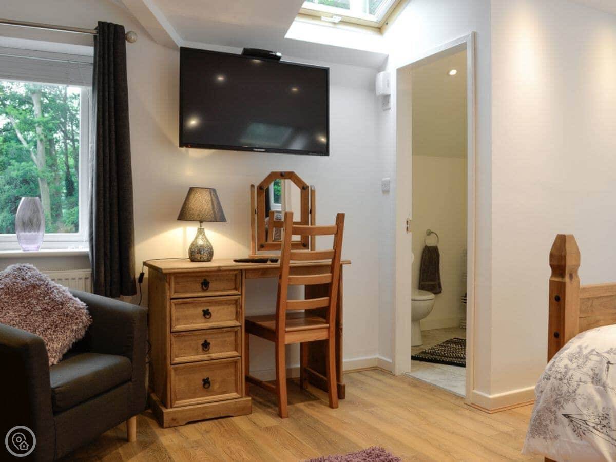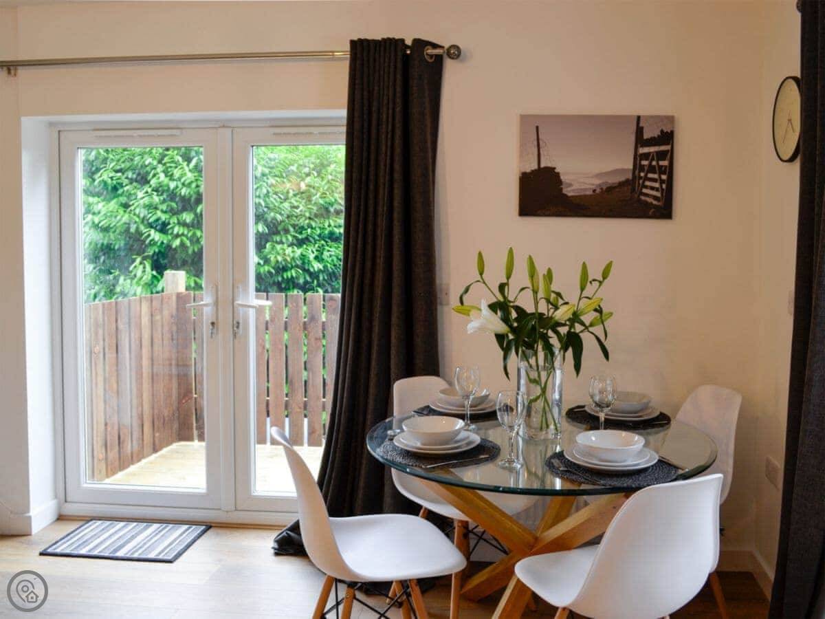 Downstairs is all open plan. There's a wood burner for cooler evenings. French doors open onto the patio, and that's where the hot tub is. The garden is yours to use.