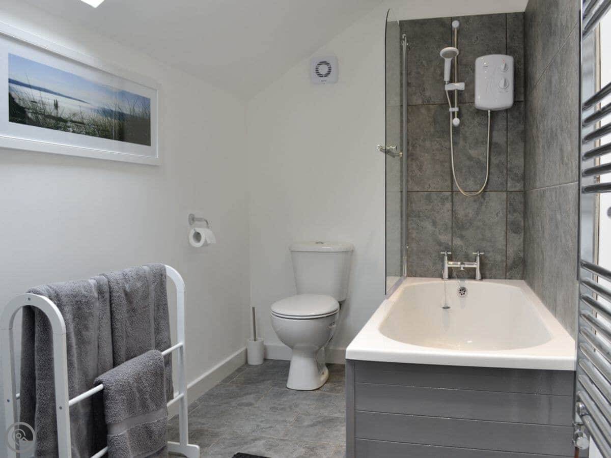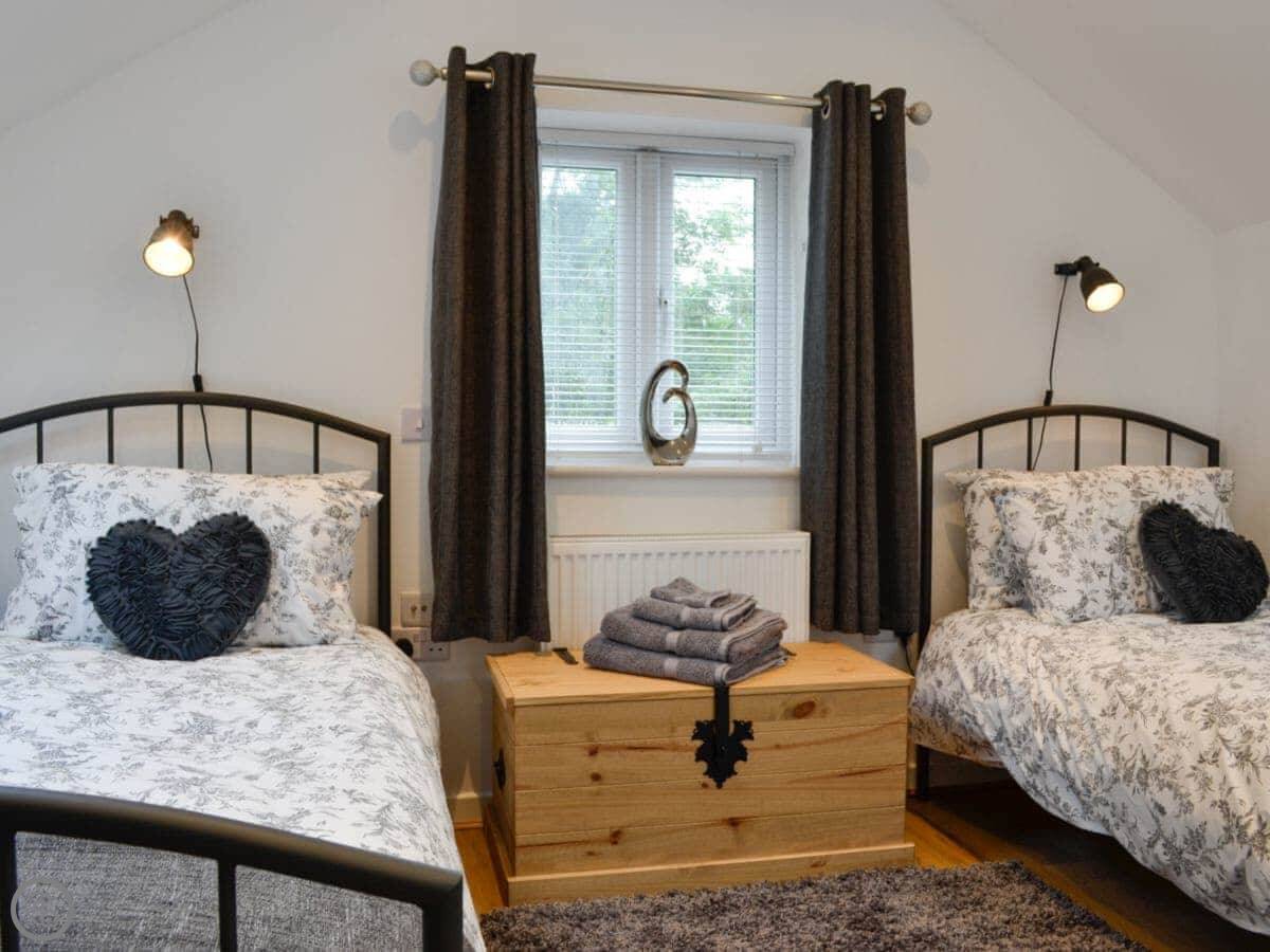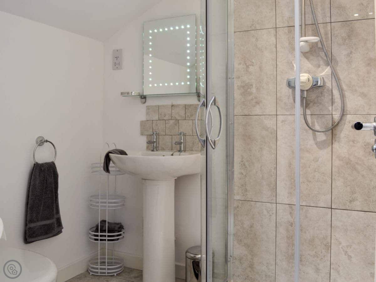 This is Bryn Aled. It's a detached place next to our house, out near Brithdir in Gwynedd. It sleeps four, in two bedrooms, and each bedroom has its own bathroom. It's got a 5 Star rating, which means it's well-equipped and comfortable.