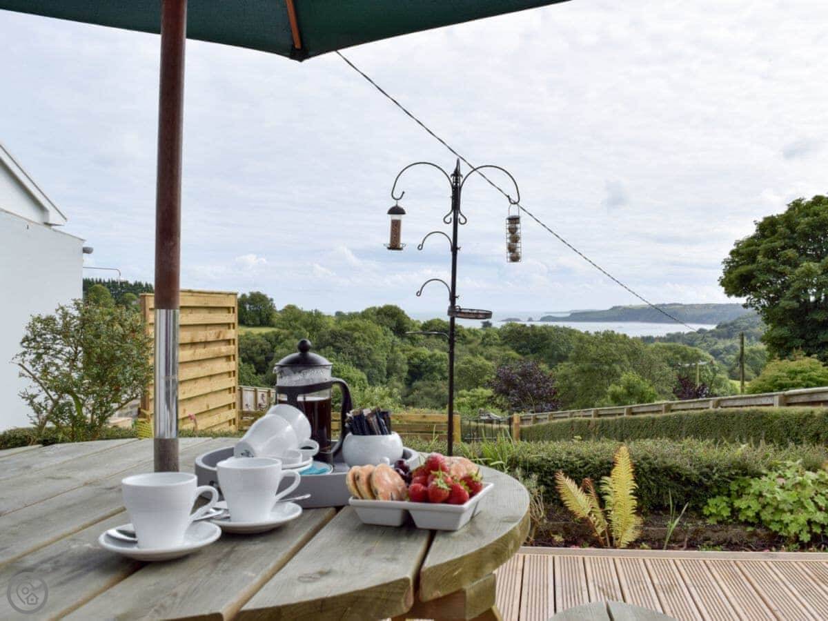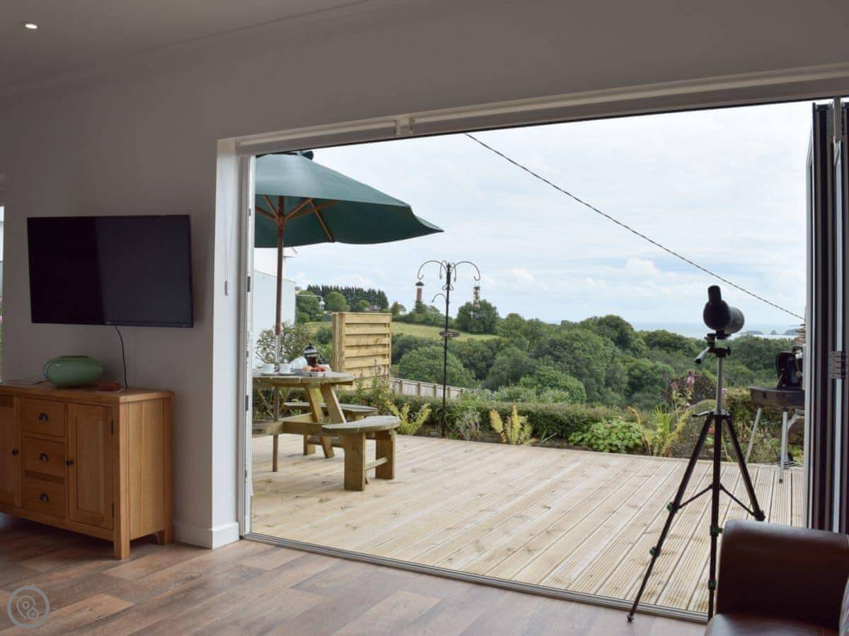 The main thing is the view. You look out over the fields to Saundersfoot Bay and Caldey Island. You can see it from the living area and the decking. The deck has a private hot tub.