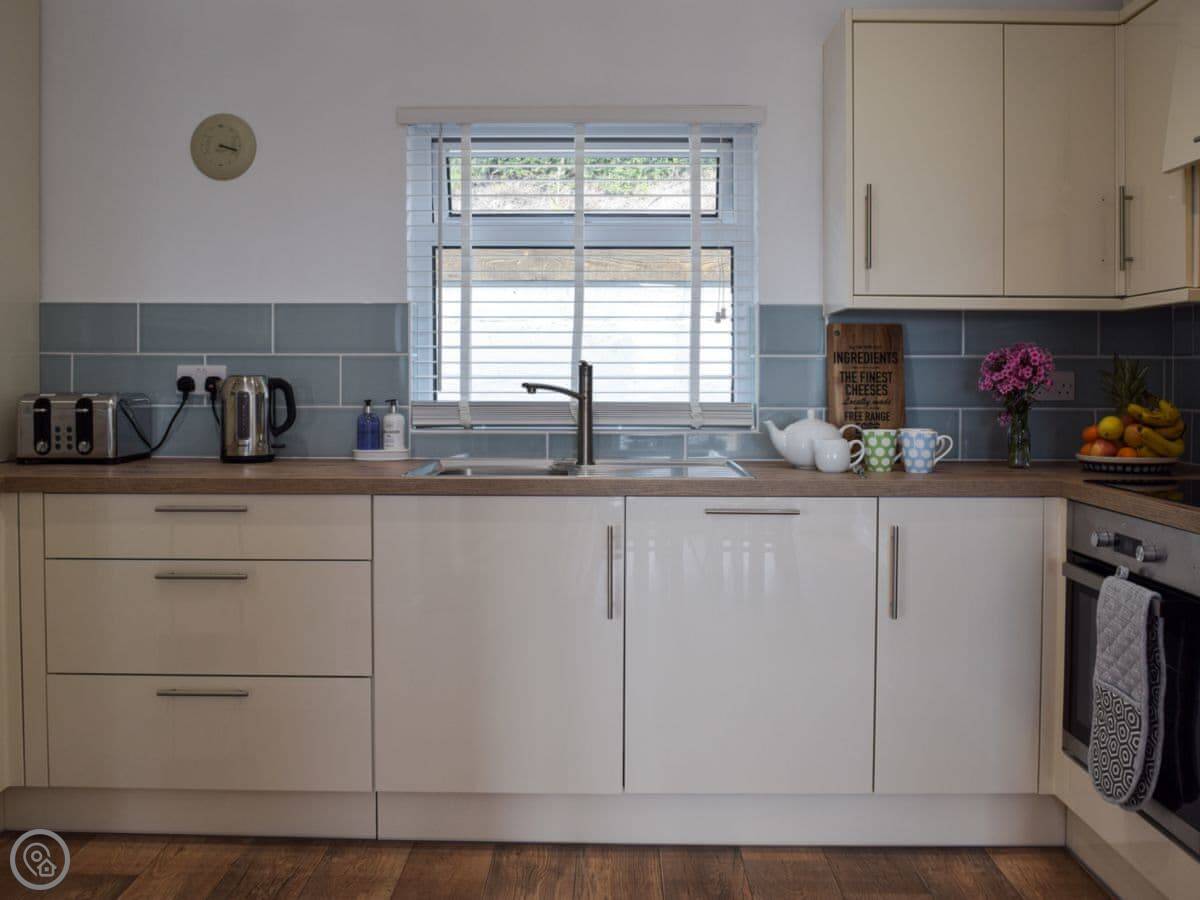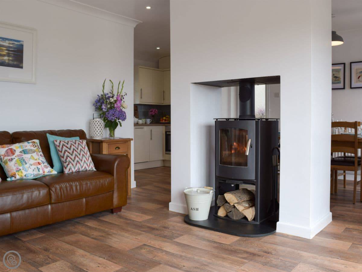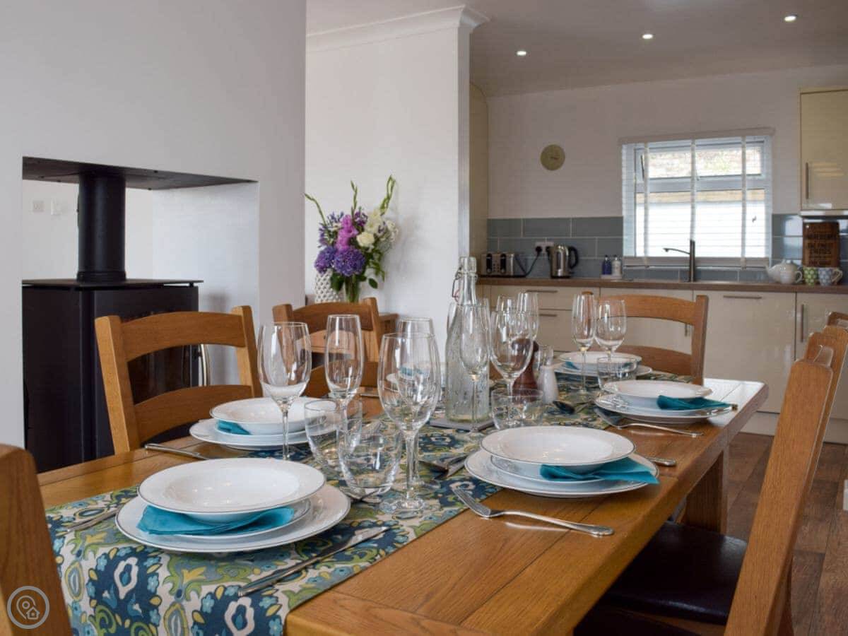 Inside, it's open plan. There's a wood burner between the living and dining area. The kitchen is a galley style, it's fine for cooking. There’s a dishwasher and a washing machine. Bedding and towels are included. You can bring two dogs.