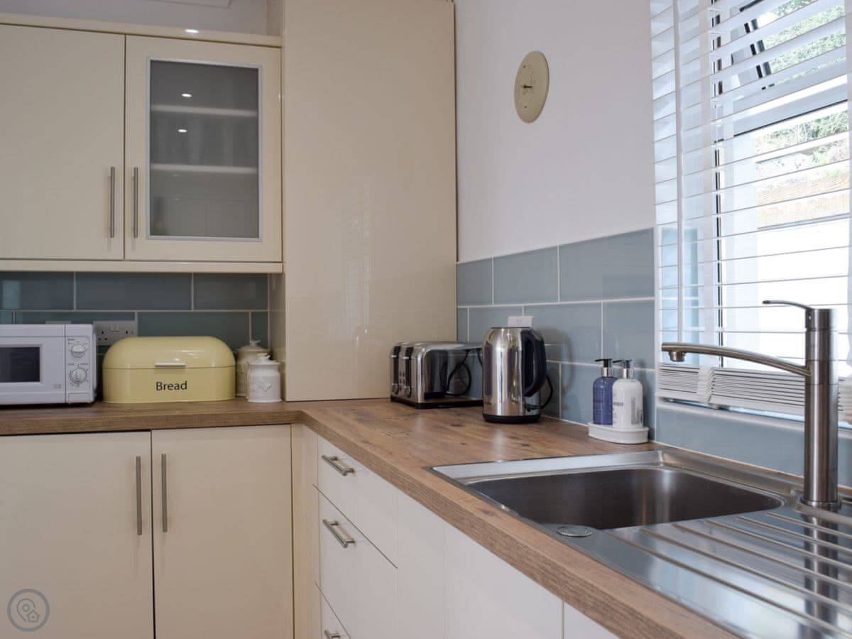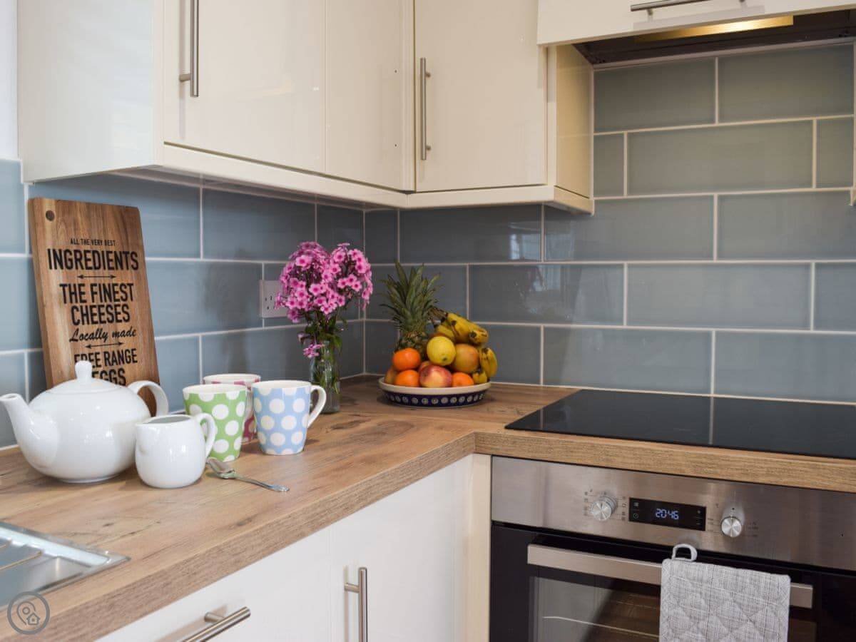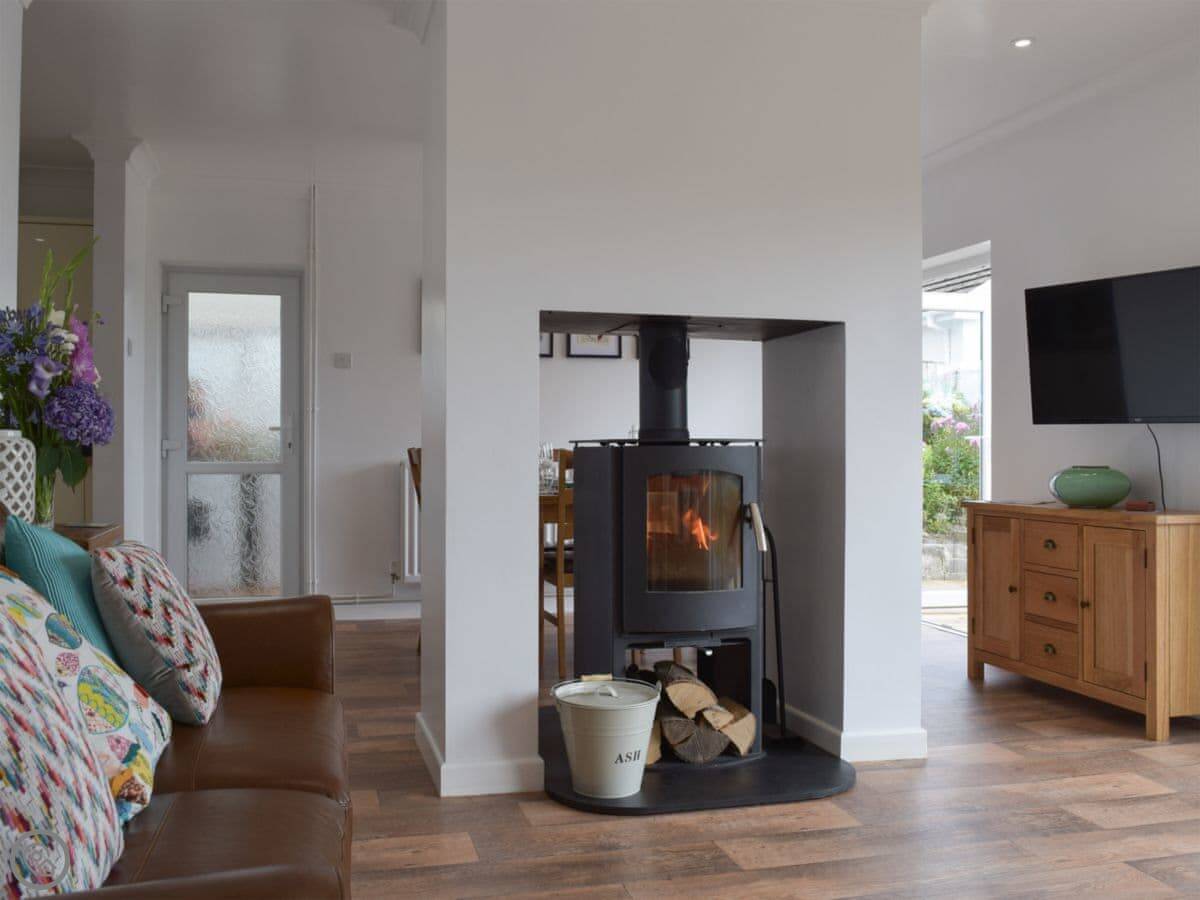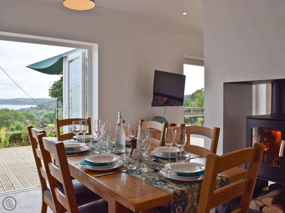 Inside, it's open plan. There's a wood burner between the living and dining area. The kitchen is a galley style, it's fine for cooking. There’s a dishwasher and a washing machine. Bedding and towels are included. You can bring two dogs.