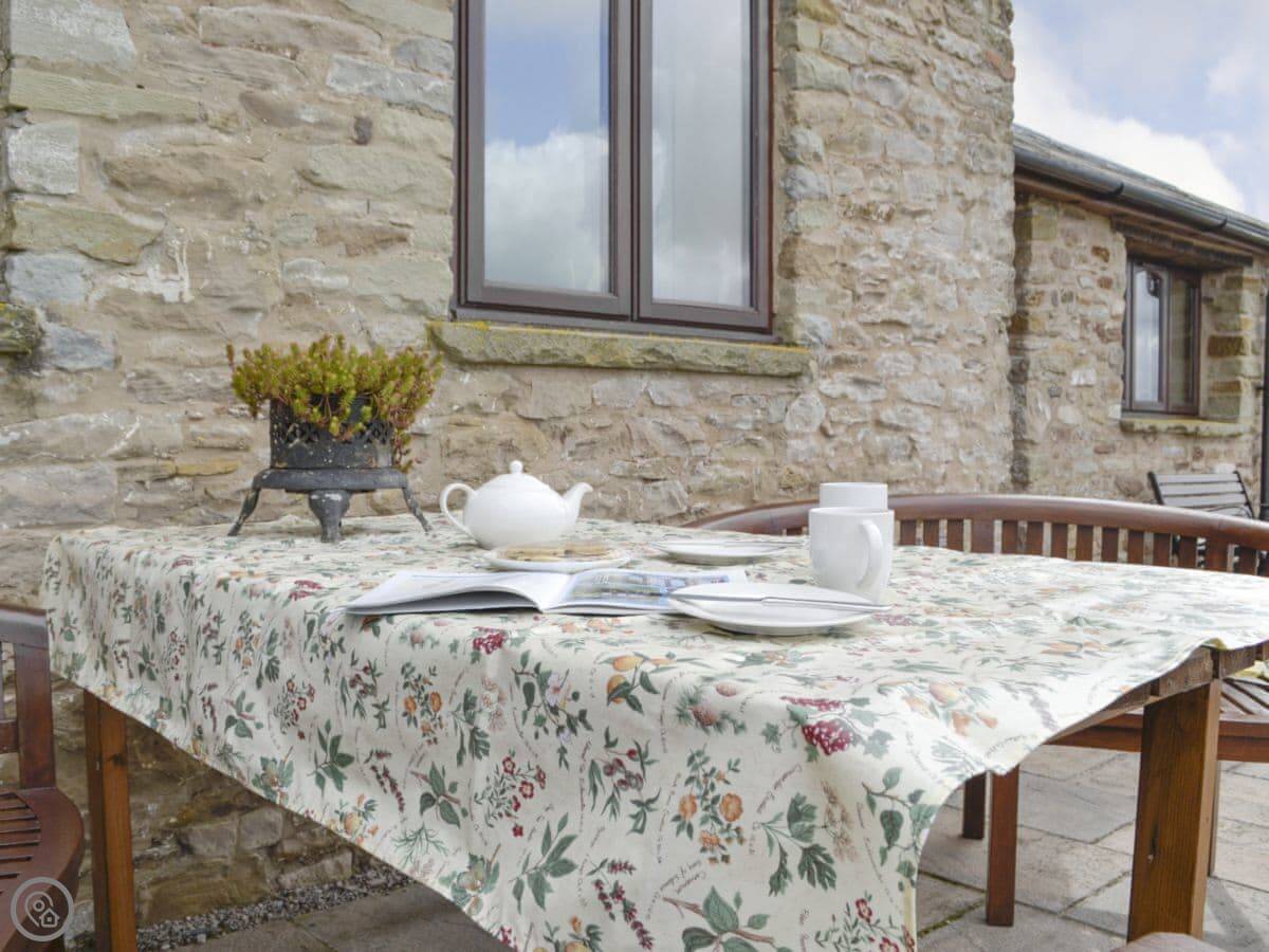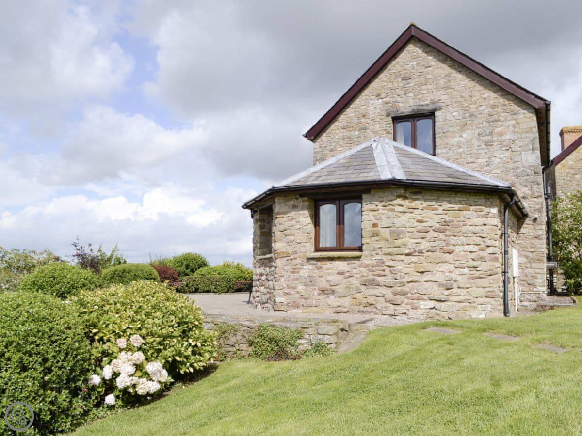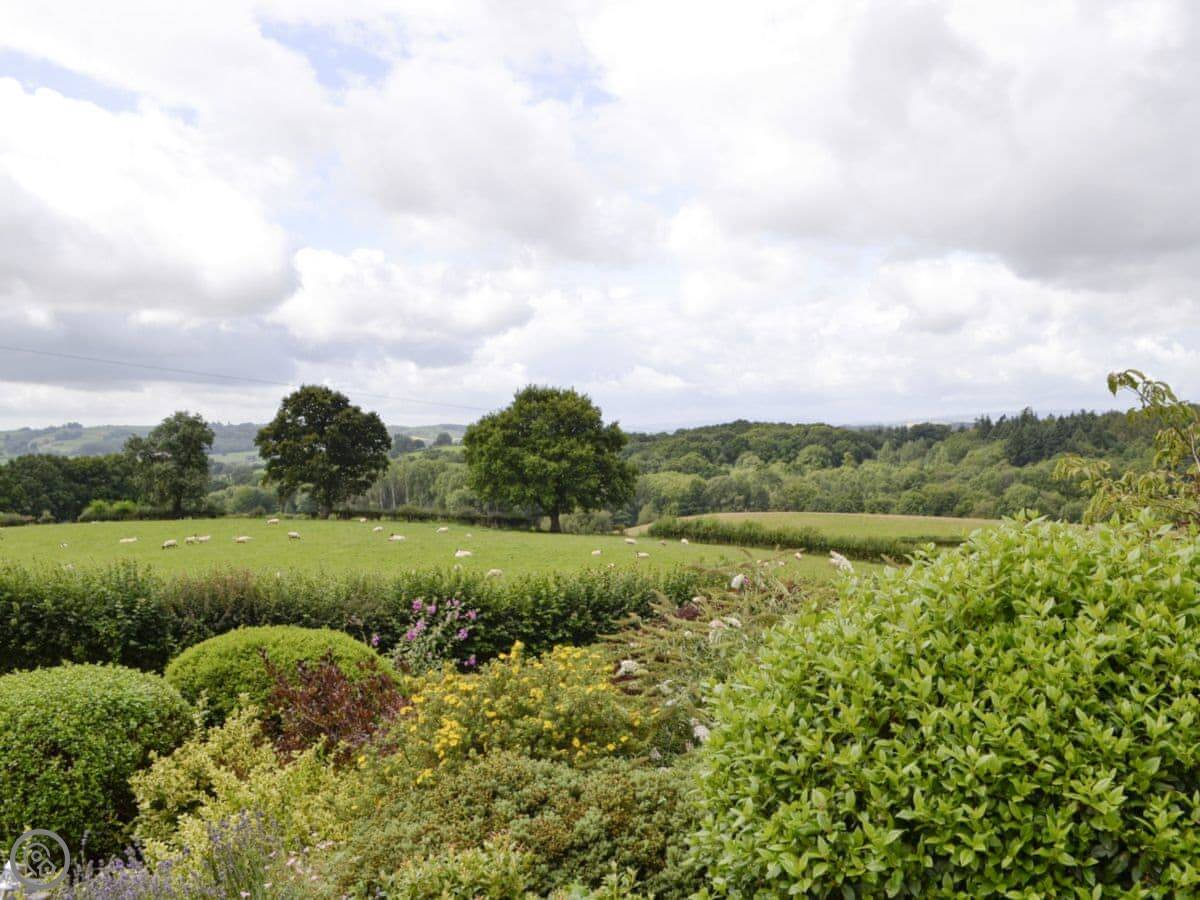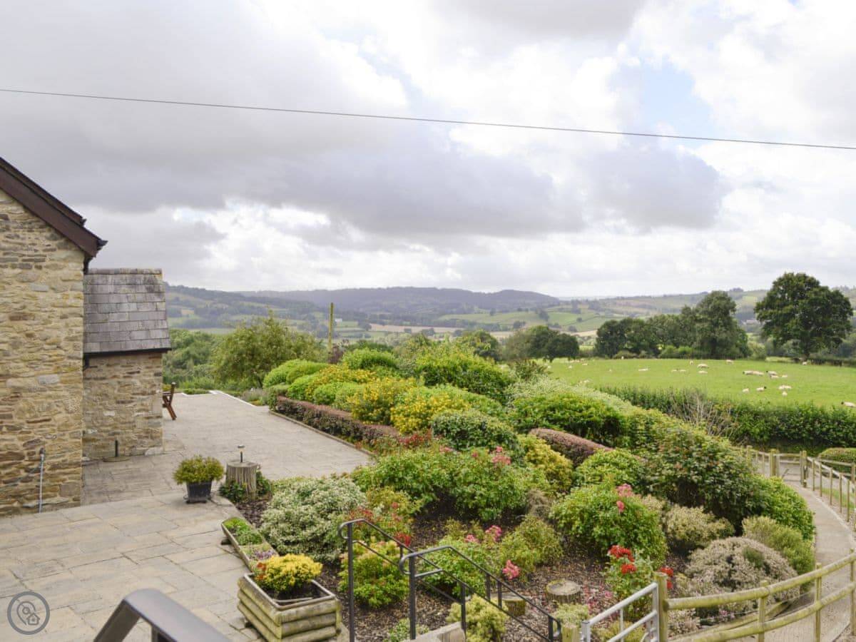 The main thing is the view. You look out from the back over fields and hills towards the Brecon Beacons. You can see Pen-y-Fan on a clear day. The terrace gets the sun all afternoon. The garden was designed by a Chelsea gold medal winner, so it attracts a lot of birds and butterflies.
