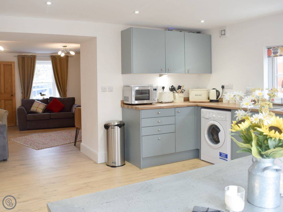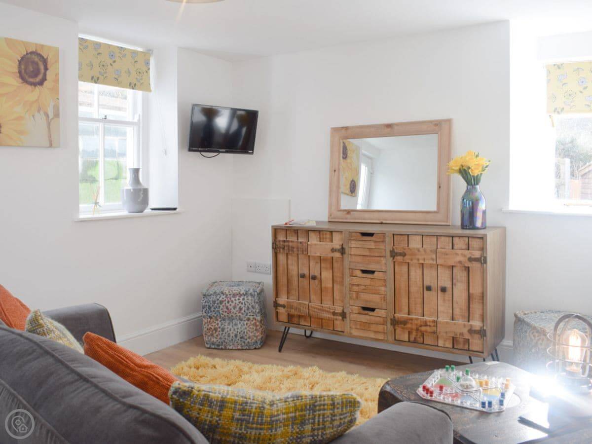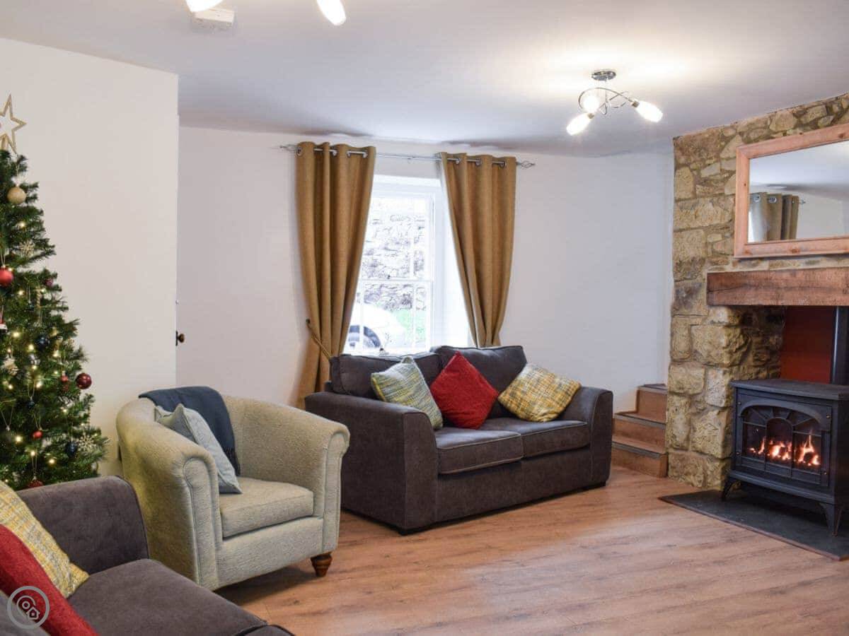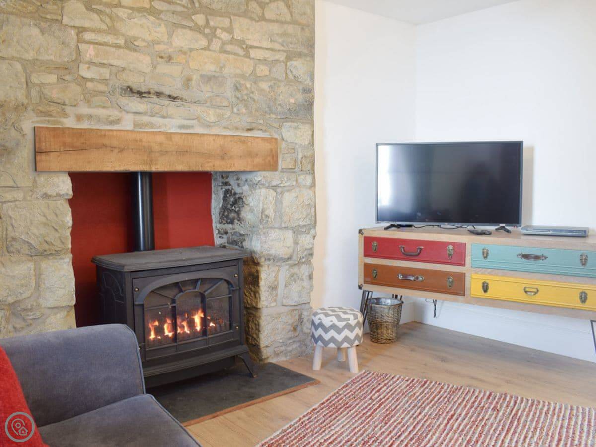 It sleeps five. There are three bedrooms upstairs with a family bathroom. Downstairs, there's a shower room too, which is handy. The main living room has the fireplace with a gas stove. Off that, there's a smaller snug room with another sofa and TV. The kitchen is open plan and leads out through French doors to the garden. The garden is enclosed, which is good if you have kids or a dog. We allow up to two dogs.
