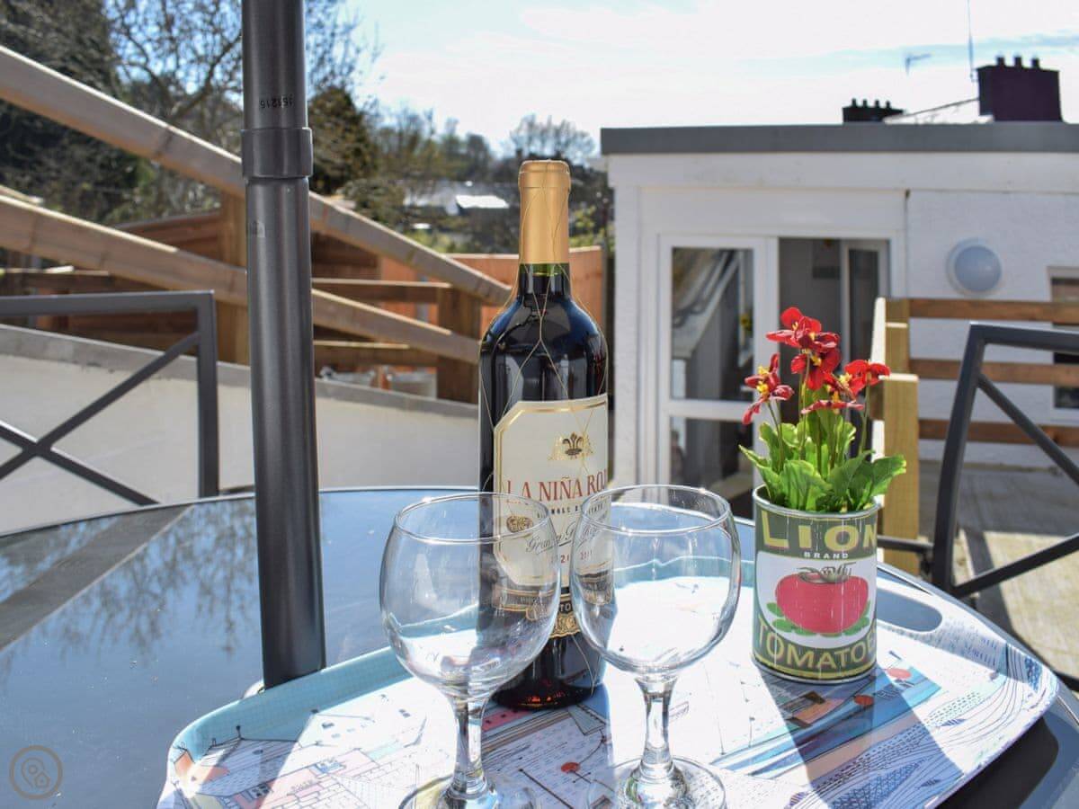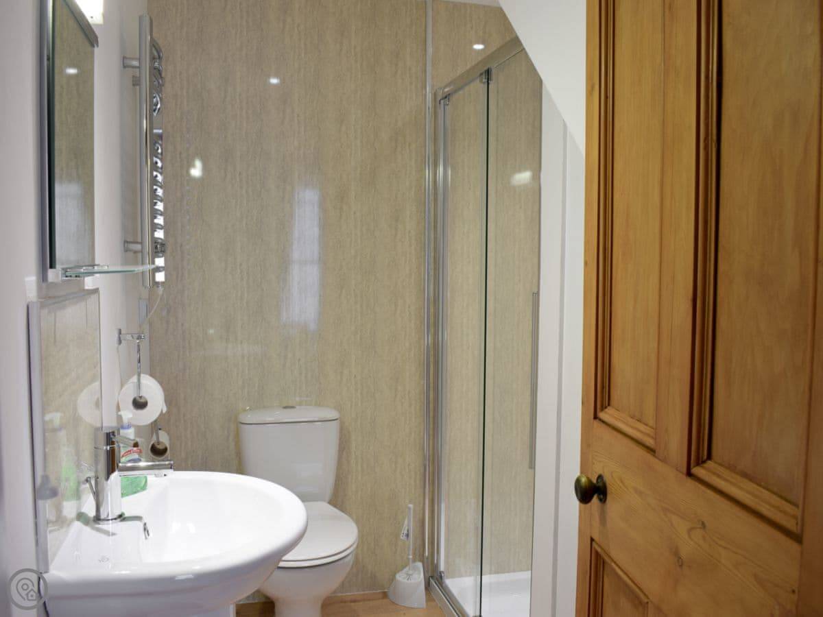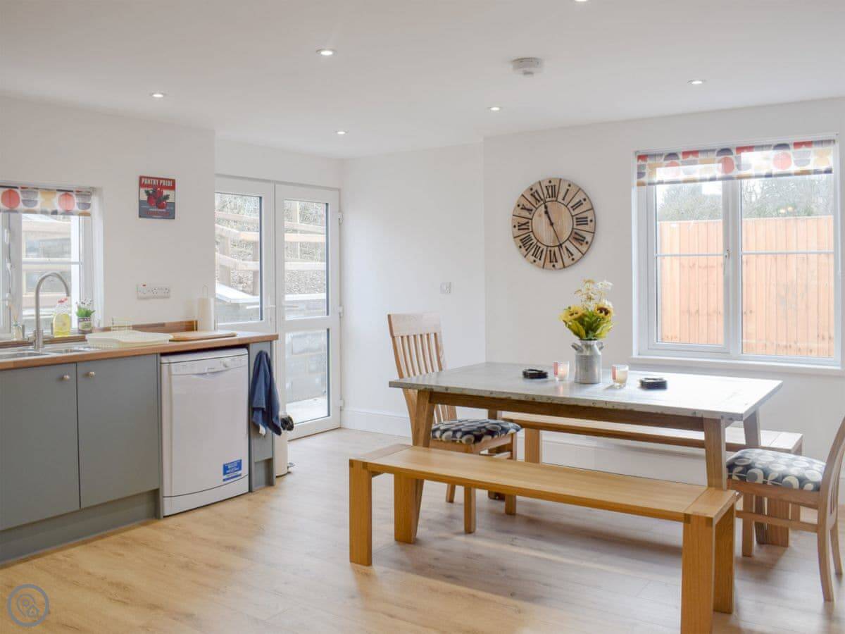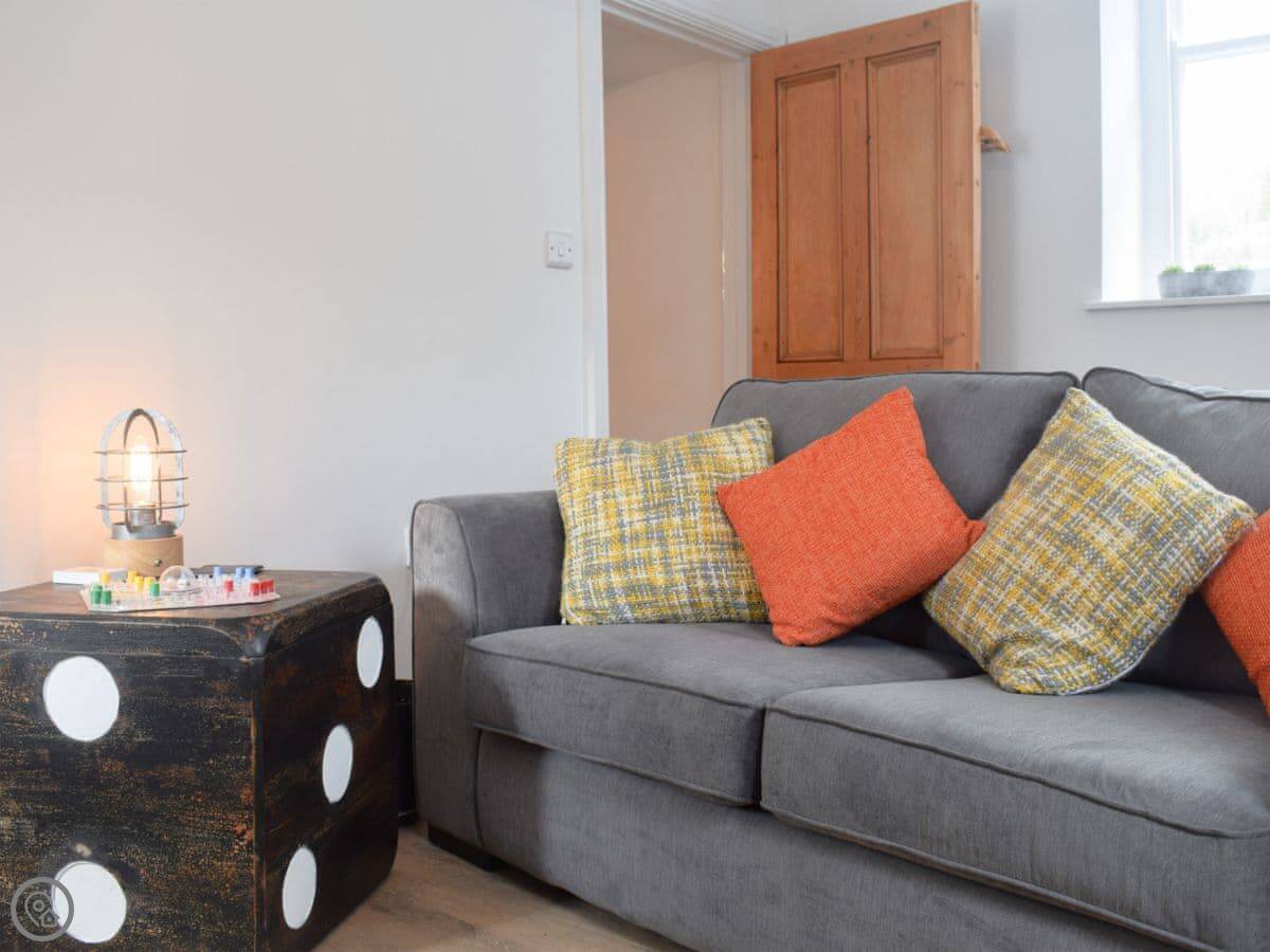 It sleeps five. There are three bedrooms upstairs with a family bathroom. Downstairs, there's a shower room too, which is handy. The main living room has the fireplace with a gas stove. Off that, there's a smaller snug room with another sofa and TV. The kitchen is open plan and leads out through French doors to the garden. The garden is enclosed, which is good if you have kids or a dog. We allow up to two dogs.