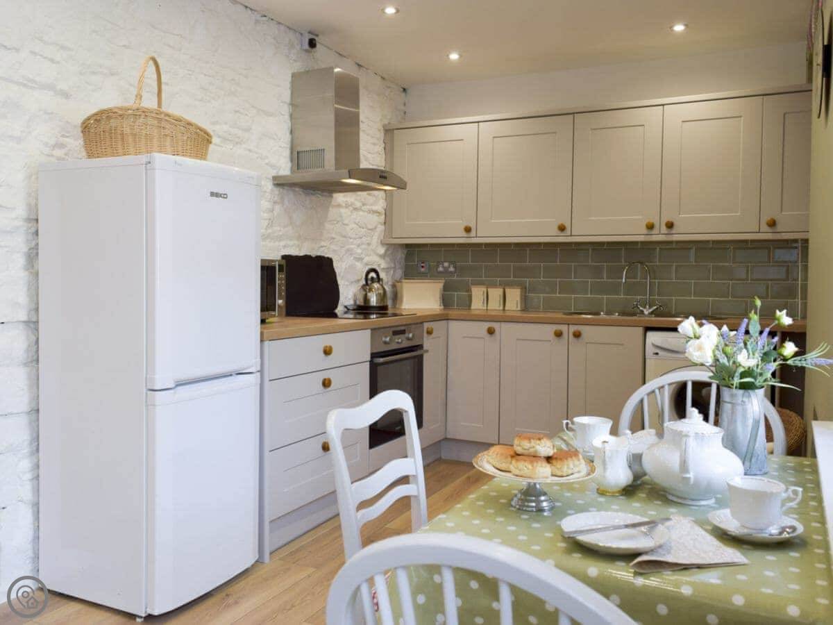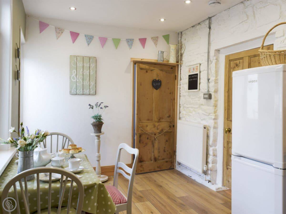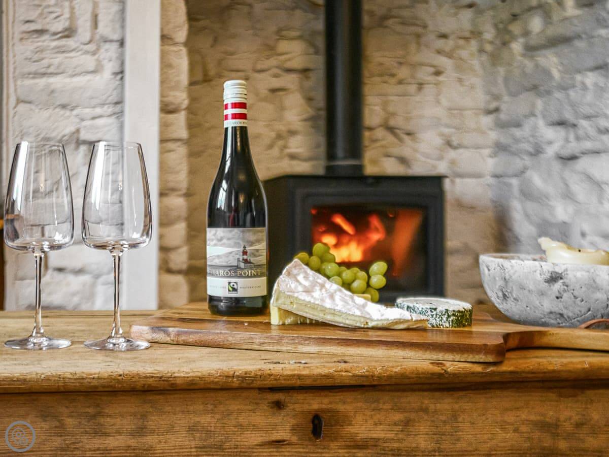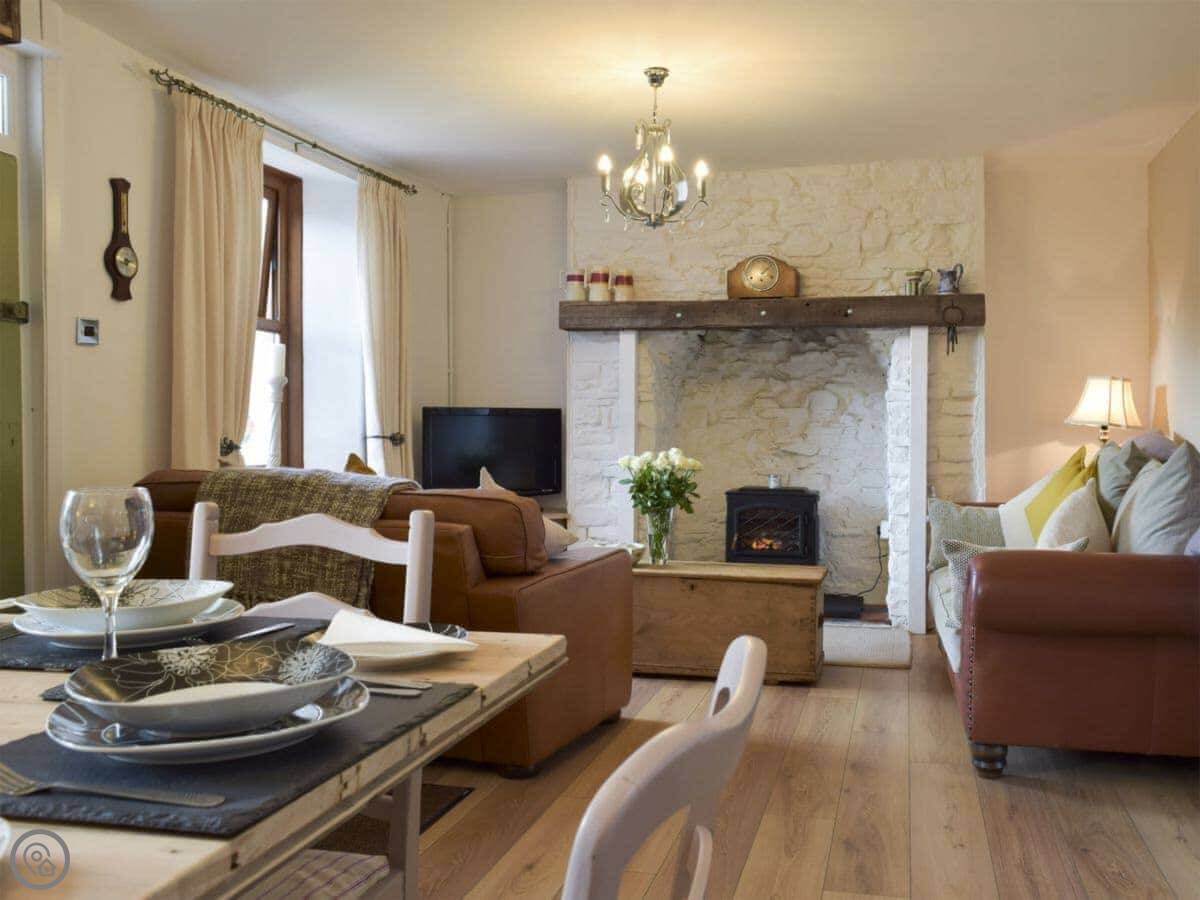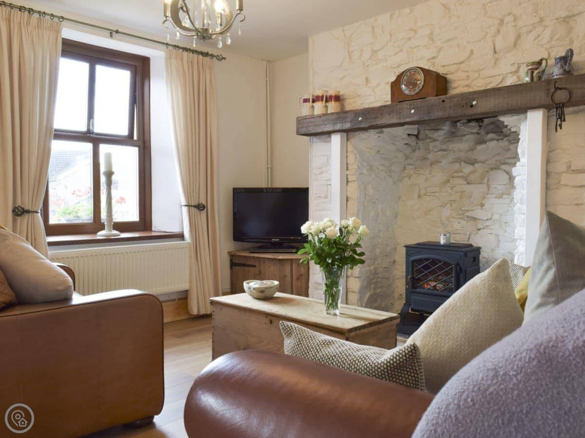 In terms of things here, there's a washing machine, a wood burner, WiFi, and TV. Bedding and towels are included. There's a cot and a highchair if you need them. The garden is out the back, it's enclosed. You can bring two dogs.