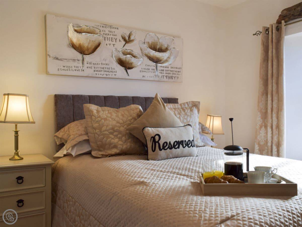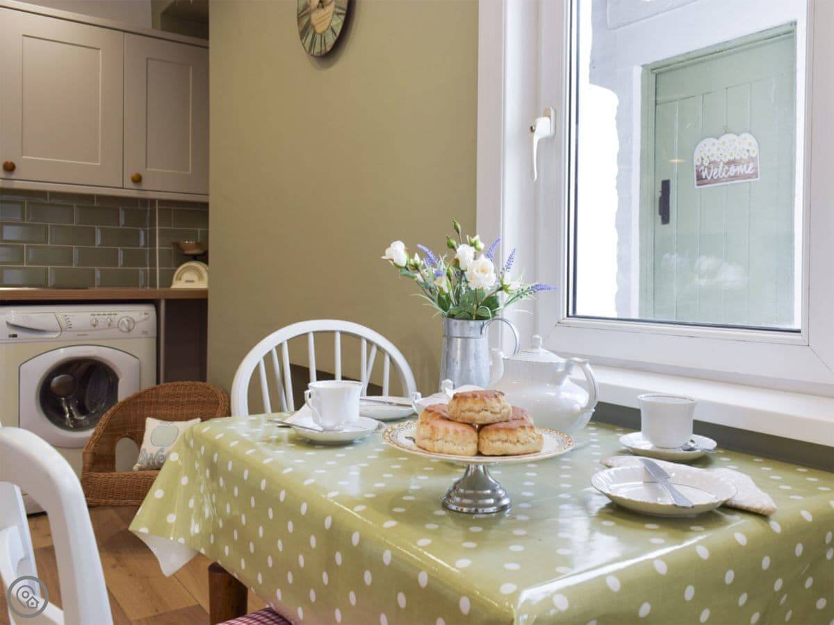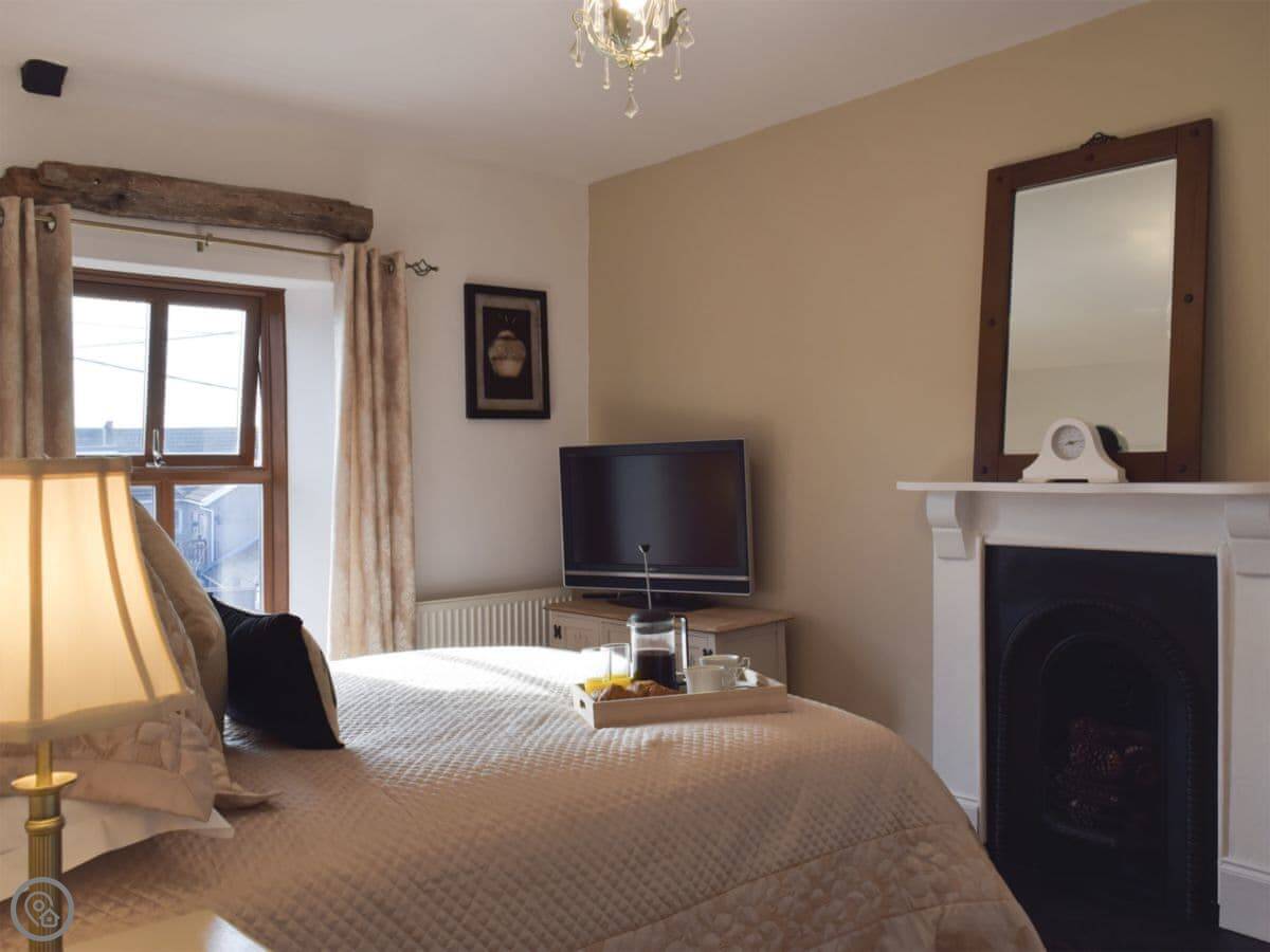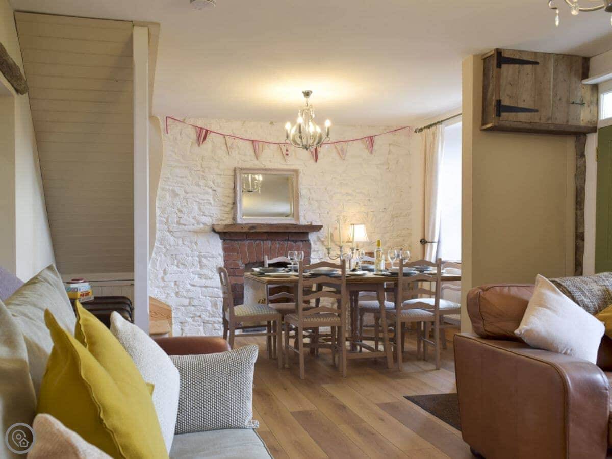 In terms of things here, there's a washing machine, a wood burner, WiFi, and TV. Bedding and towels are included. There's a cot and a highchair if you need them. The garden is out the back, it's enclosed. You can bring two dogs.