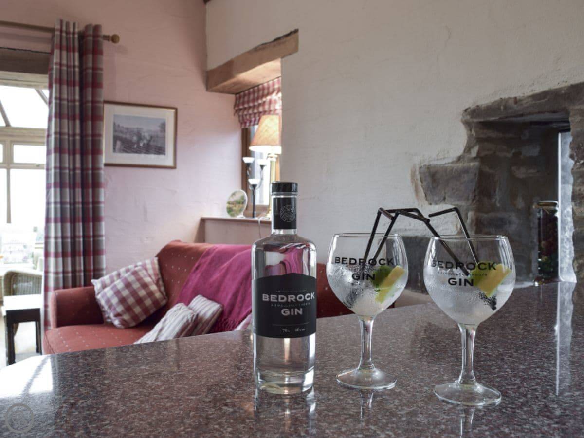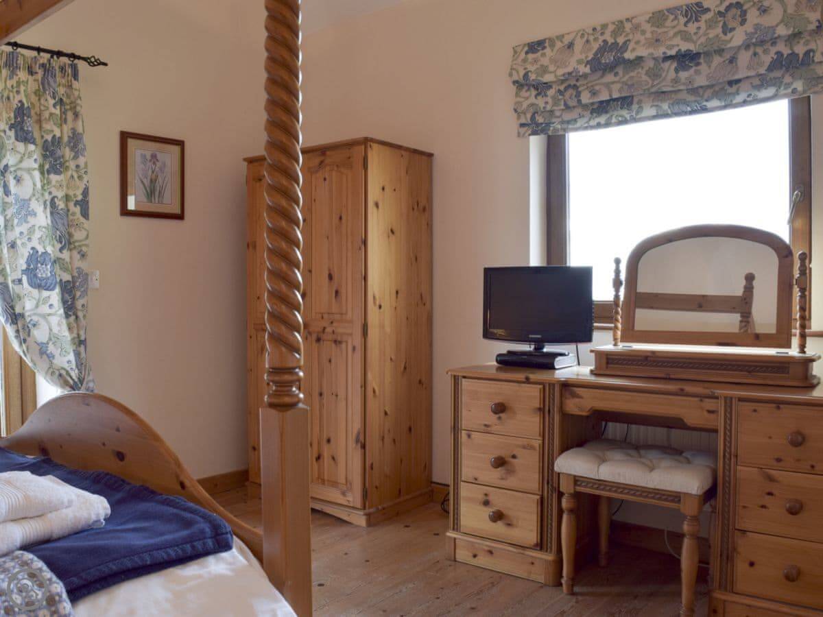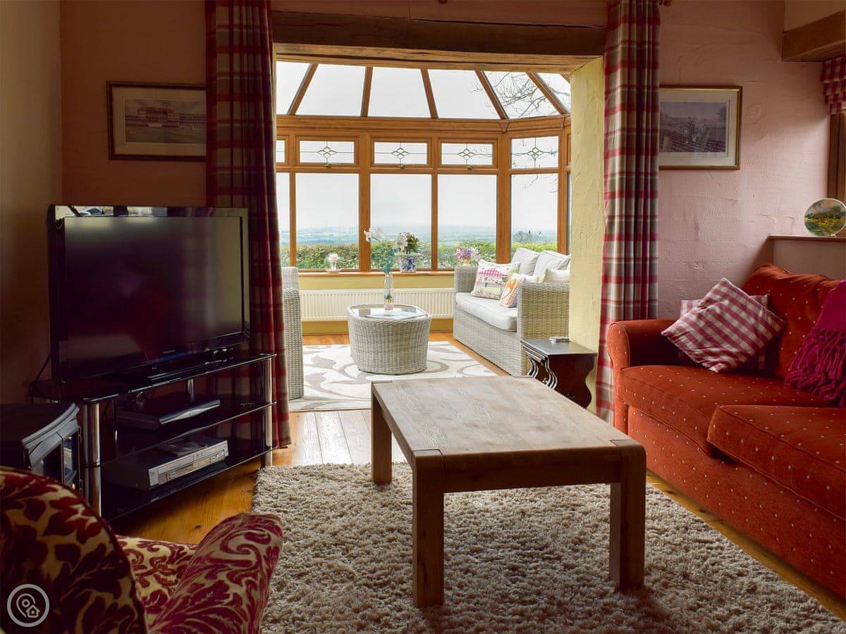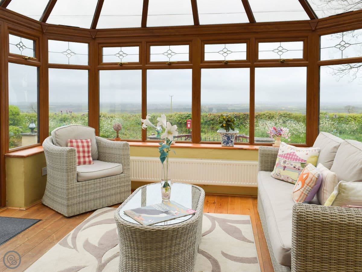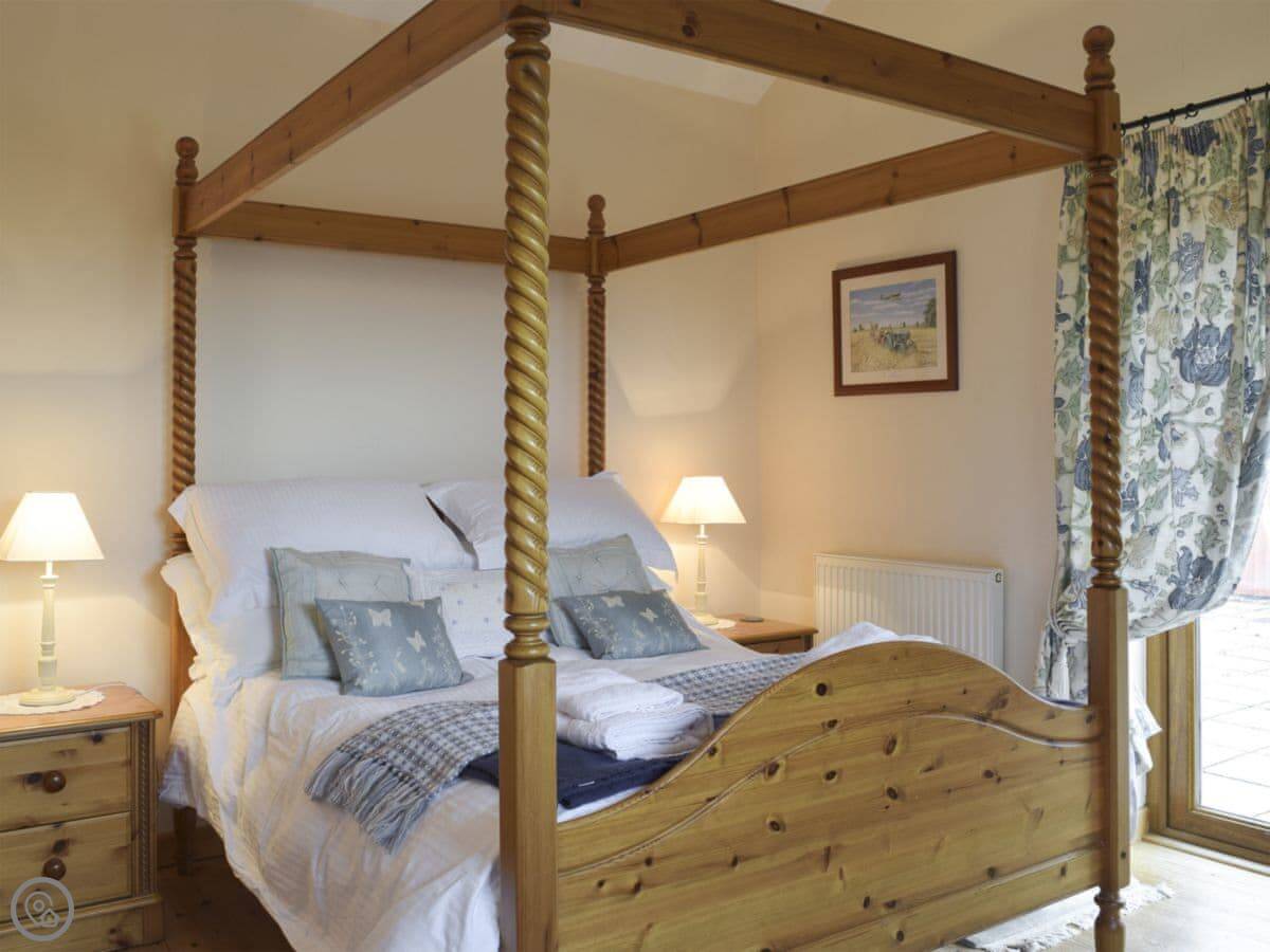 It sleeps four. Two bedrooms, both with their own en-suite bathrooms. One has a four-poster bed. It's a 4 Star place, so it's well looked after and comfortable. The main room is open-plan, kitchen and living area, with a conservatory on the end. The conservatory faces south so it gets the sun. There's a patio outside with a BBQ.