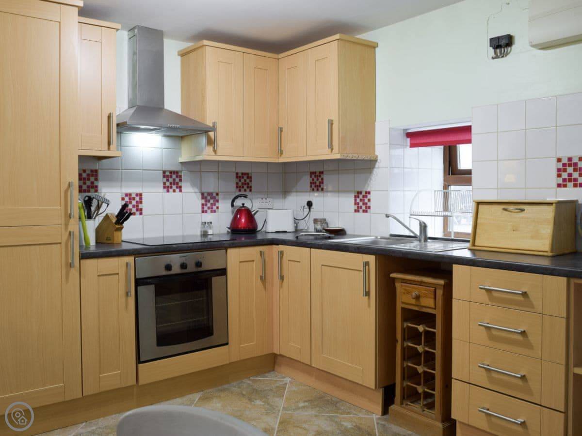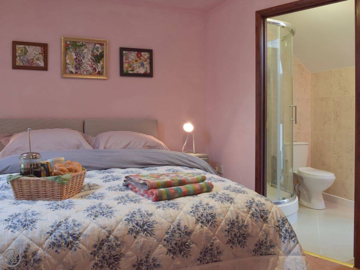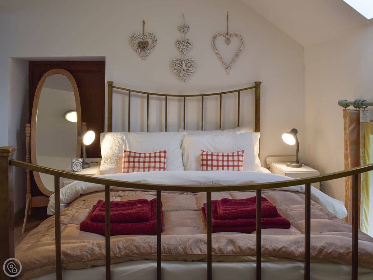 It sleeps four. Two bedrooms, and each one has its own bathroom, which is handy. It's 4 Star, so it's comfortable and everything works. It's open plan downstairs. The ceiling is vaulted because it was a granary, so the space feels quite big.