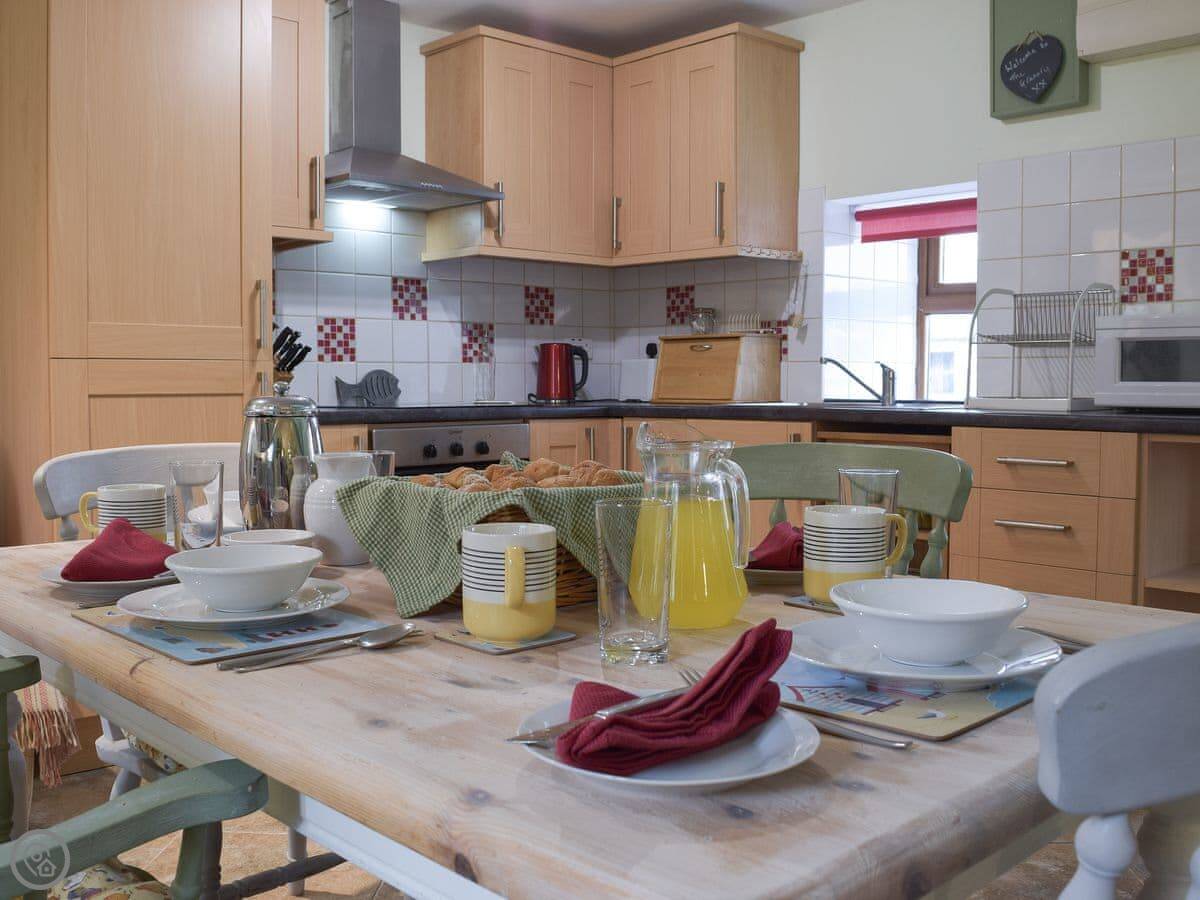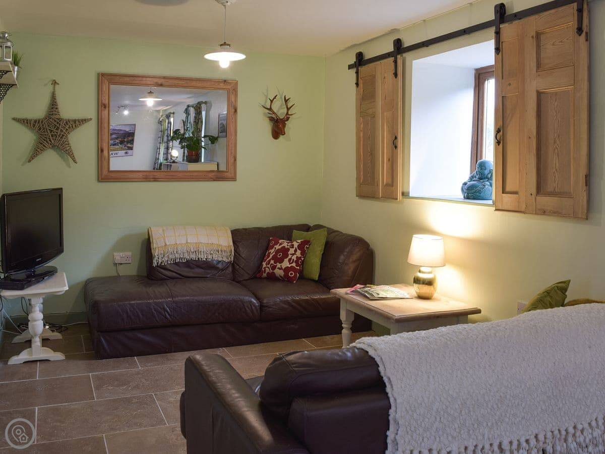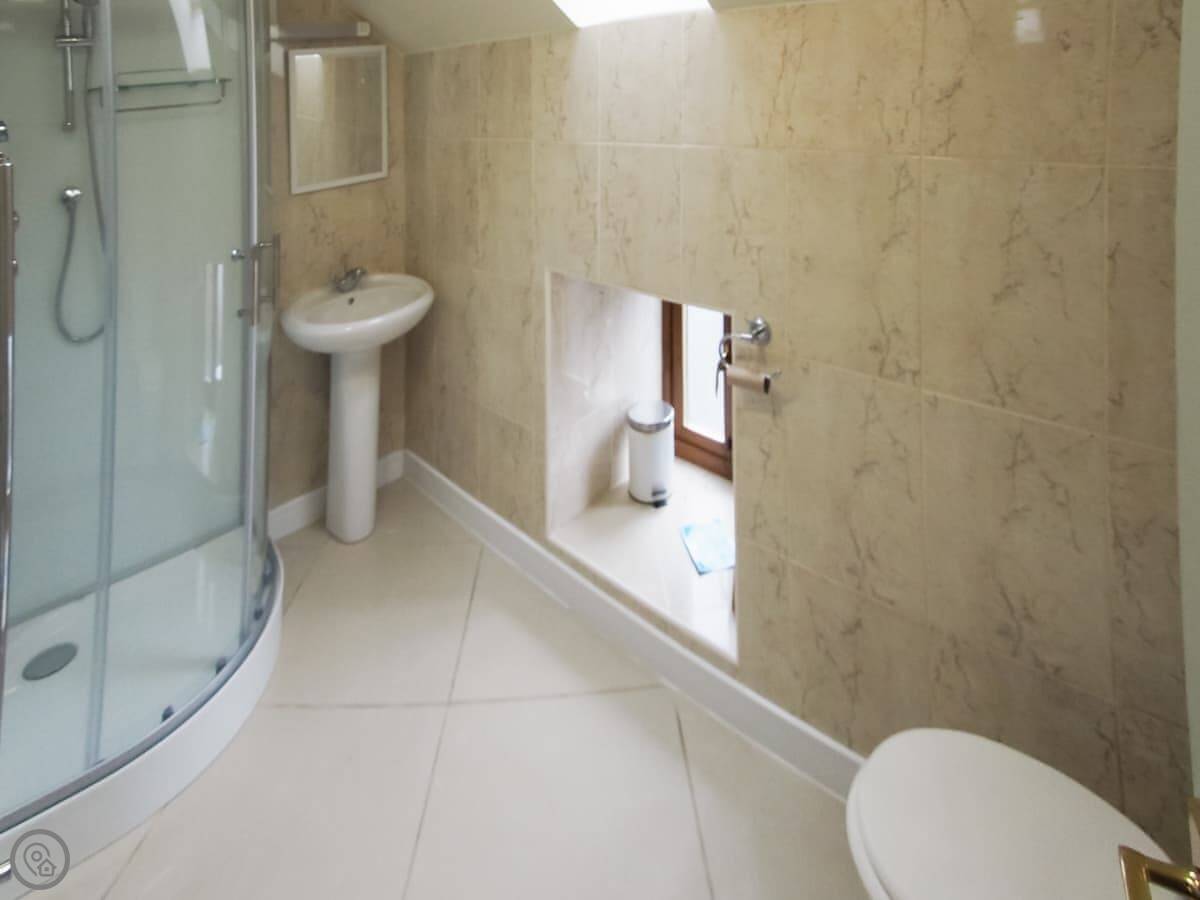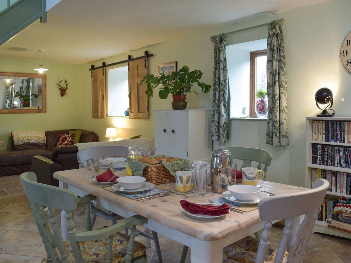 It sleeps four. Two bedrooms, and each one has its own bathroom, which is handy. It's 4 Star, so it's comfortable and everything works. It's open plan downstairs. The ceiling is vaulted because it was a granary, so the space feels quite big.