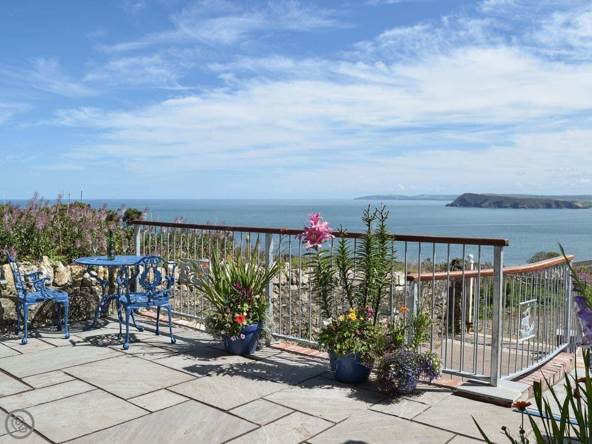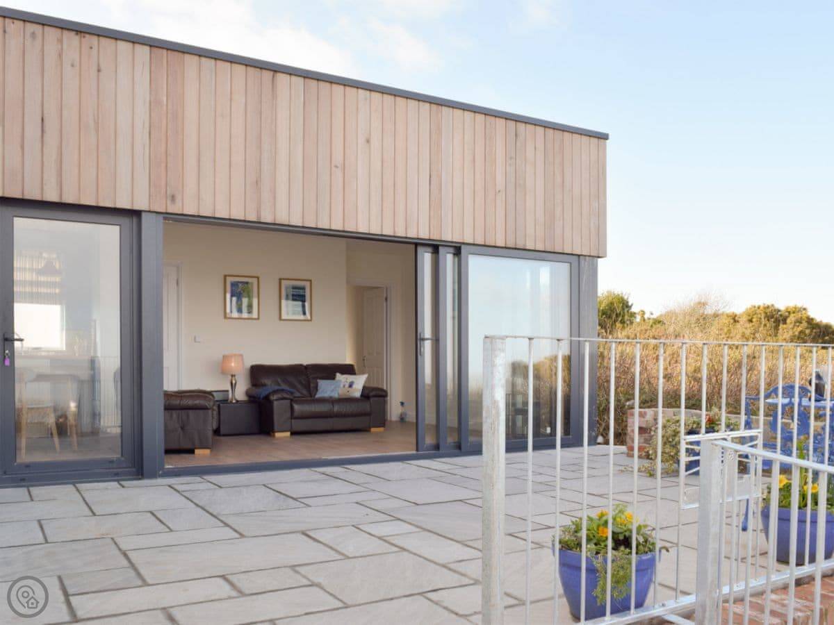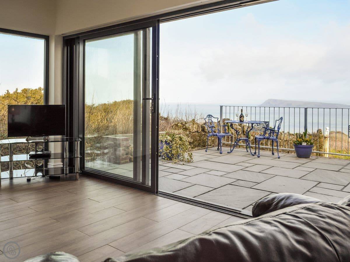 The main thing is the view. The whole front of the living area is glass, looking straight out over Fishguard Bay. You can see Dinas Head and, on a very clear day, Snowdon in the distance. The cottage is up on the hill, so the view is completely open.
