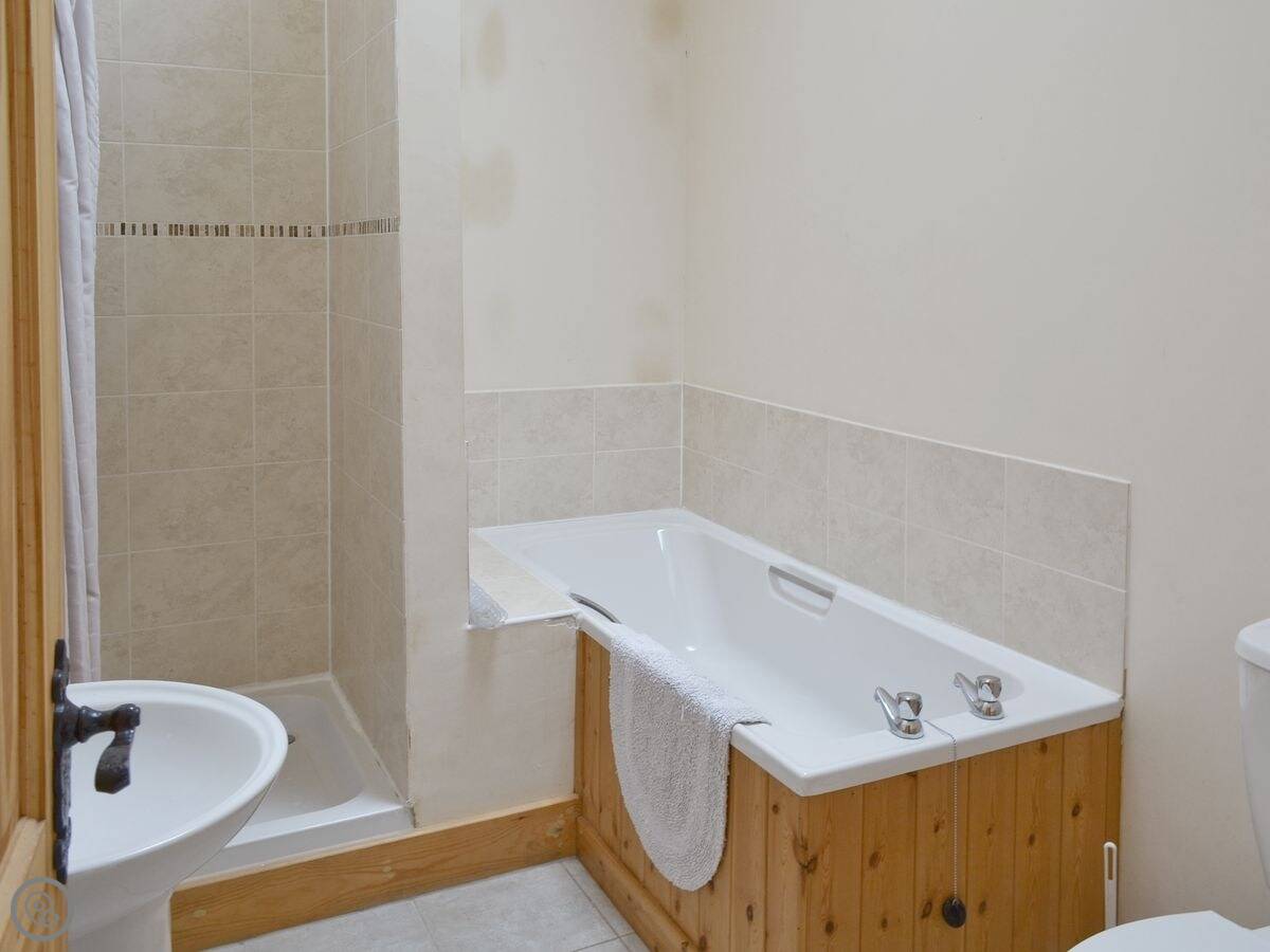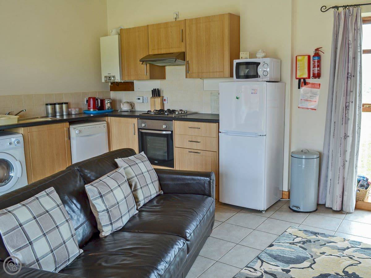 It sleeps four. Two bedrooms, one bathroom. It’s a 4 Star place, so it’s comfortable and well looked after. There's underfloor heating downstairs, which is good, and the ceilings are high with some beams showing.