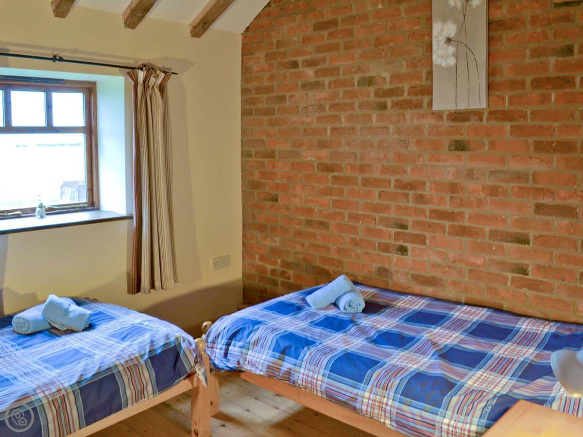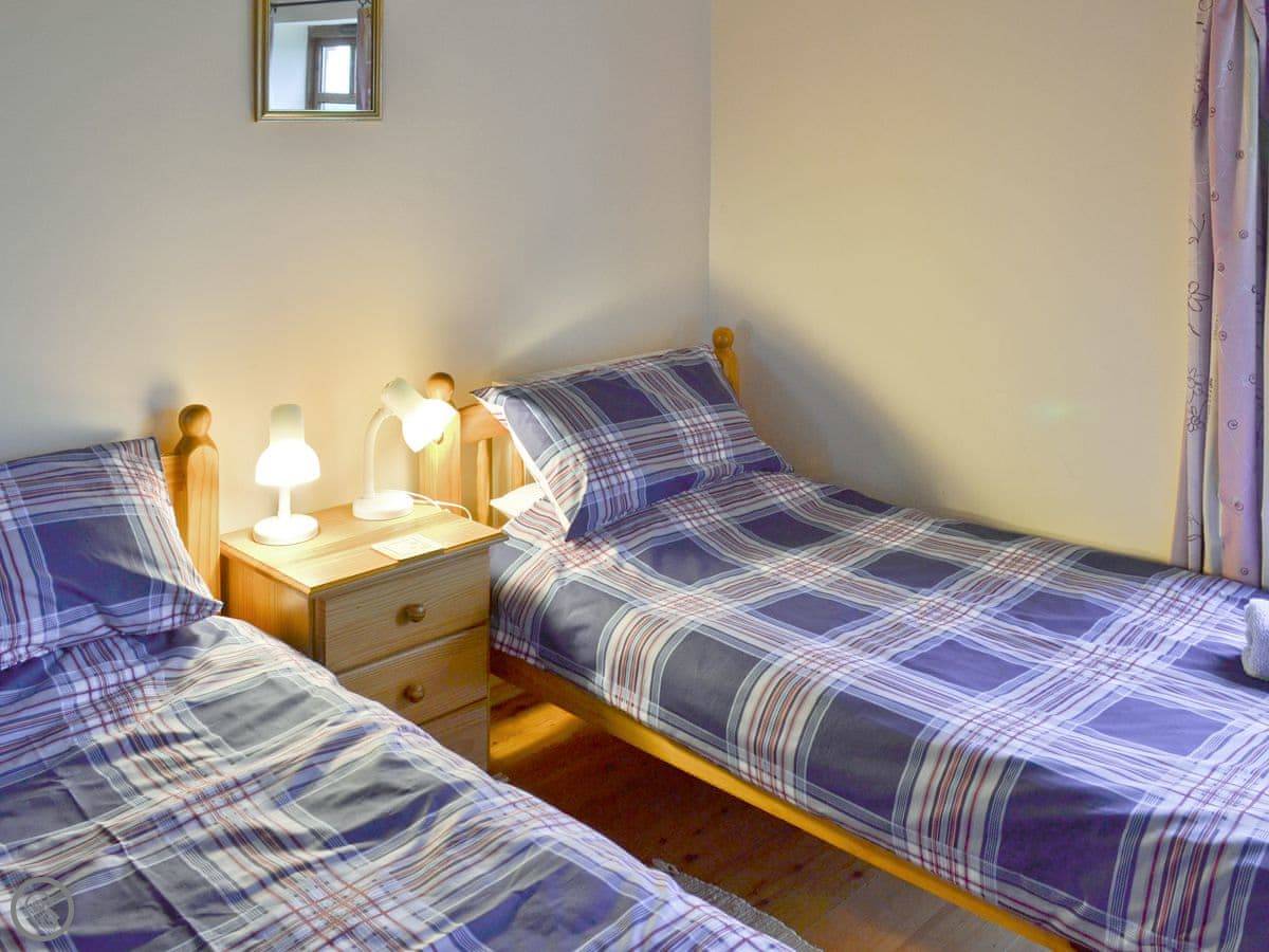 Inside, it sleeps six. Three bedrooms and two bathrooms, which is handy. It's got underfloor heating downstairs, so it's warm. You can see the original beams and stonework. It's a 4 Star place, so it's comfortable and well kept.